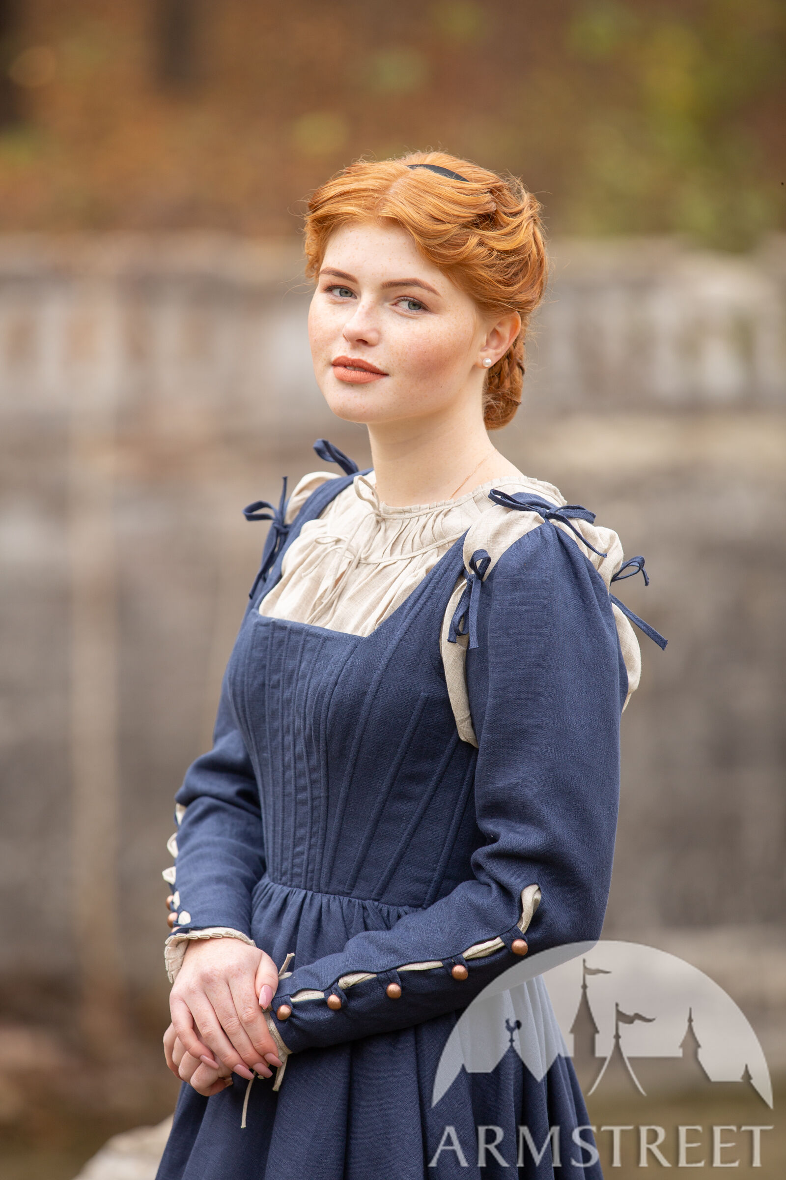 Traditionnellement cette robe se portait avec une chemise puisque le buste est assez ouvert. L’encolure carrée et le corsage à baleines se complètent pour mettre en valeur la taille fine et le buste haut qui sont surtout séduisants à côté de la jupe ample qui tombent jusqu’au sol. Les manches sont ajustées au poignet d’une manière très élégante et les boutons créent un contraste à côté du tissu de la robe et de la chemise ou autre sous-vêtement. Comme les manches sont détachables c’est à vous de choisir de porter votre kirtle avec ou sans manches.