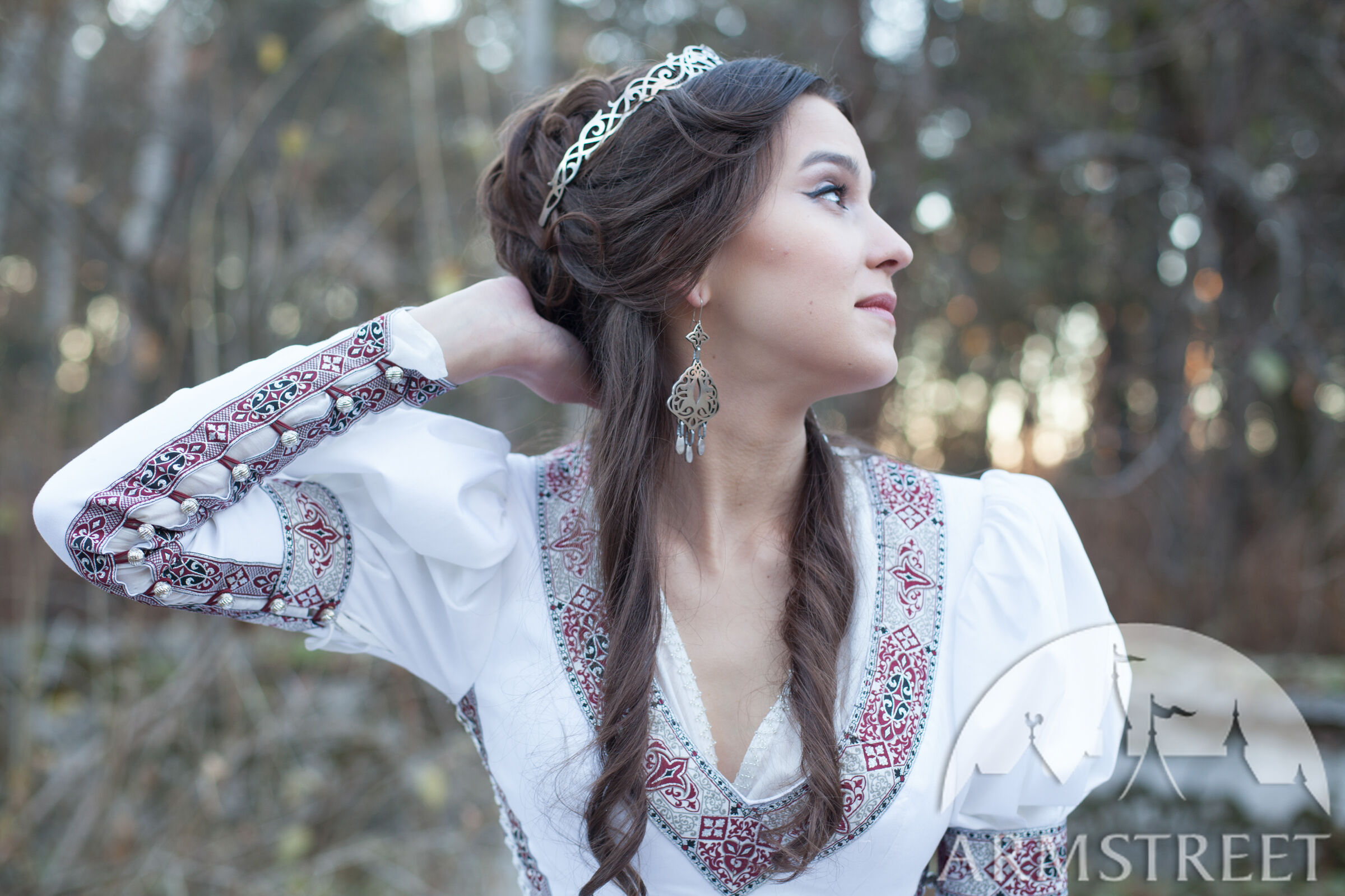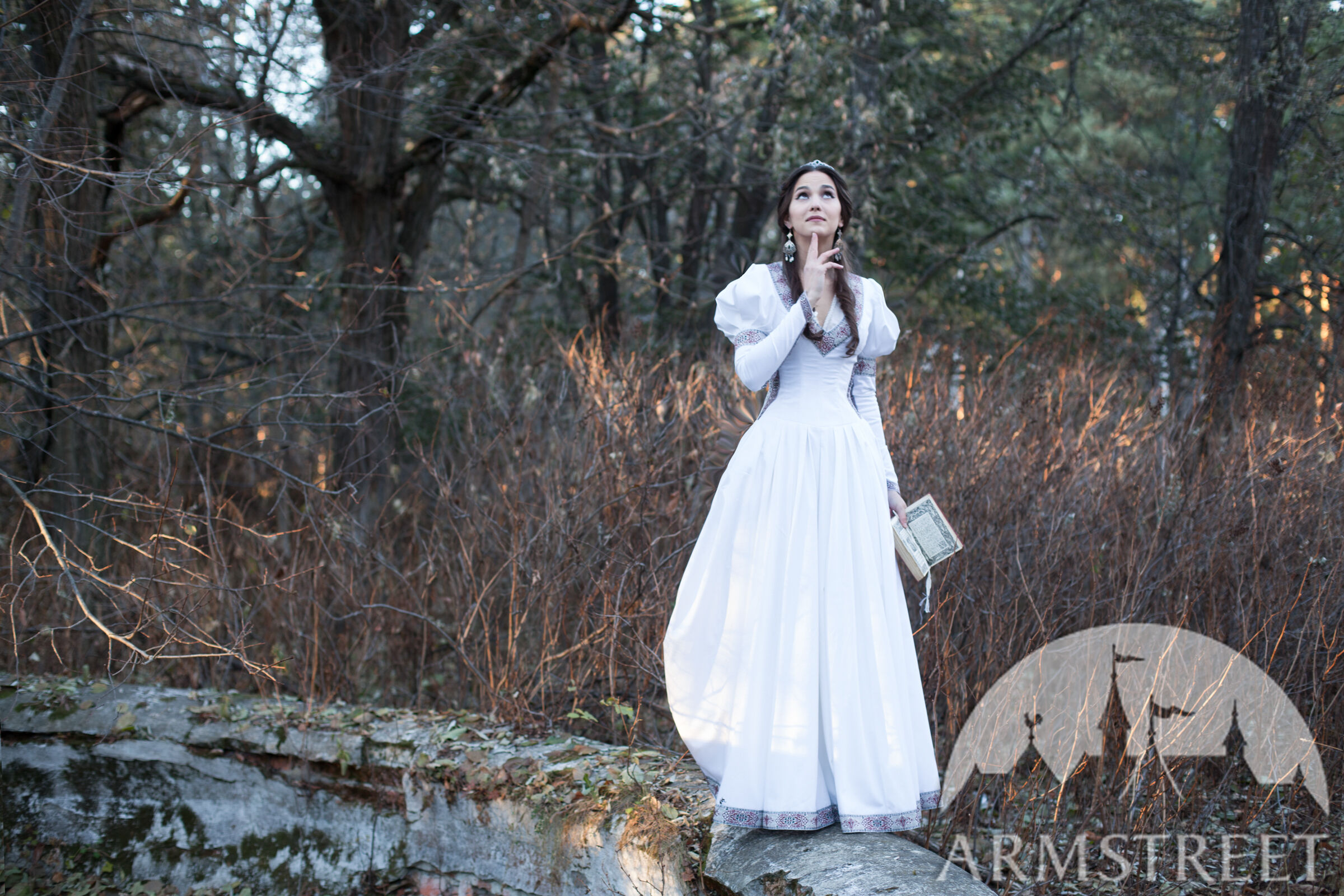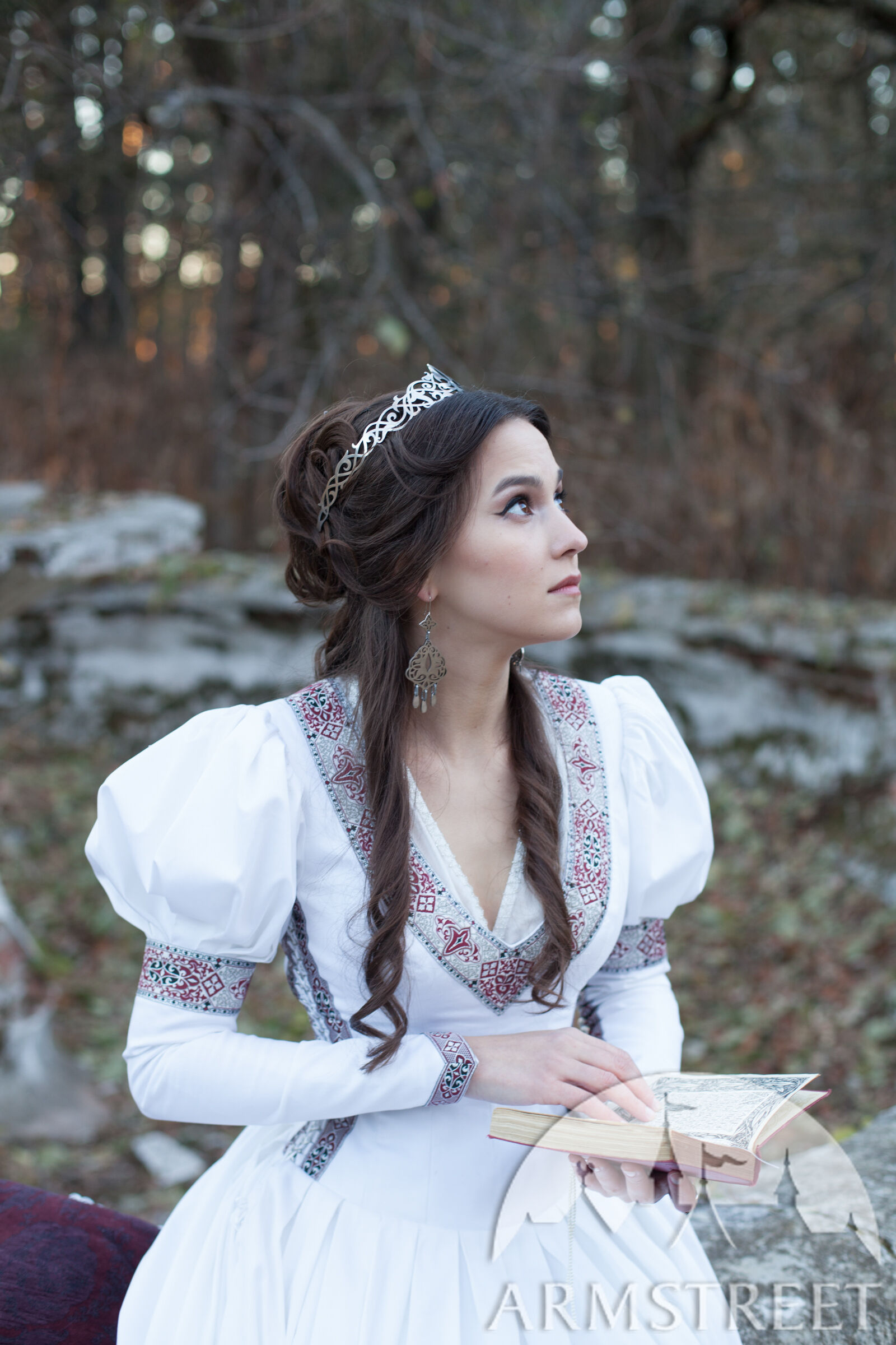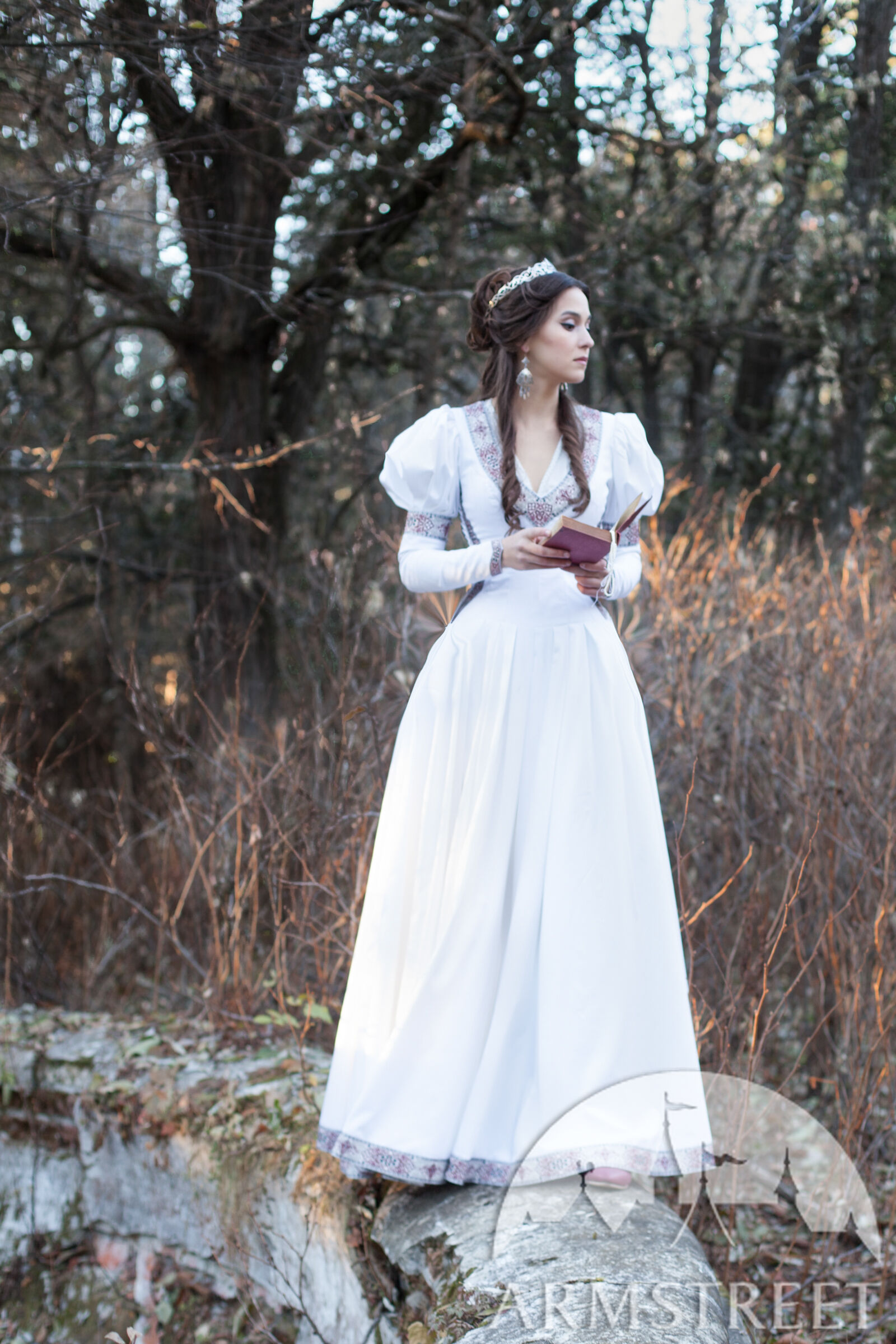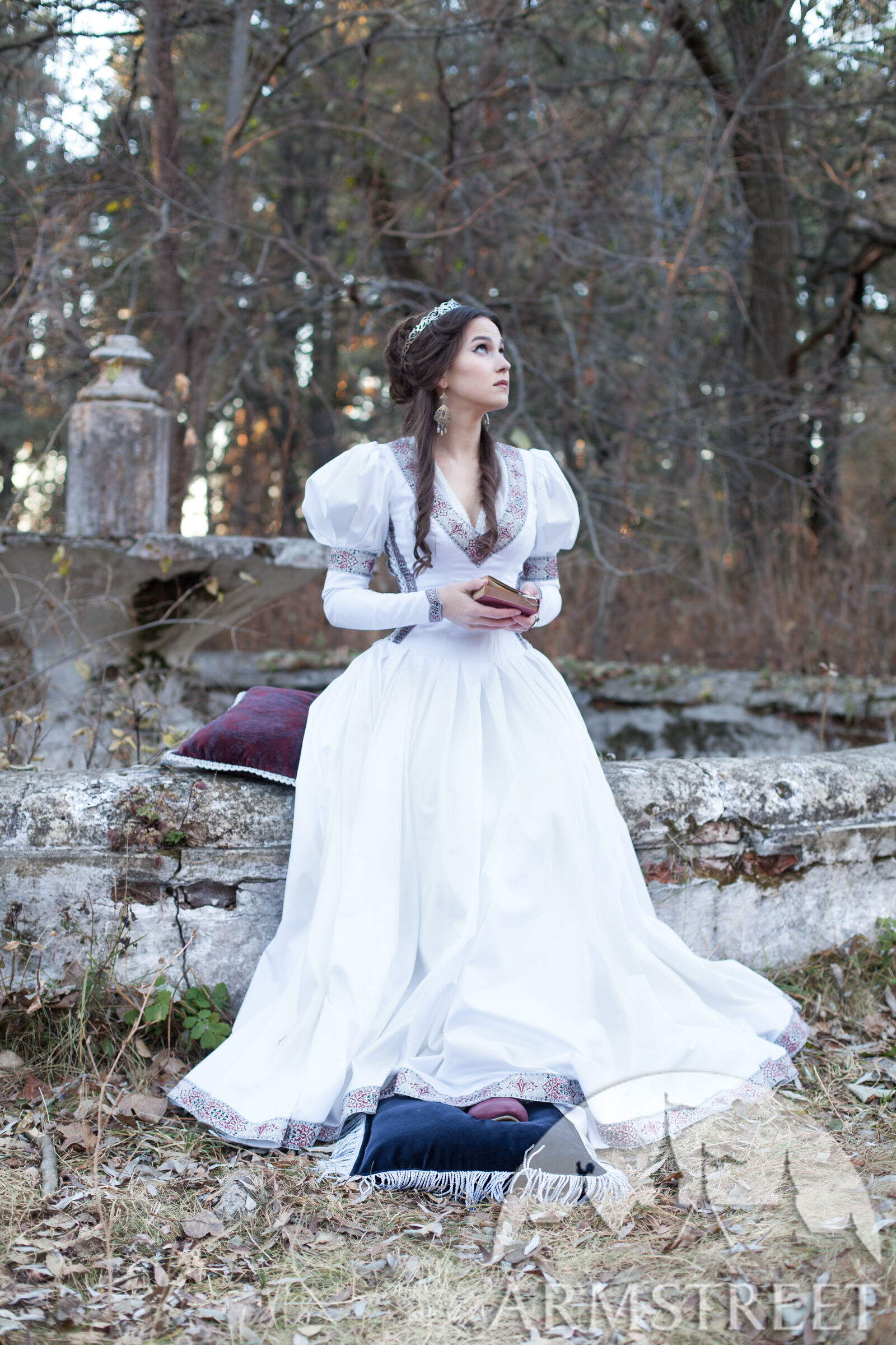 La version blanche originale de la robe est faite de coton mince italien de haute qualité. Elle a de corsage serré et slim et bouffées amples sur les manches pour libérer vos mouvements. Les manchettes sont élèves et près du corps pour exposer la beauté de vos bras et poignets tandis que la jupe est large et lourde. Elle est drapée dans les plis pour convenir à l’équitation ou de longues promenades (évidemment main dans la main avec votre Prince). La garniture unique avec ornement mauritanien complète le look élégant et le style de cette robe. Corsage est épaissie avec couche supplémentaire de tissu et a deux laçages latéraux pour le serrer et créer une ligne courbe entre le corsage et la jupe.