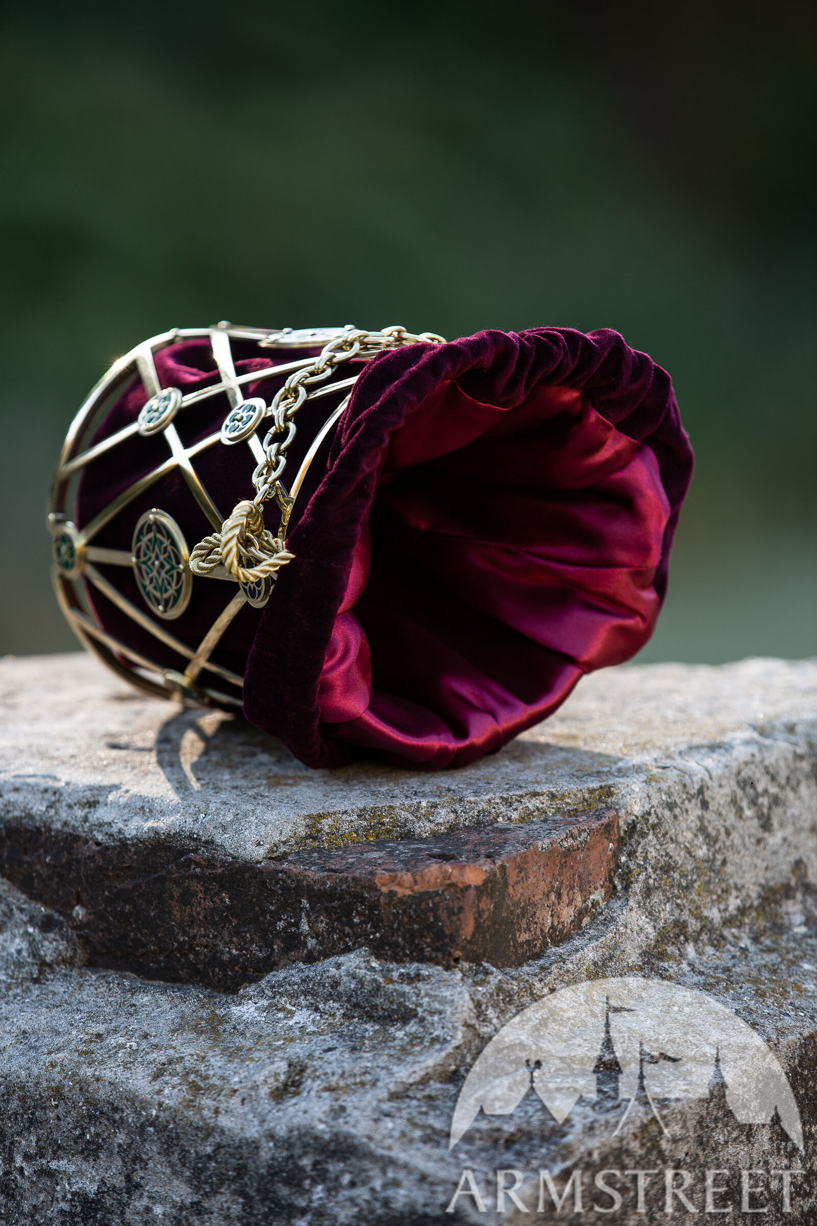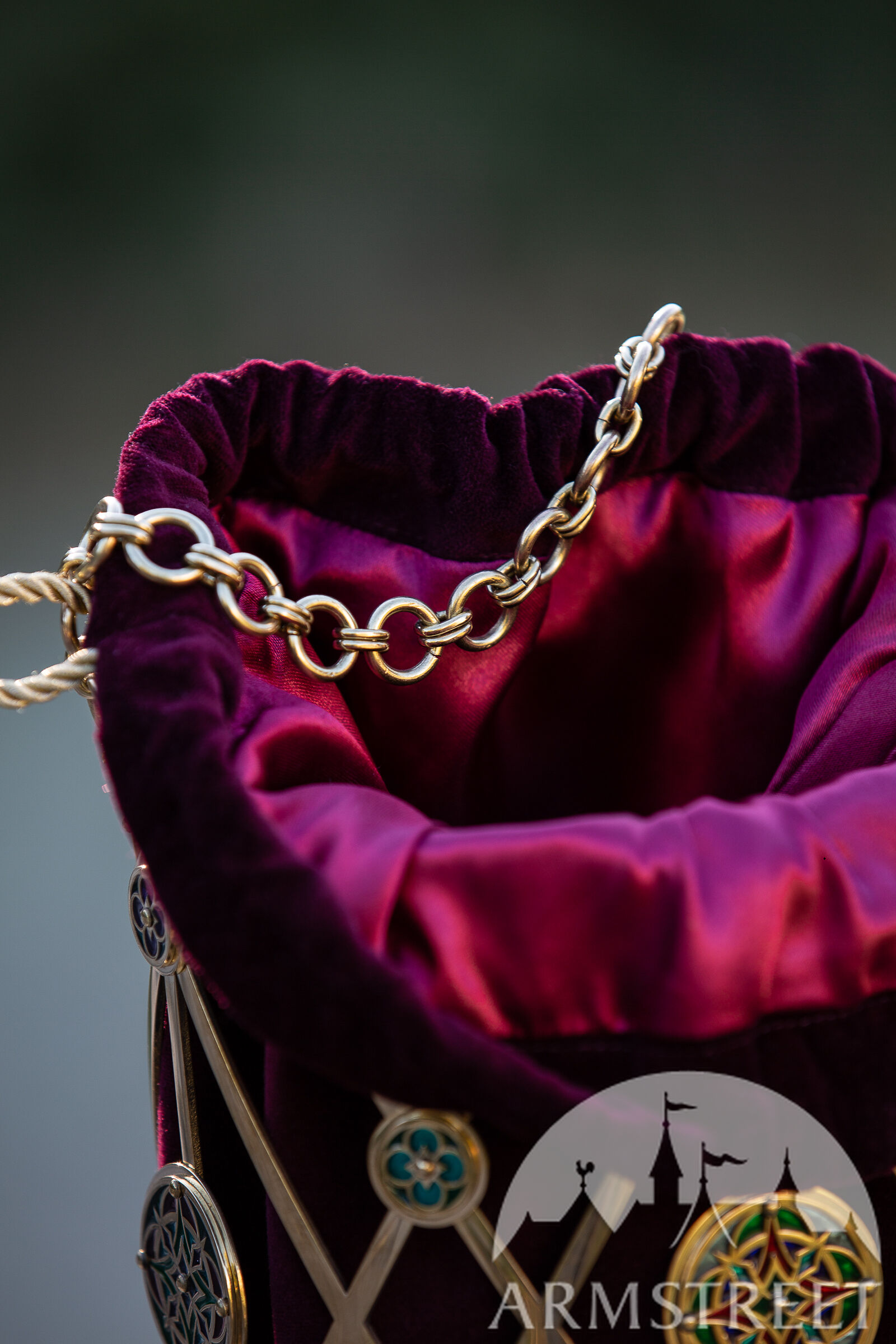 La partie extérieure ressemble à une sorte de cage qui est faite de laiton découpé au laser et roulé en forme cylindrique. À l’intérieur de ce panier filigrane il y a un magnifique sac en velours qui est serré à l’aide d’un cordon. L’aspect le plus précieux de ce sac est qu’il est indiciblement beau et en même temps assez fonctionnel et peut contenir toutes vos affaires personnelles. Le velours est très doux et agréable, c’est donc un endroit sûr pour mettre votre portable ou d’autres objets non-médiévaux que vous ne souhaitez pas montrer. Une chaîne robuste forme l’anse de ce sac (le cordon sert seulement pour fermer le sac, il n’est pas destiné à servir d’anse).