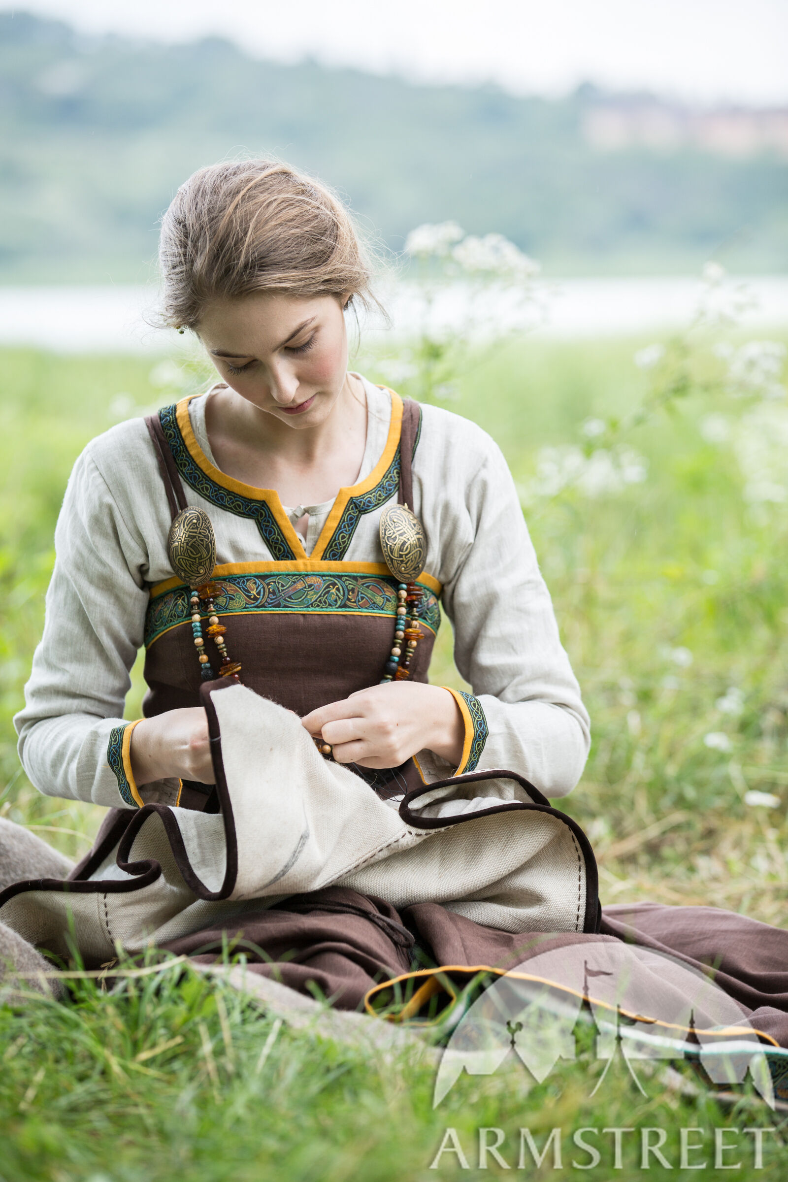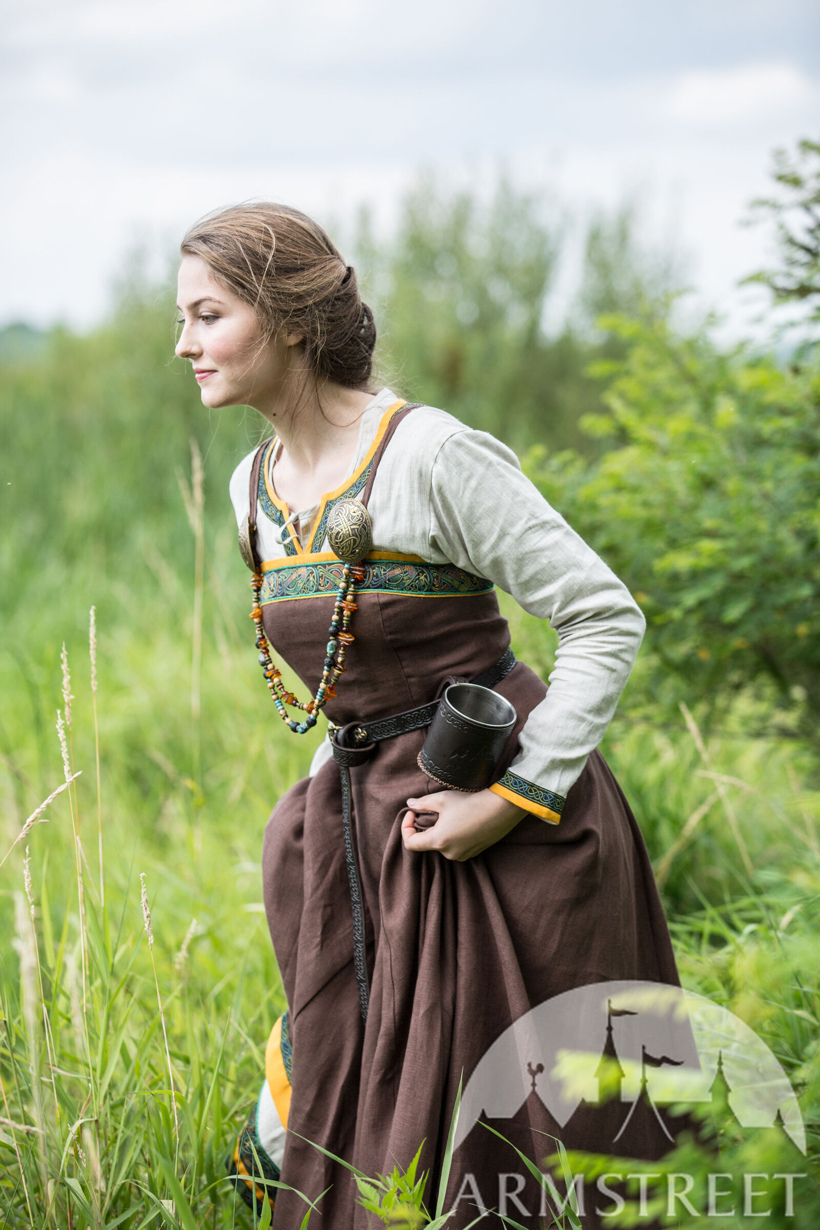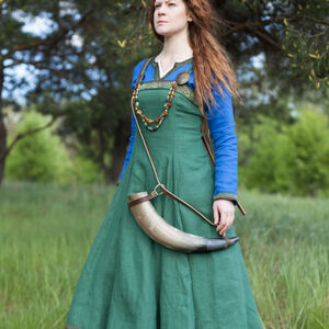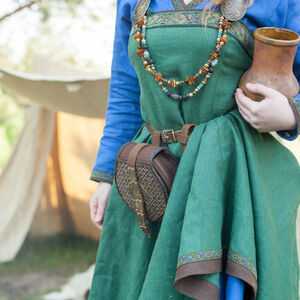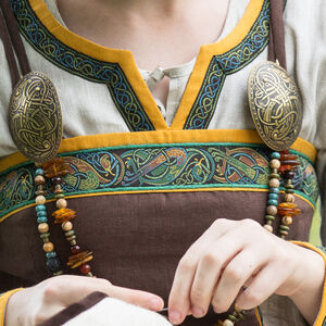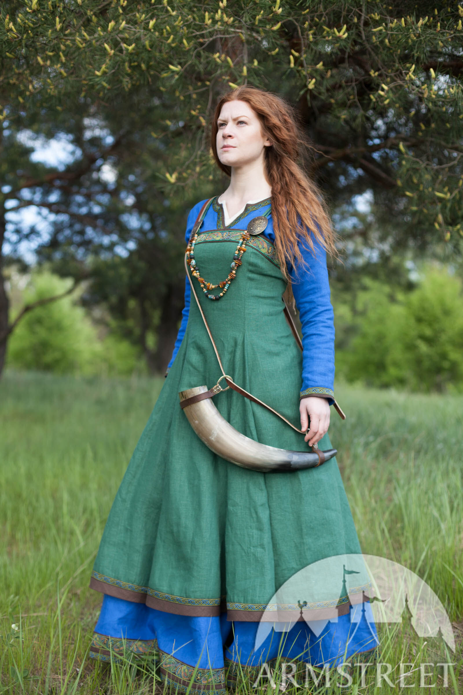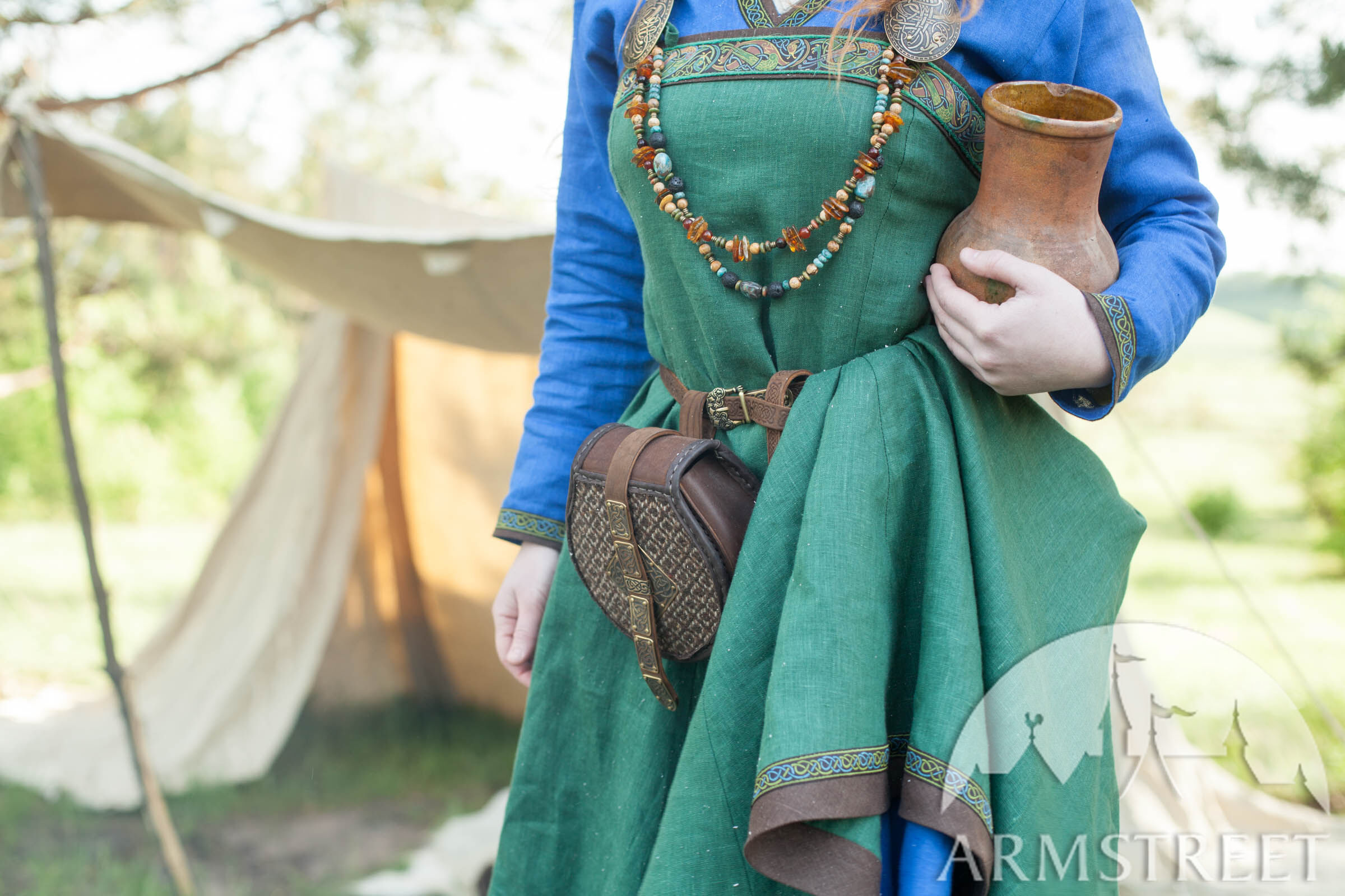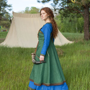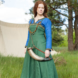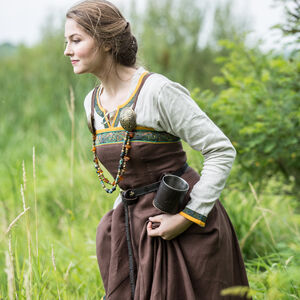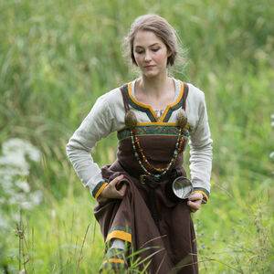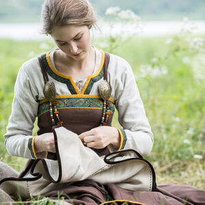 Un tablier est une partie reconnaissable et bien connue du costume des femmes vikings. Notre conception est basée sur la reconstruction de conceptions du port Hedeby et sur les illustrations par Shelagh Lewins. Nous avons modifié le modèle original et avons fait une jupe un peu plus large et avons fourni un meilleur ajustement.