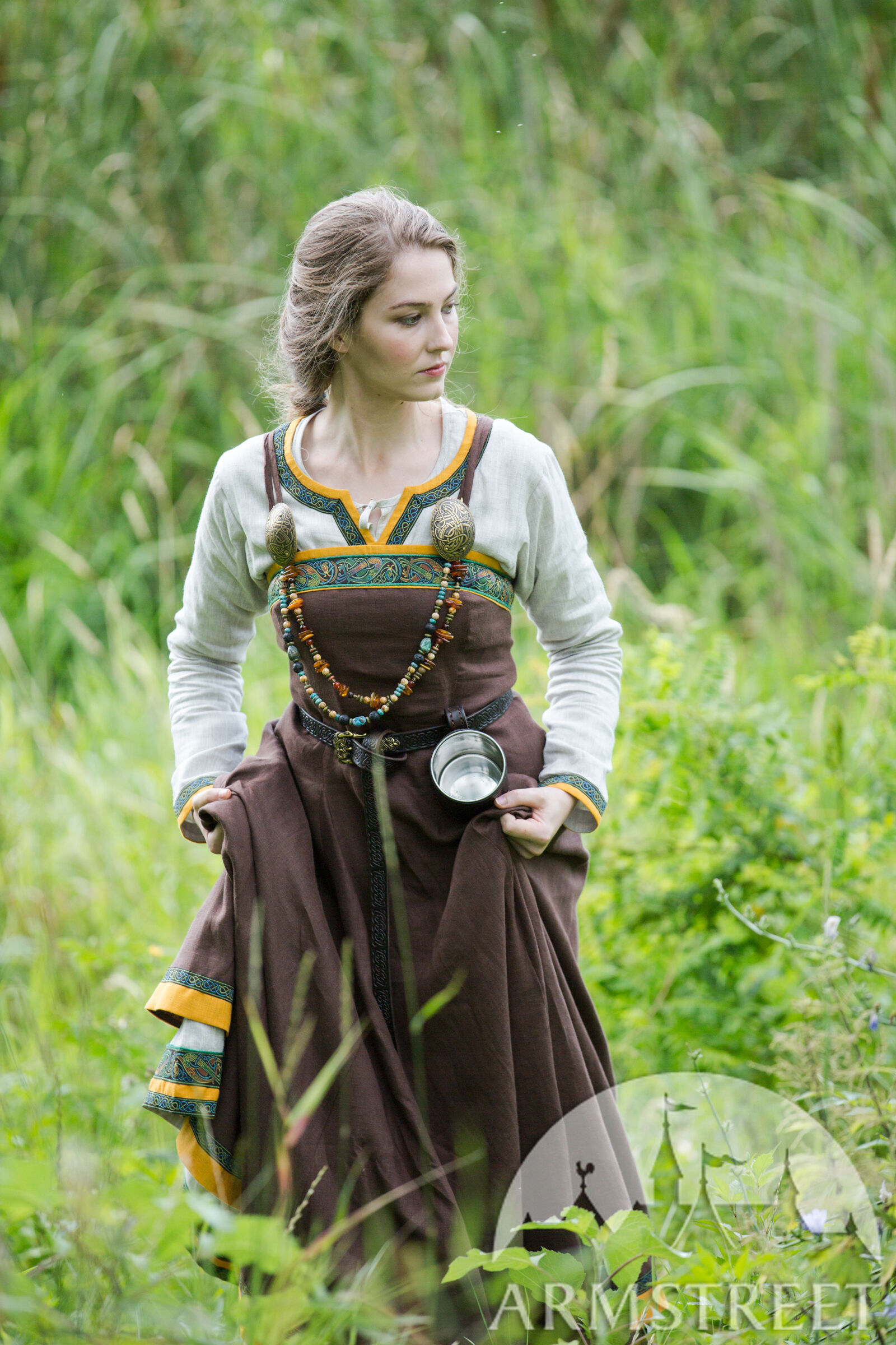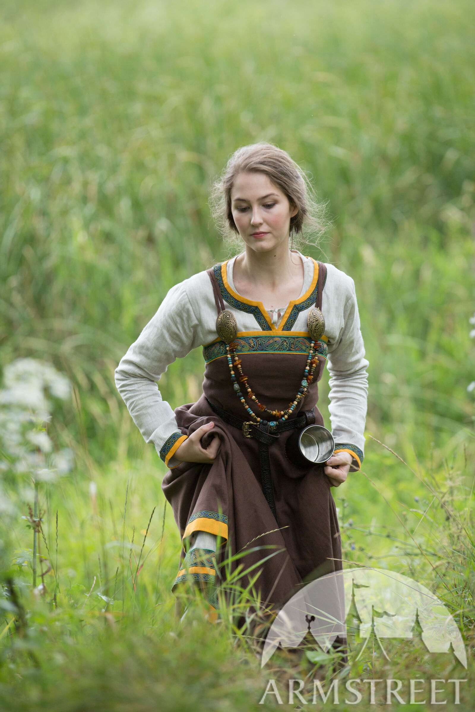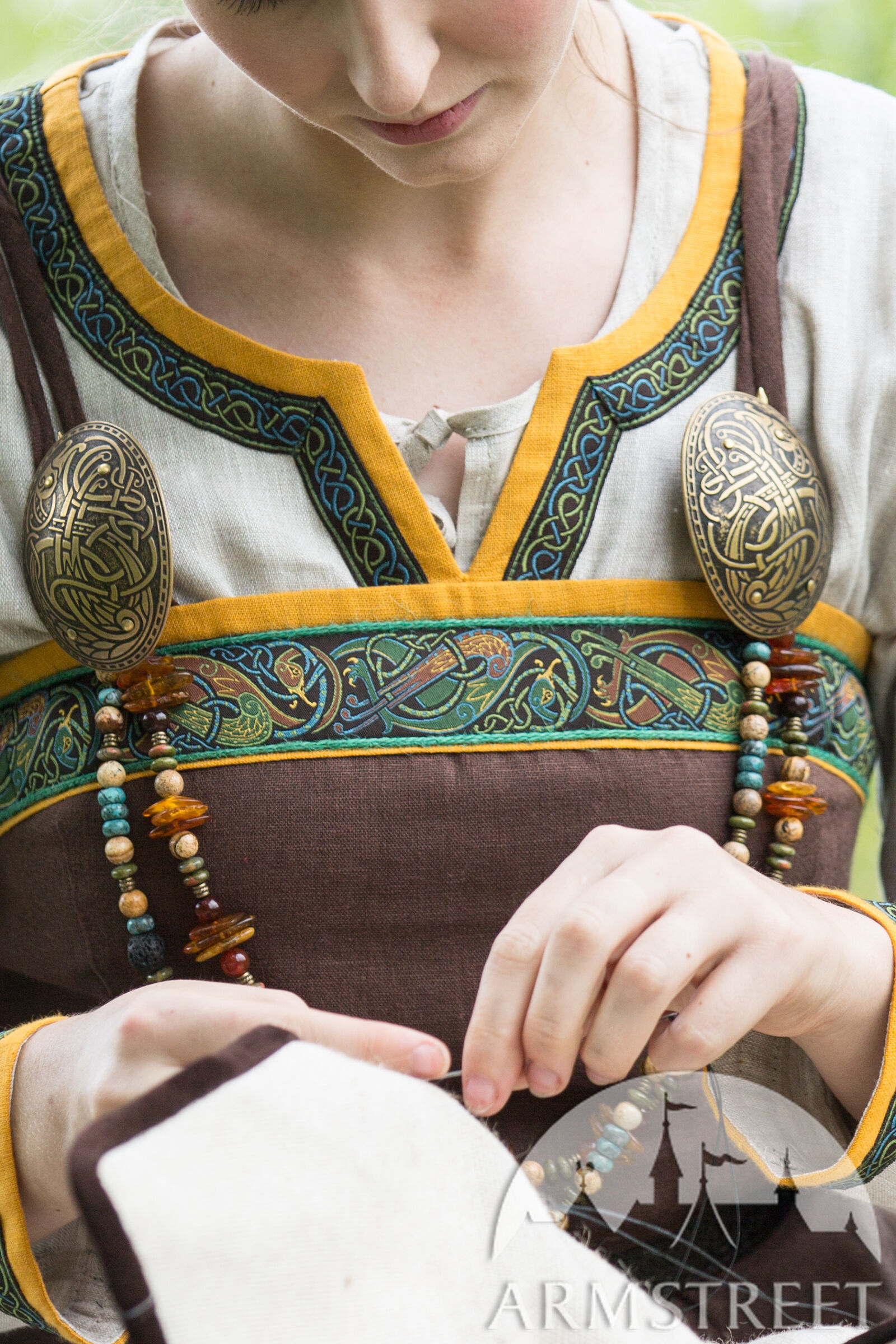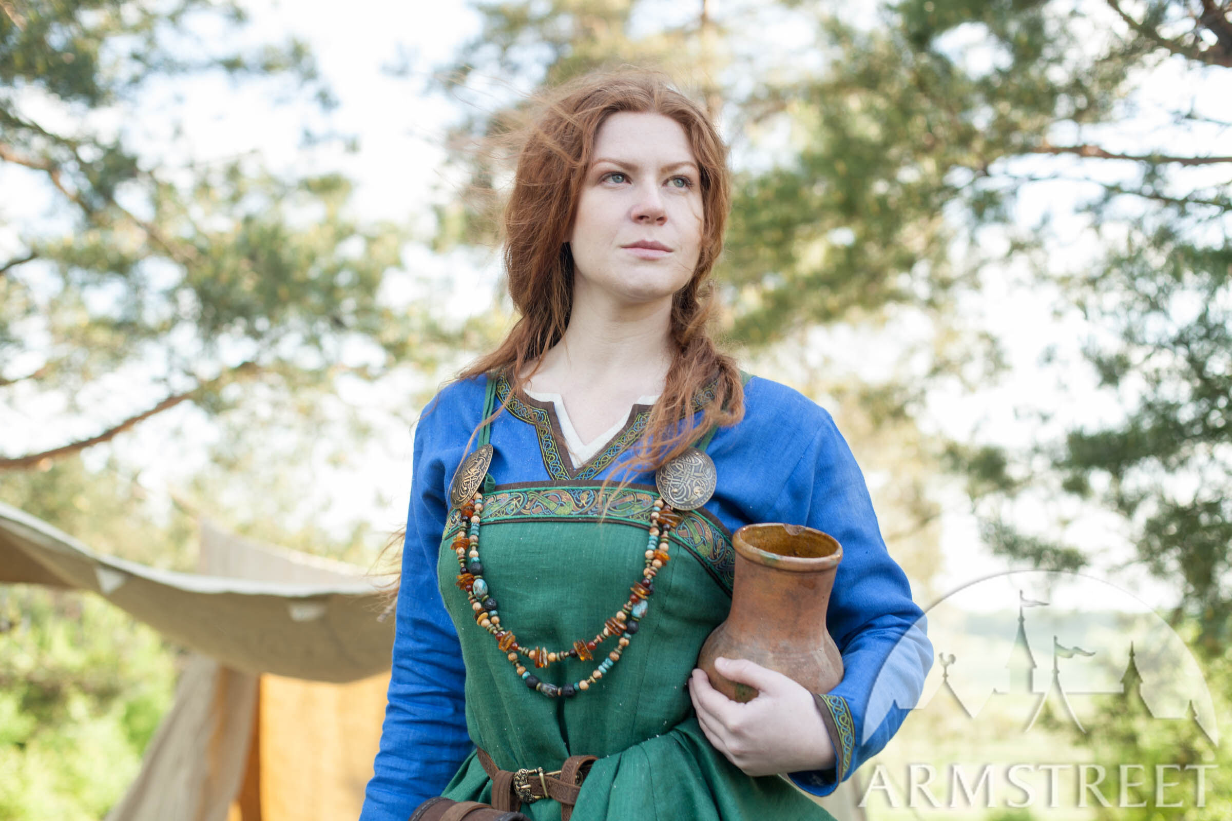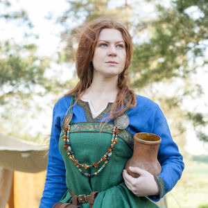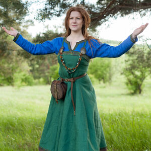 Un tablier est une partie reconnaissable et bien connue du costume des femmes vikings. Notre conception est basée sur la reconstruction de conceptions du port Hedeby et sur les illustrations par Shelagh Lewins. Nous avons modifié le modèle original et avons fait une jupe un peu plus large et avons fourni un meilleur ajustement.