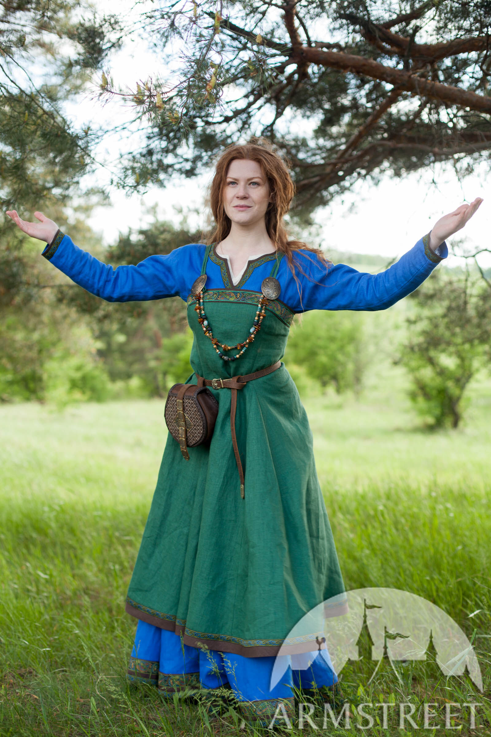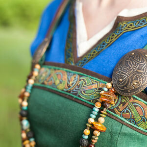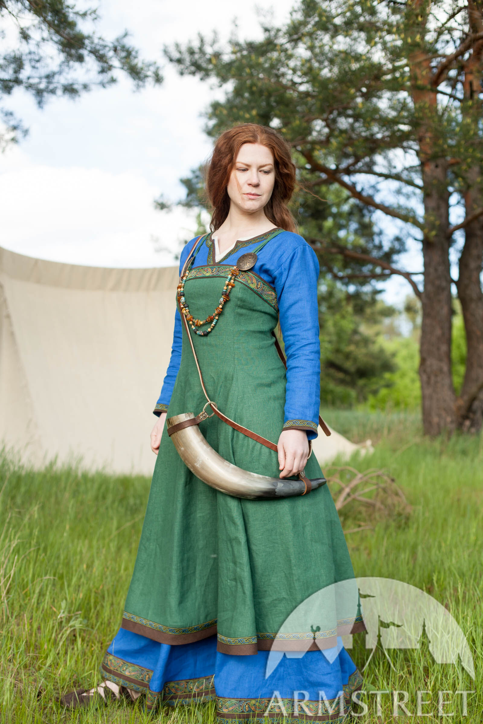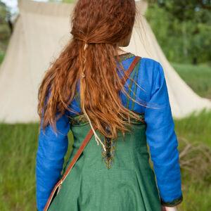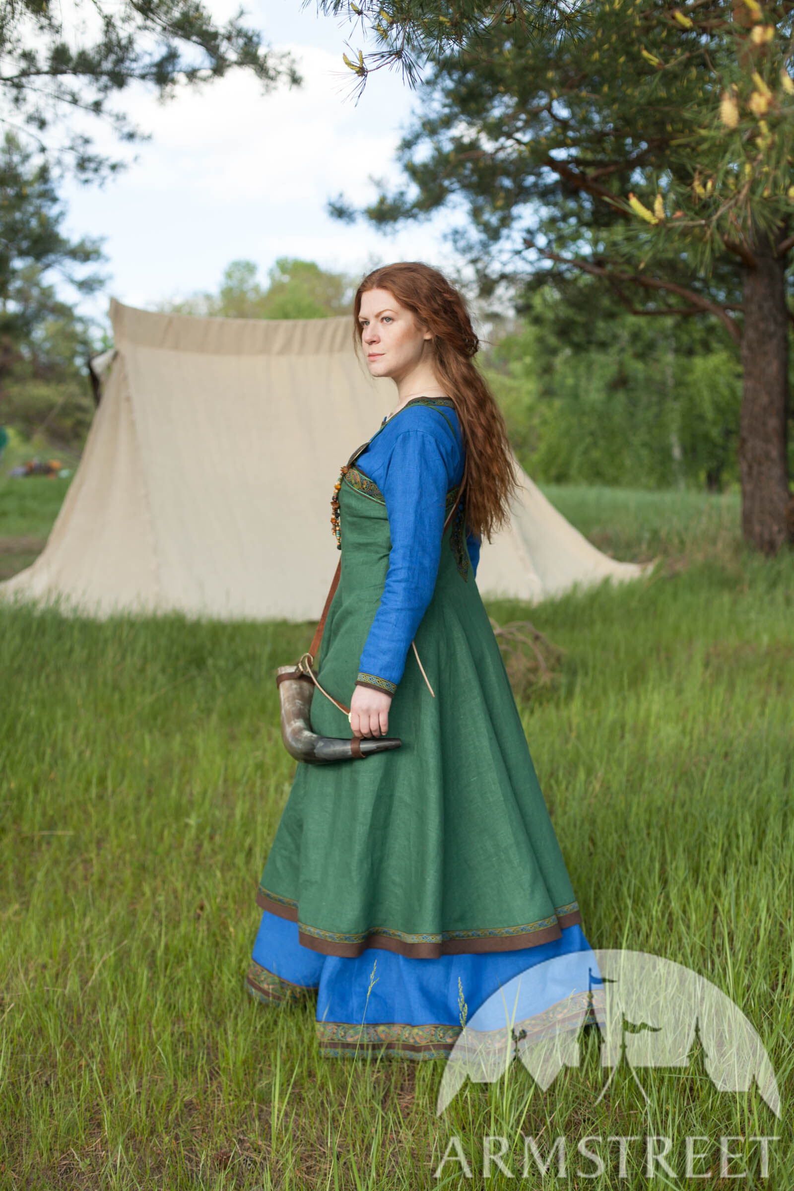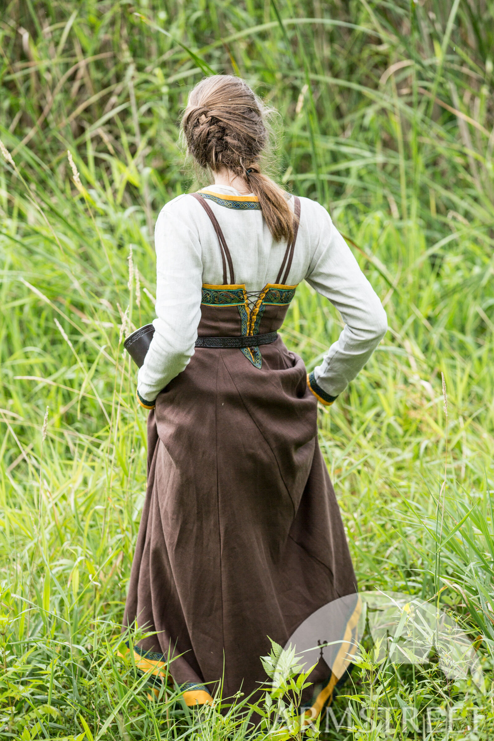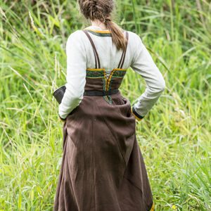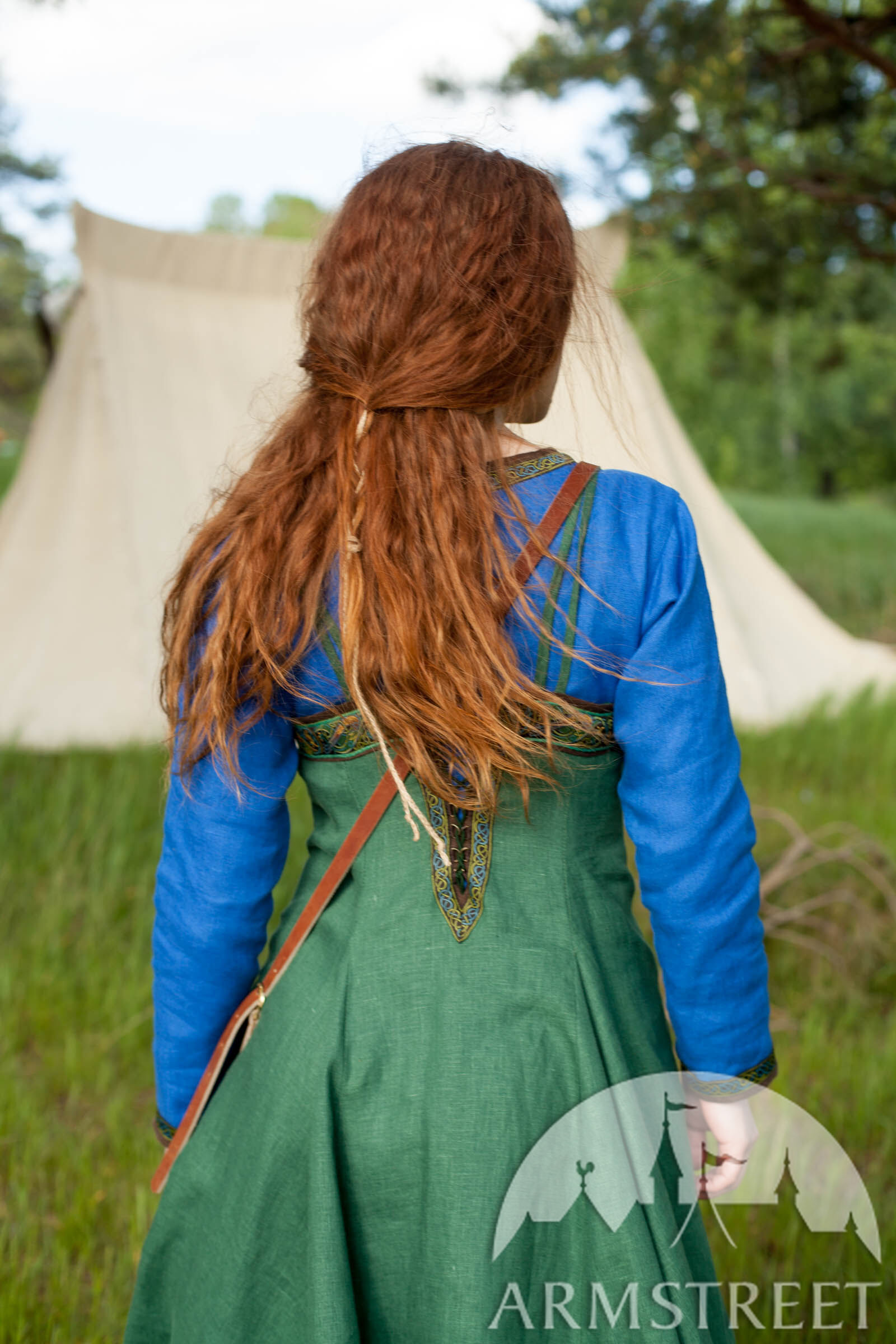 Un tablier est une partie reconnaissable et bien connue du costume des femmes vikings. Notre conception est basée sur la reconstruction de conceptions du port Hedeby et sur les illustrations par Shelagh Lewins. Nous avons modifié le modèle original et avons fait une jupe un peu plus large et avons fourni un meilleur ajustement.