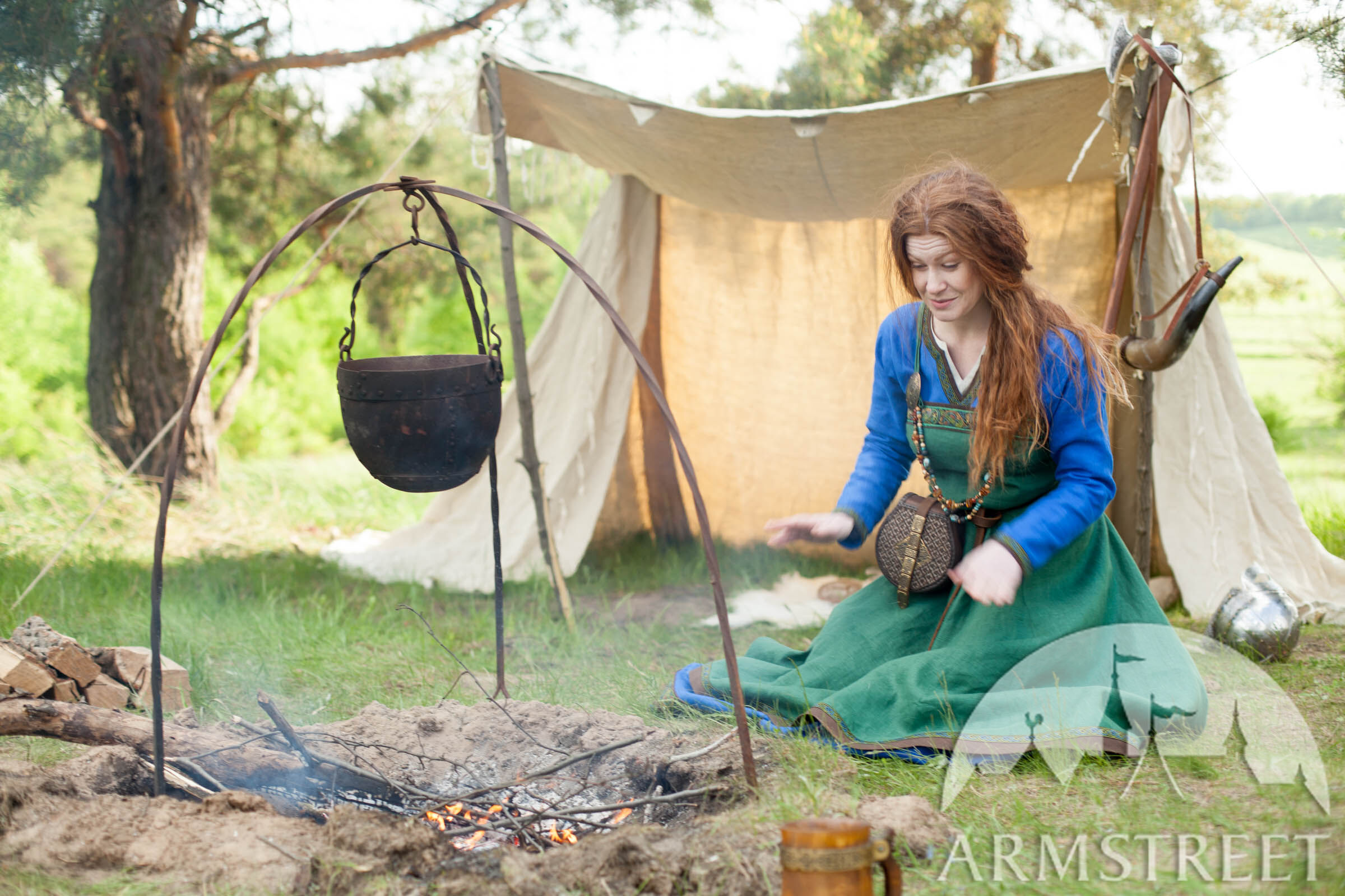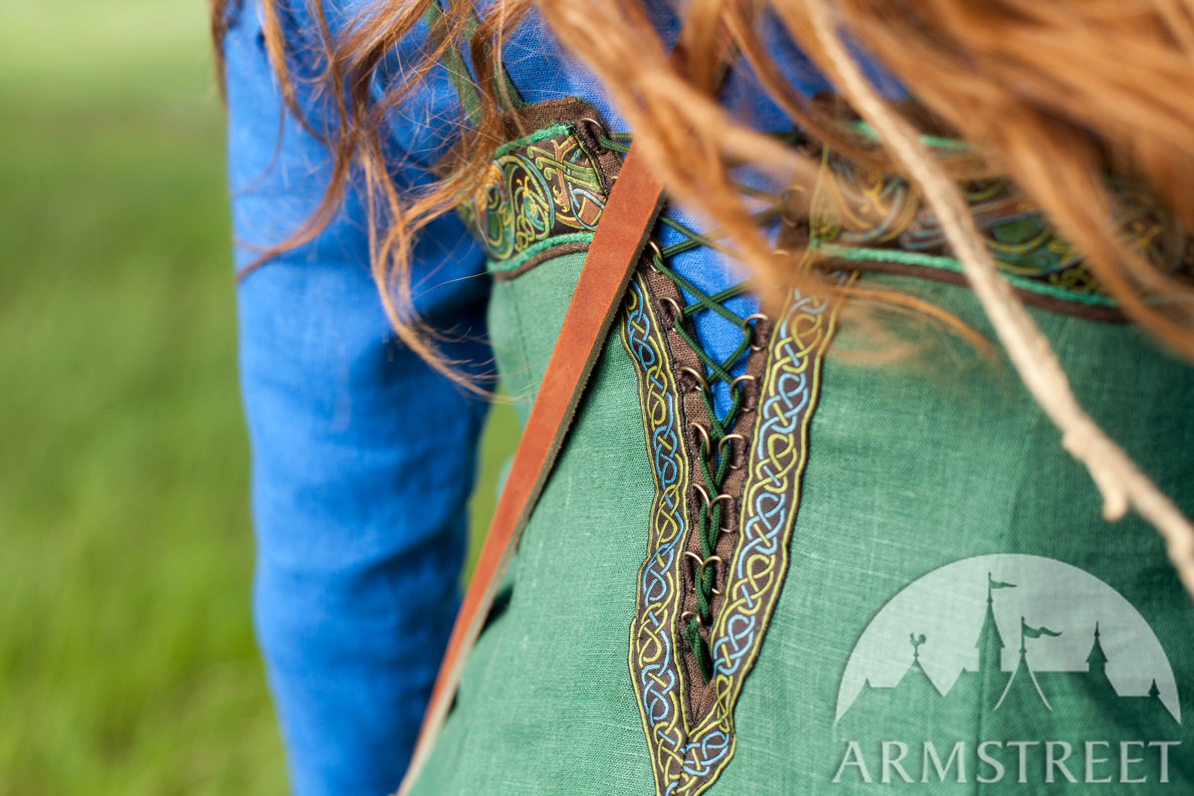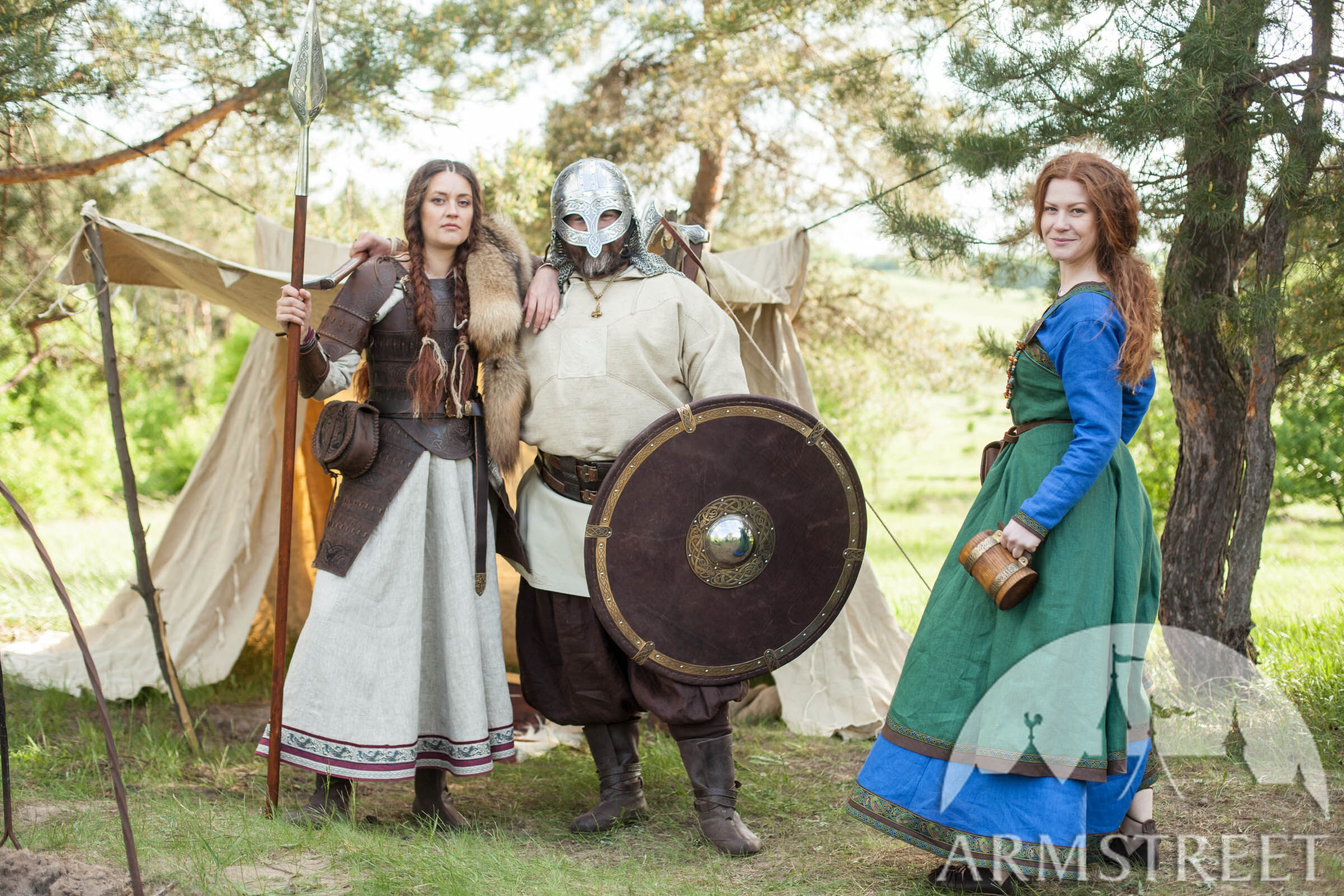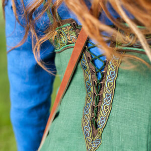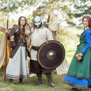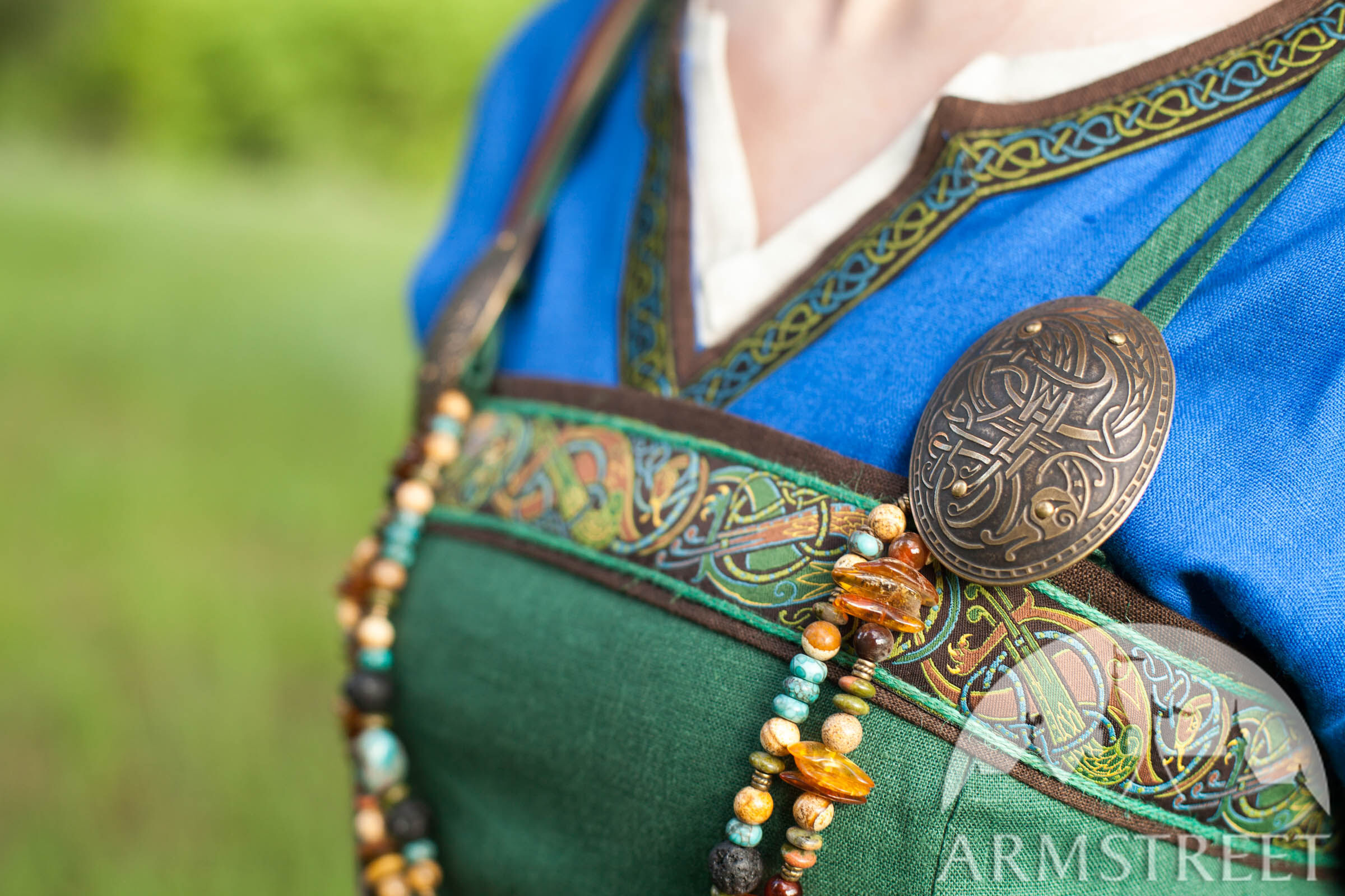 Un tablier est une partie reconnaissable et bien connue du costume des femmes vikings. Notre conception est basée sur la reconstruction de conceptions du port Hedeby et sur les illustrations par Shelagh Lewins. Nous avons modifié le modèle original et avons fait une jupe un peu plus large et avons fourni un meilleur ajustement.