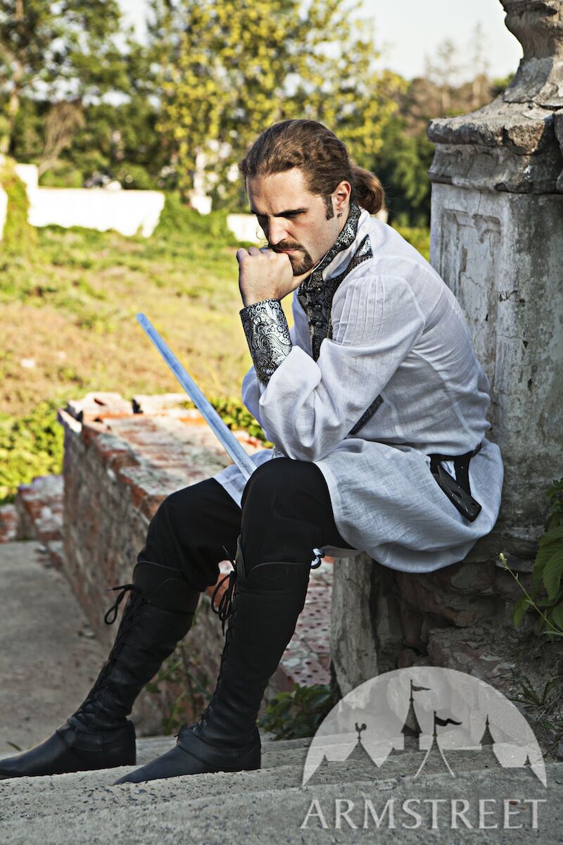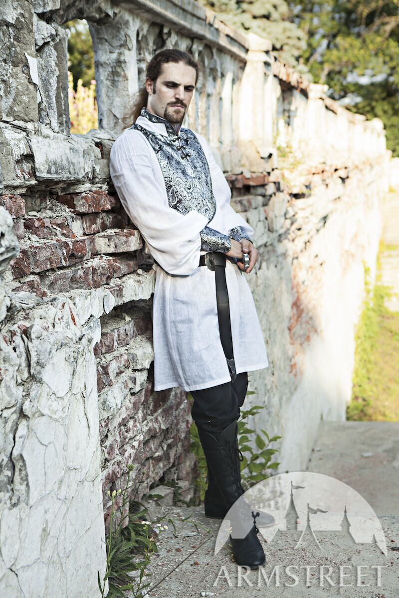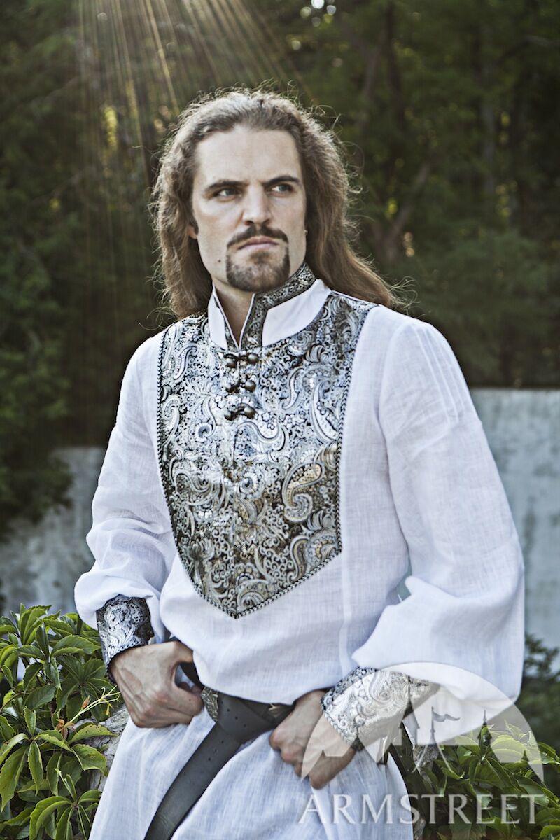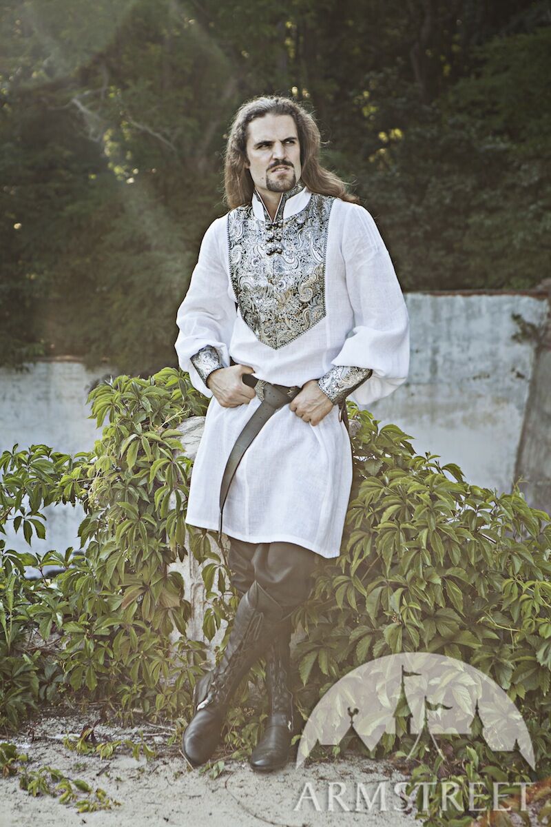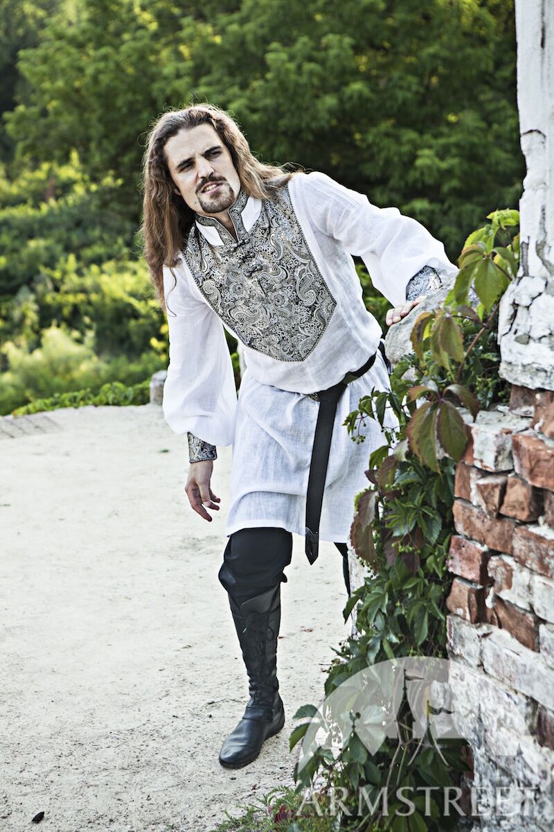 Le lin fin utilisé pour cette tunique est un léger tissu formidable, tout à fait authentique pour cette époque et ce qui n’est pas moins important fournit une excellente protection contre la chaleur du soleil et contre la fraîcheur. Au Moyen Âge rares étaient ceux qui pouvaient se permettre le luxe de porter une tenue de blancheur de neige et jusqu’ici cette couleur marque l’importance et la pureté du moment. Les accents de brocart luxueux au motif sophistiqué sur la poitrine et les manchettes sont bordés de galon précieux de couleur assortie et complétés d’un large passement sur le col montant. Nous proposons le surcot assorti, les pantalons médiévaux et les bottes hautes comme complément digne pour cette tenue. Pour créer un look harmonieux vous pouvez assortir cette chemise de marié avec la robe de mariage « Reine Échiquéenne ».