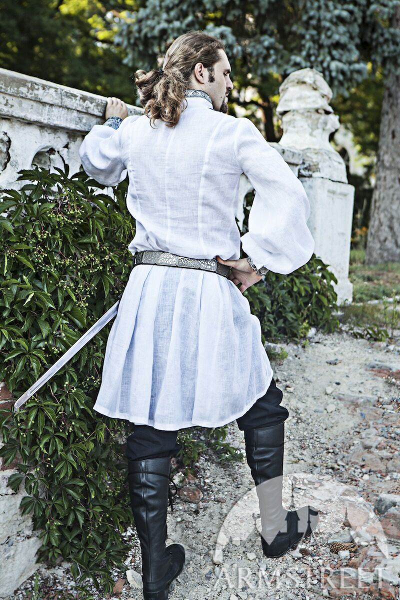 Nous présentons ici une version de mariage exclusive de notre tunique d’homme style médiéval. Inspirée initialement par le costume de l’Europe orientale cette coupe convient à un grand nombre de personnages. La tunique se distingue par un col montant et une encolure boutonnée. Les manches amples drapent d’une manière poétique à chaque mouvement sans causer d’inconvénients grâce à une coupe bien réfléchie et les manchettes larges. La longueur mi-cuisse suppose de porter la tunique ceinturée alors nous vous invitons à jeter un coup d’œil à la ceinture fantastique aux décorations argentées.