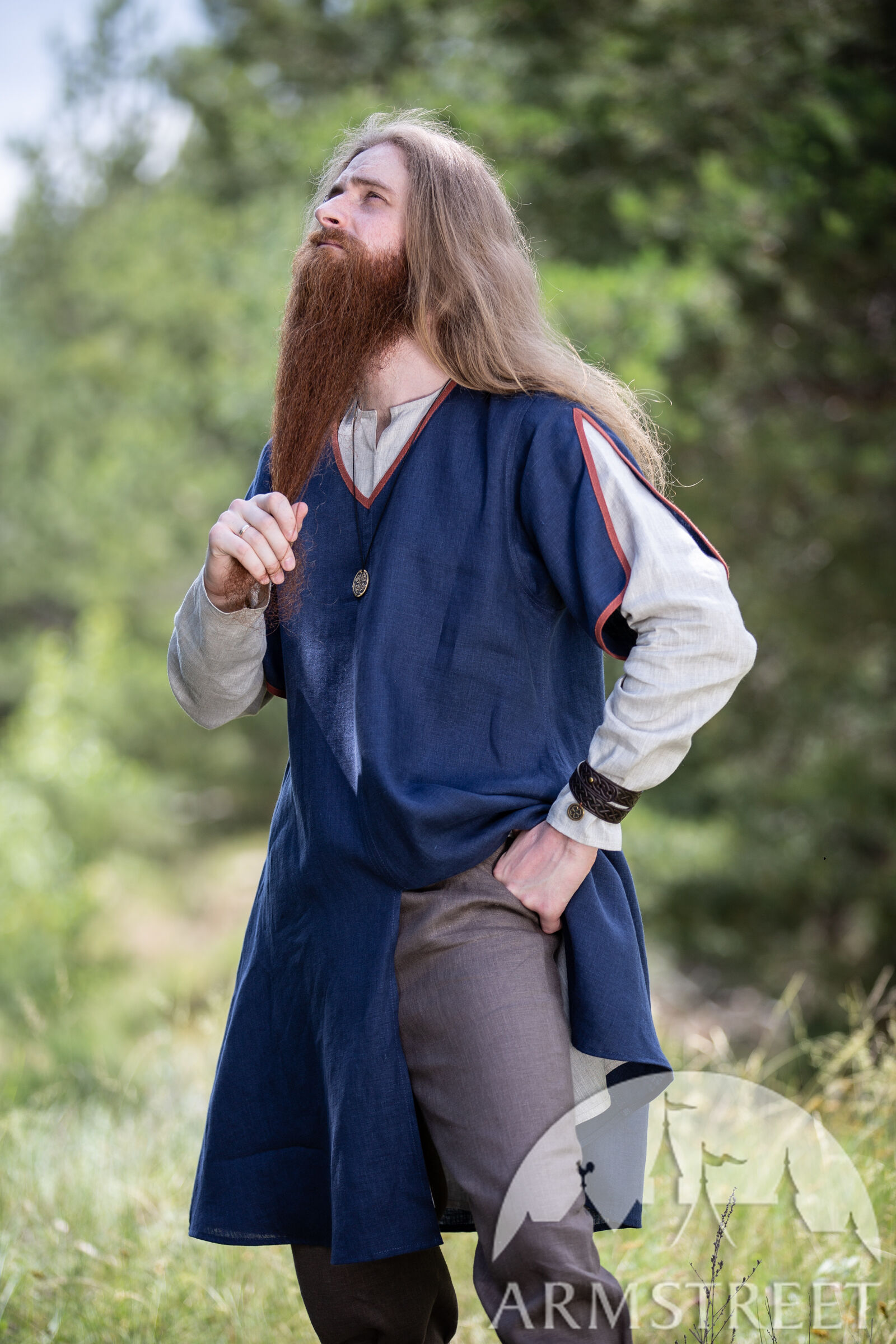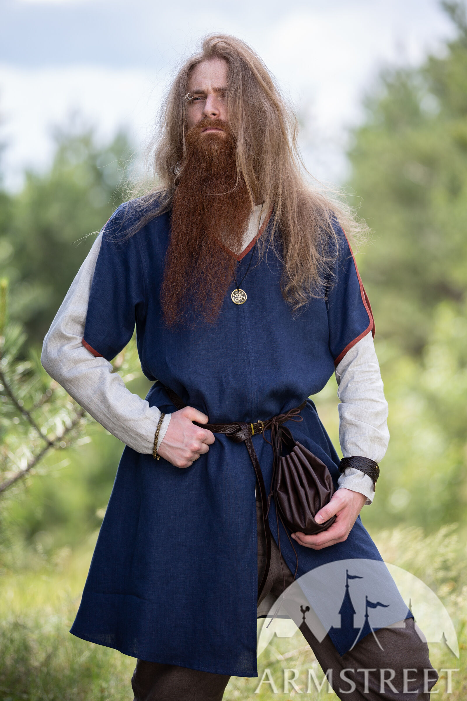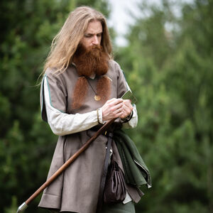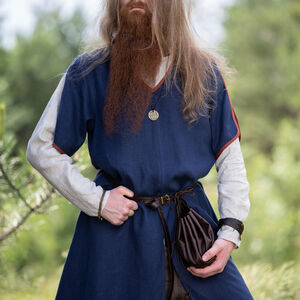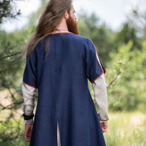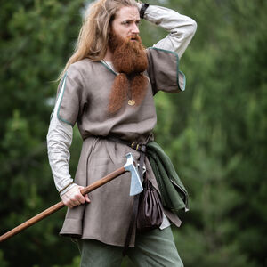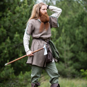 Quoi qu’il en soit cette tunique est un habit universel du début du moyen âge pour hommes. Avec ses accents décoratifs et la possibilité de la combiner avec les autres tuniques elle vous permet de former un costume formidable avec une chemise, une ceinture et d’autres accessoires. C’est aussi le genre de tunique qu’on portait dans la vie quotidienne pour toutes sortes de tâches et d’activités comme le jardinnage, la chasse et la guerre. « Ulf le Guetteur » y convient merveilleusement !