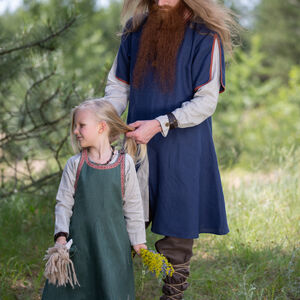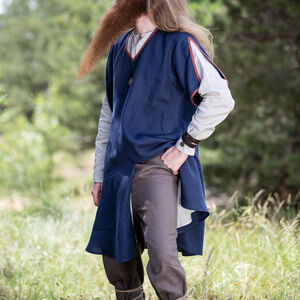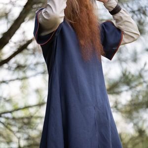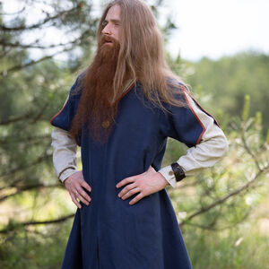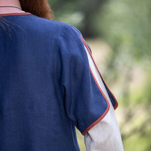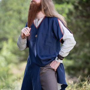 Nous ainsi que nos clients avions aussi besoin d’une collection médiévale « basique » – les tenues qui se rapportent au Haut Moyen Ȃge de même que notre collection « Viking » se rapporte aux costumes et armures scandinaves. Cette tunique a nettement une silhouette de XI-XII s. Sa grande encolure en forme de V et ses manches courtes lui permettent de fonctionner comme une tunique autonome ou d’être portée par-dessus une chemise plus légère. Les manches courtes avec les fentes profondes vont rendre votre journée plus agréable si celle-ci est chaude. La bordure en tissu simple va souligner que vous n’êtes pas si simple que ça et que vous ne portez pas le costume le plus basique. En même temps cette tunique ne sera pas trop criarde et déplacée. Optionnellement vous pouvez choisir de réaliser les bords en même tissu que toute la tunique ainsi elle sera encore plus modeste.