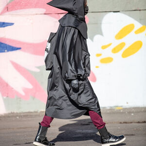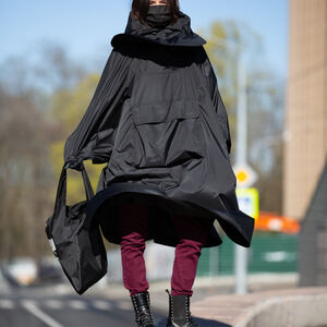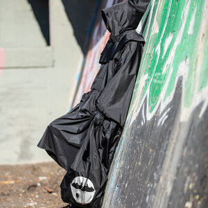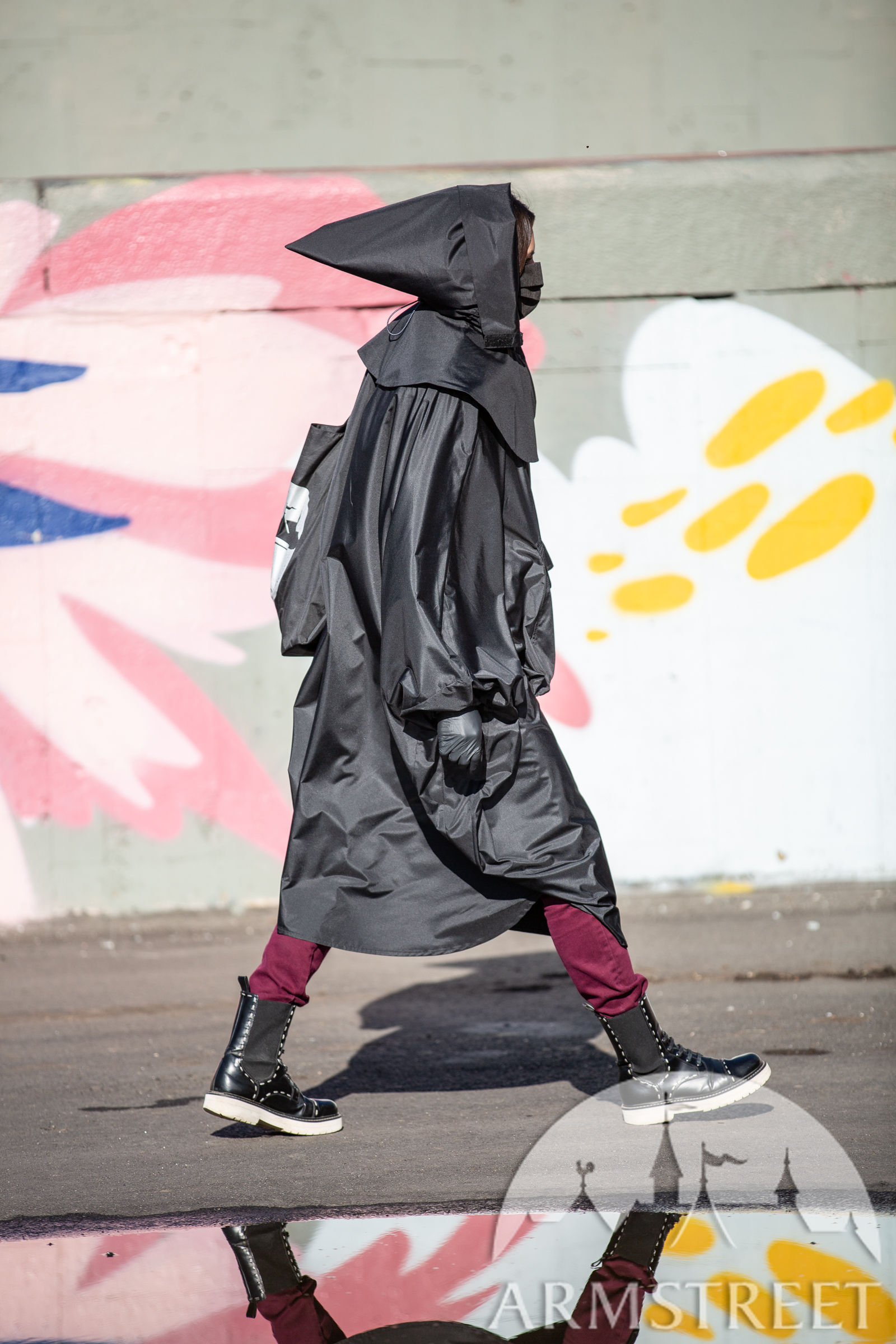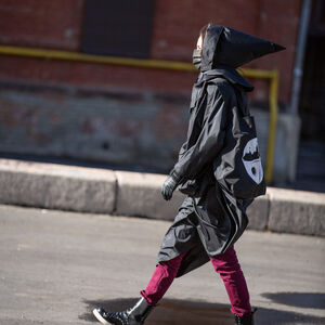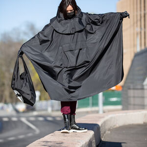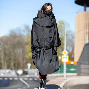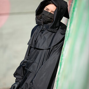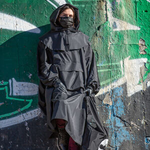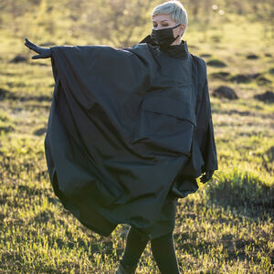 Elle est fabriquée de tissu synthétique moderne résistant à l’eau. C’est une cape fermée ample rectangulaire. Elle descend à partir des épaules et n’a pas de manches, il y a des fentes pour les mains avec les manchettes et le velcro pour pouvoir les ajuster. Cette pièce est mise par-dessus la tête via le velcro comme un chandail, elle n’a pas de boutons ou de zipper sur le devant. Le velcro sur le cou a deux options : lâche et serré. Sur le devant il y a une grande poche spacieuse qui se ferme avec un rabat et velcro.