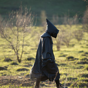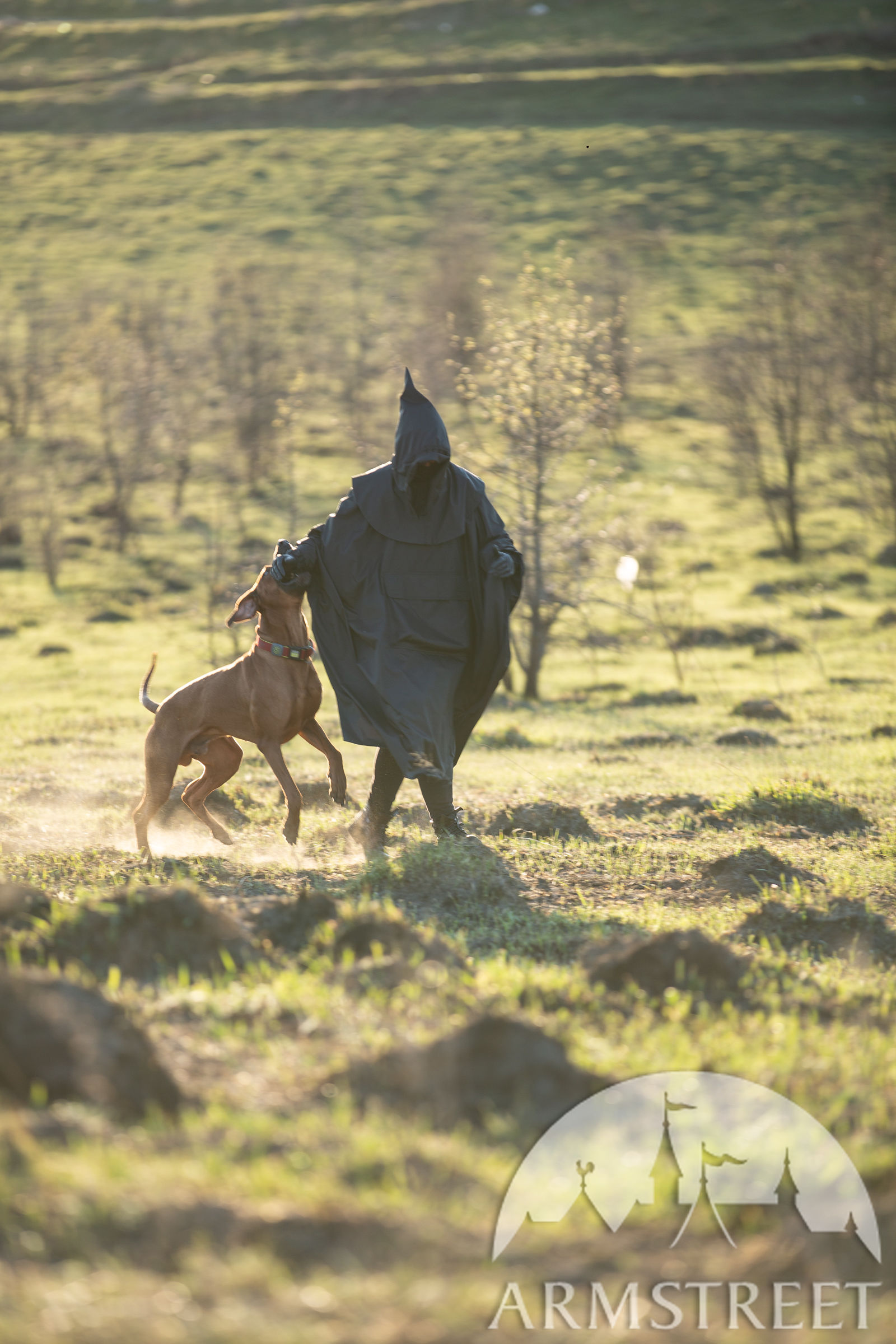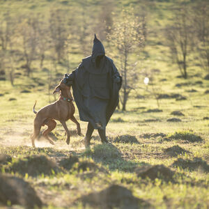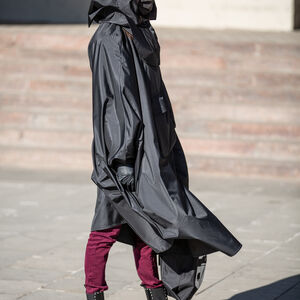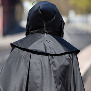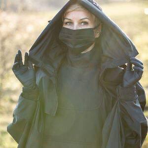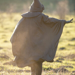 Cette version de notre cape « Éléments » a subi une influence des vêtements médiévaux de femme que nous avons produits chez nous avant. Si vous cherchez un article plus masculin nous avons prévu cette option aussi. Le modèle féminin est légèrement plus long et a une capuche qui rappelle le design du Chaperon « Princesse de l’Automne » qui se ferme au milieu avec un velcro. Le cordon coulissant aide à bien tenir la capuche sur la tête et le devant de la capuche peut soit rester debout et mieux protéger le visage soit enroulé pour une meilleure visibilité. Les manchettes sont de 5 cm.
