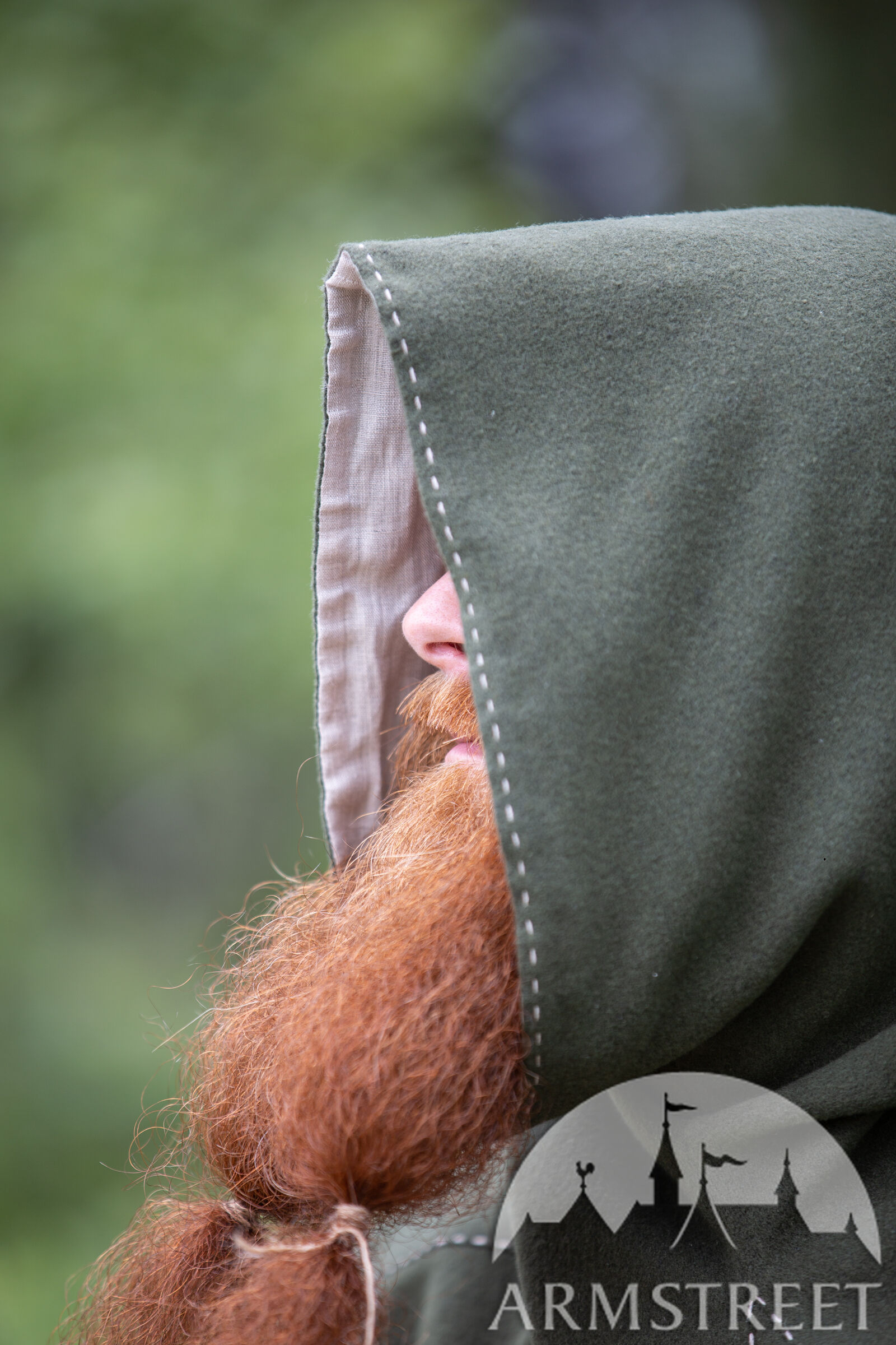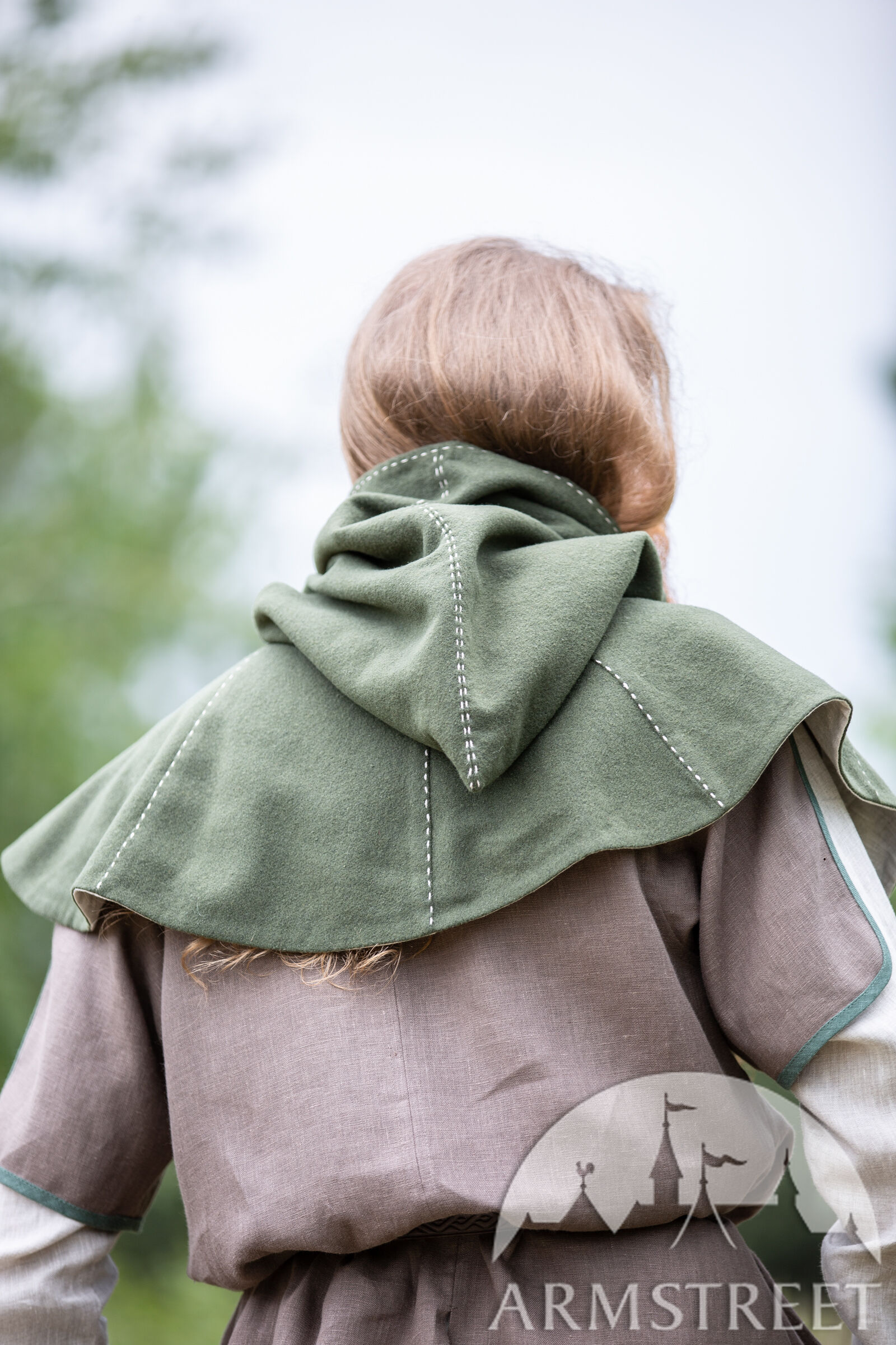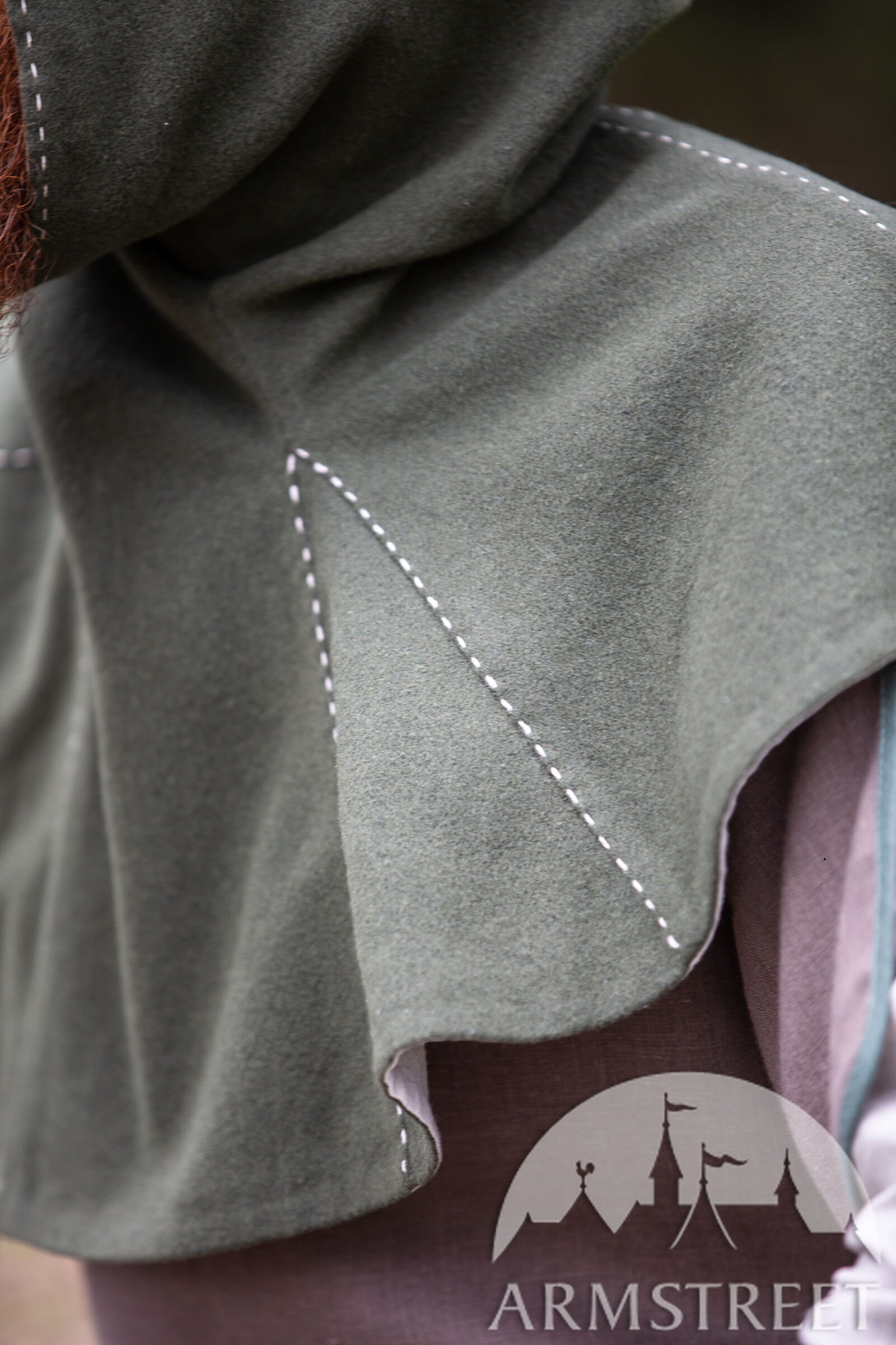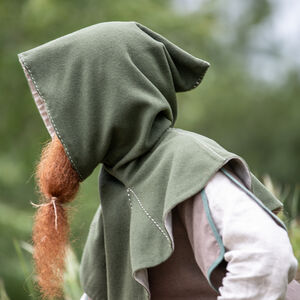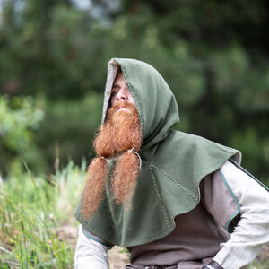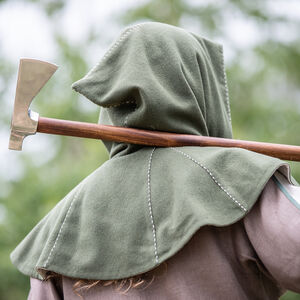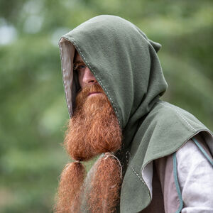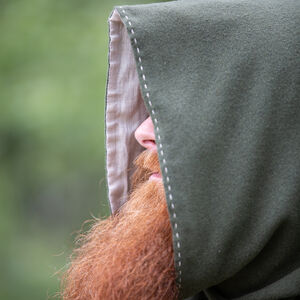 C’est pour cette raison que nous avons décidé d’inclure les couvre-chefs tellement fonctionnels dans notre collection « Le Foyer Médiéval ». Notre chaperon consiste de deux couches. La couche extérieure est faite de laine et va sûrement vous tenir au chaud. La couche intérieure est faite en lin fin qui est très doux et agréable contre la peau. La capuche est très profonde et ample. Il y a assez de tissu pour la rabaisser en arrière et faire voir le beau lin de doublure contrastant. Le chaperon est décoré d’une belle couture autour du visage et sur certaines autres coutures.