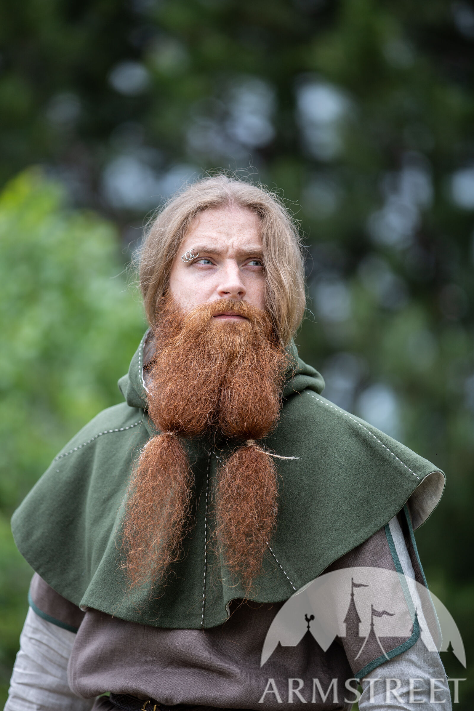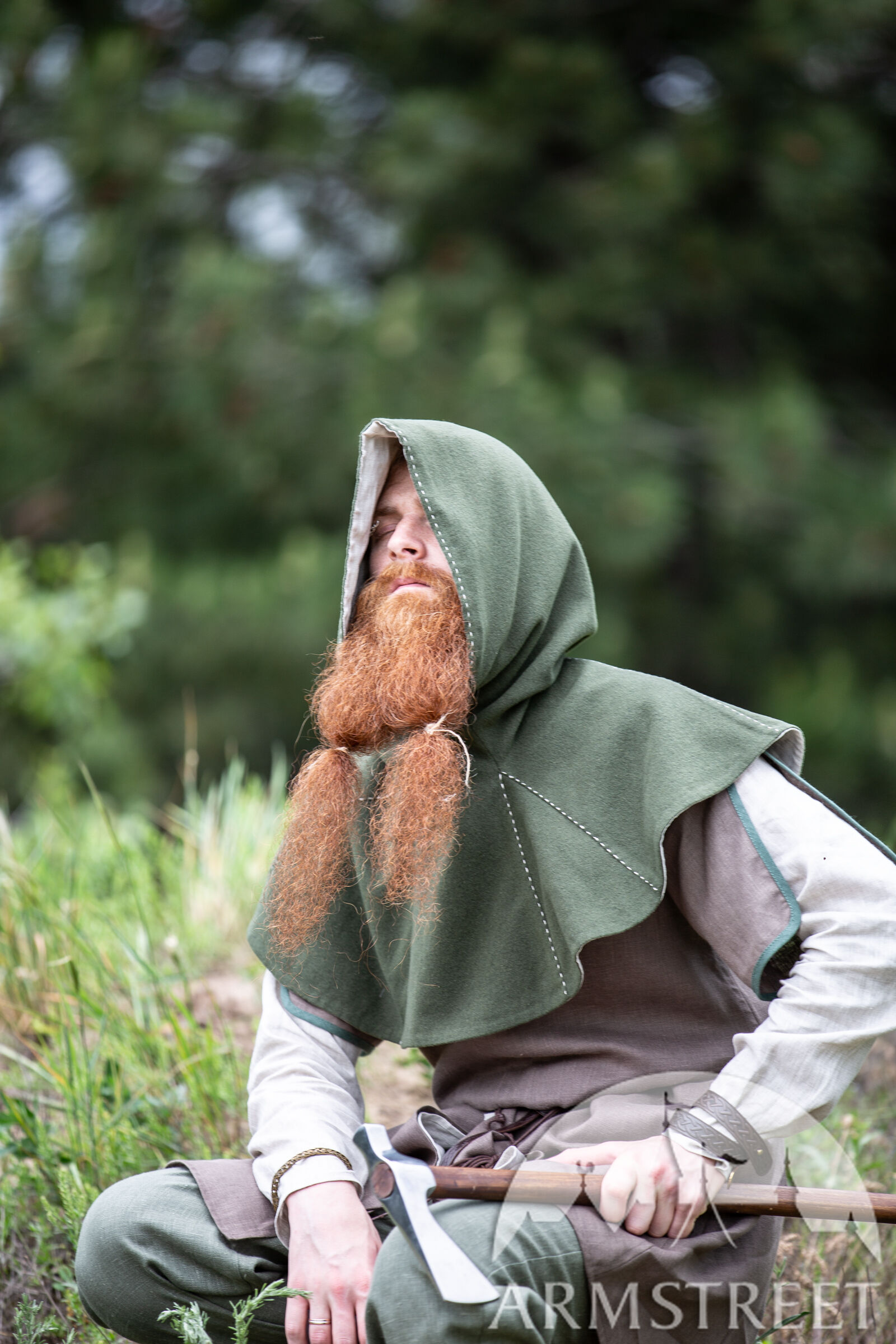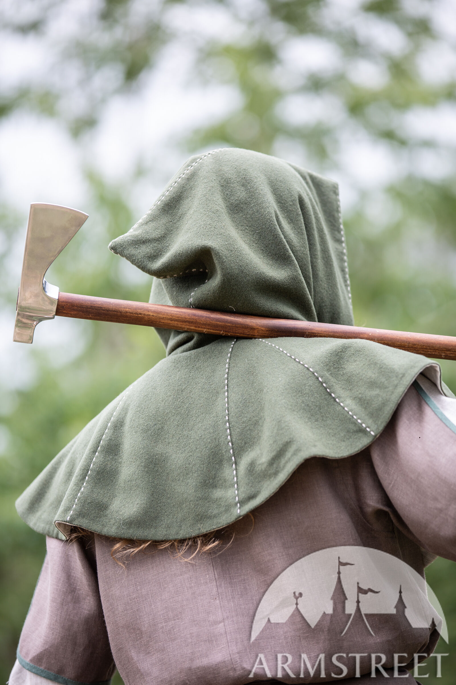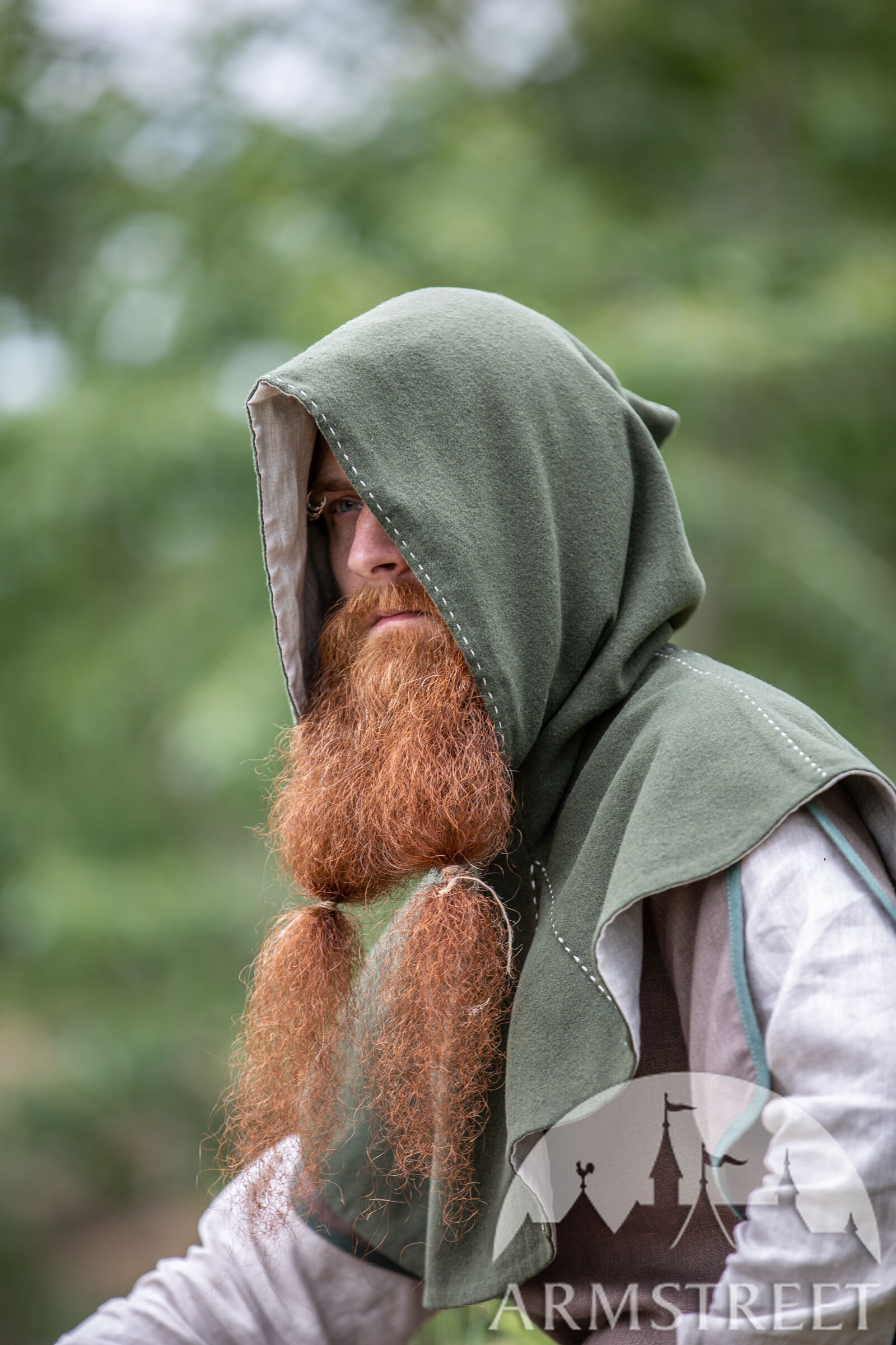 C’est pour cette raison que nous avons décidé d’inclure les couvre-chefs tellement fonctionnels dans notre collection « Le Foyer Médiéval ». Notre chaperon consiste de deux couches. La couche extérieure est faite de laine et va sûrement vous tenir au chaud. La couche intérieure est faite en lin fin qui est très doux et agréable contre la peau. La capuche est très profonde et ample. Il y a assez de tissu pour la rabaisser en arrière et faire voir le beau lin de doublure contrastant. Le chaperon est décoré d’une belle couture autour du visage et sur certaines autres coutures.