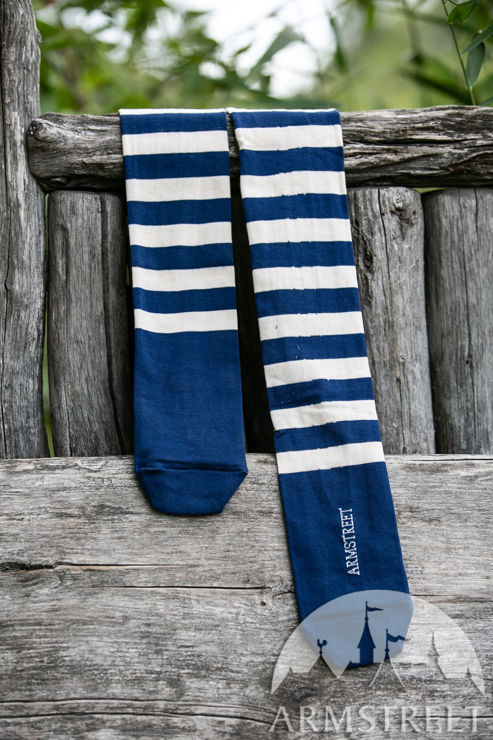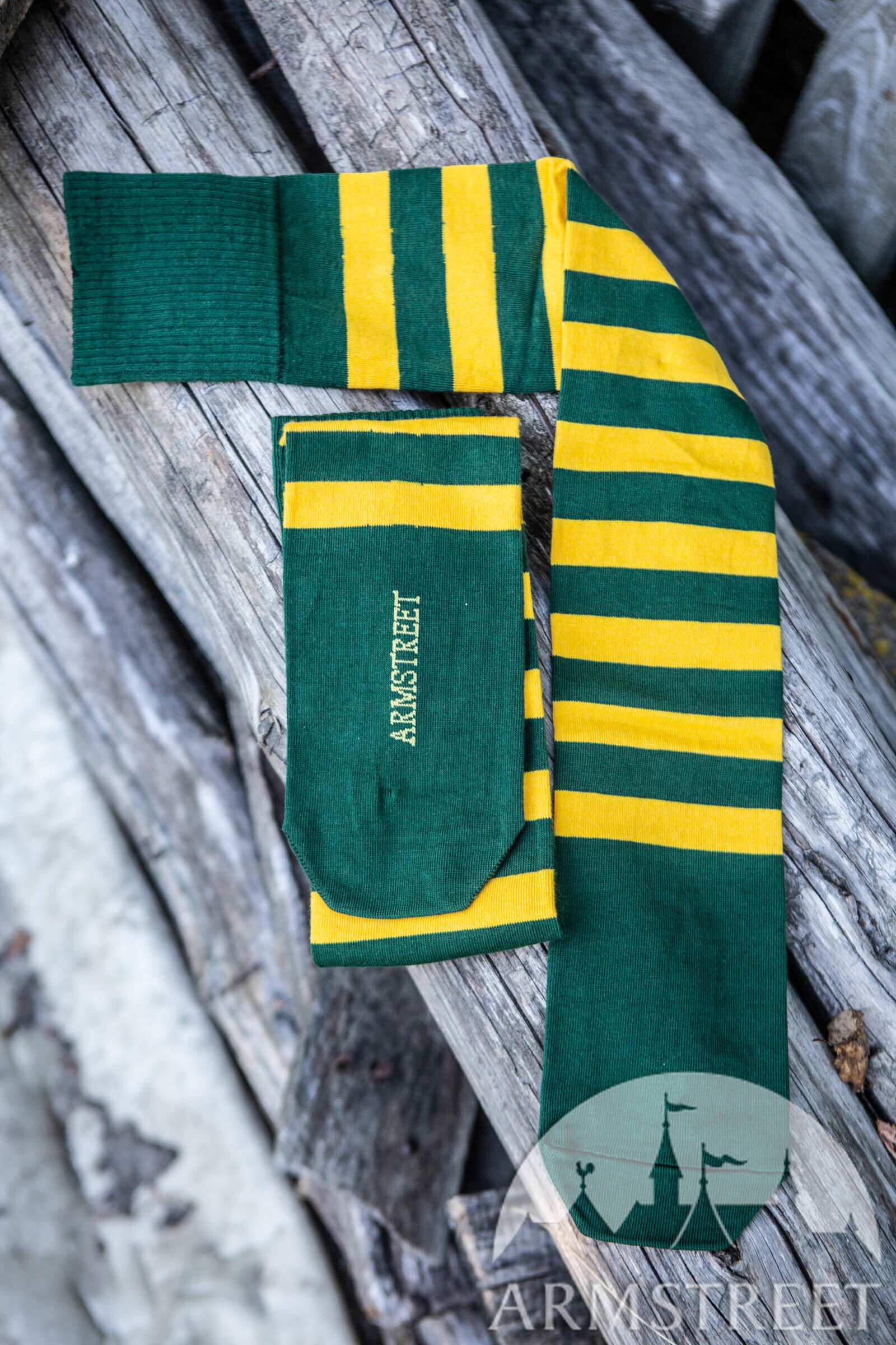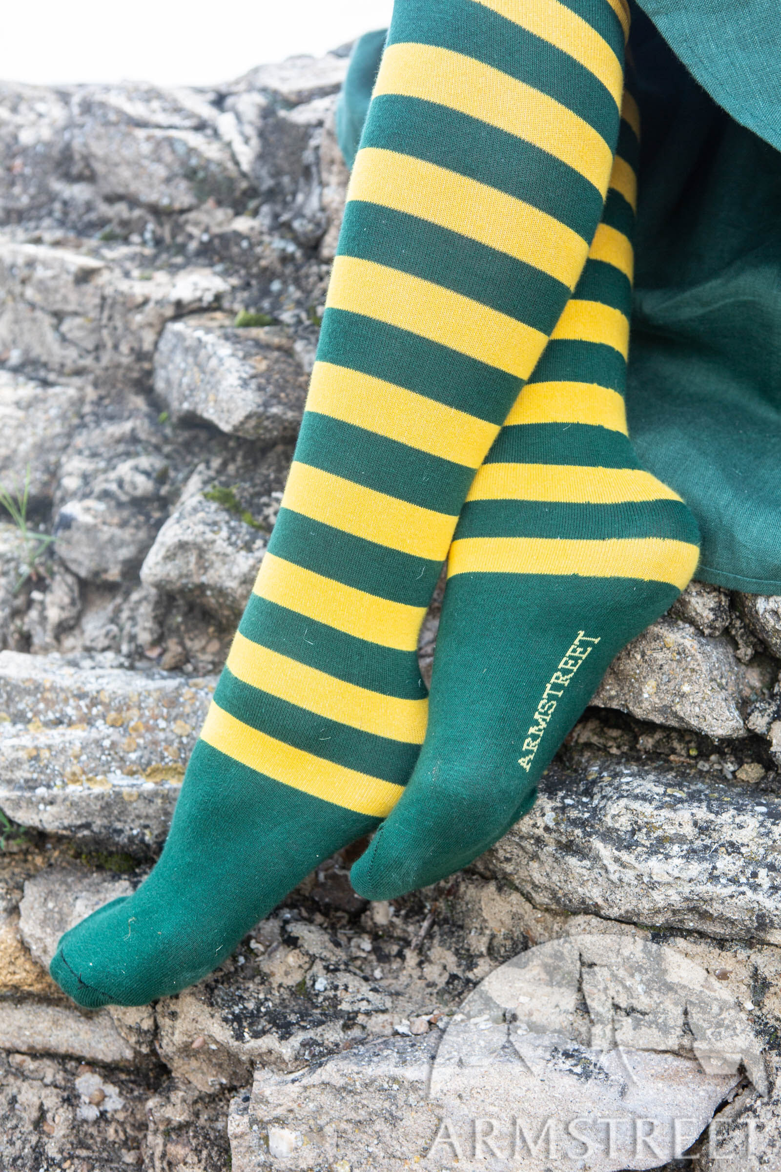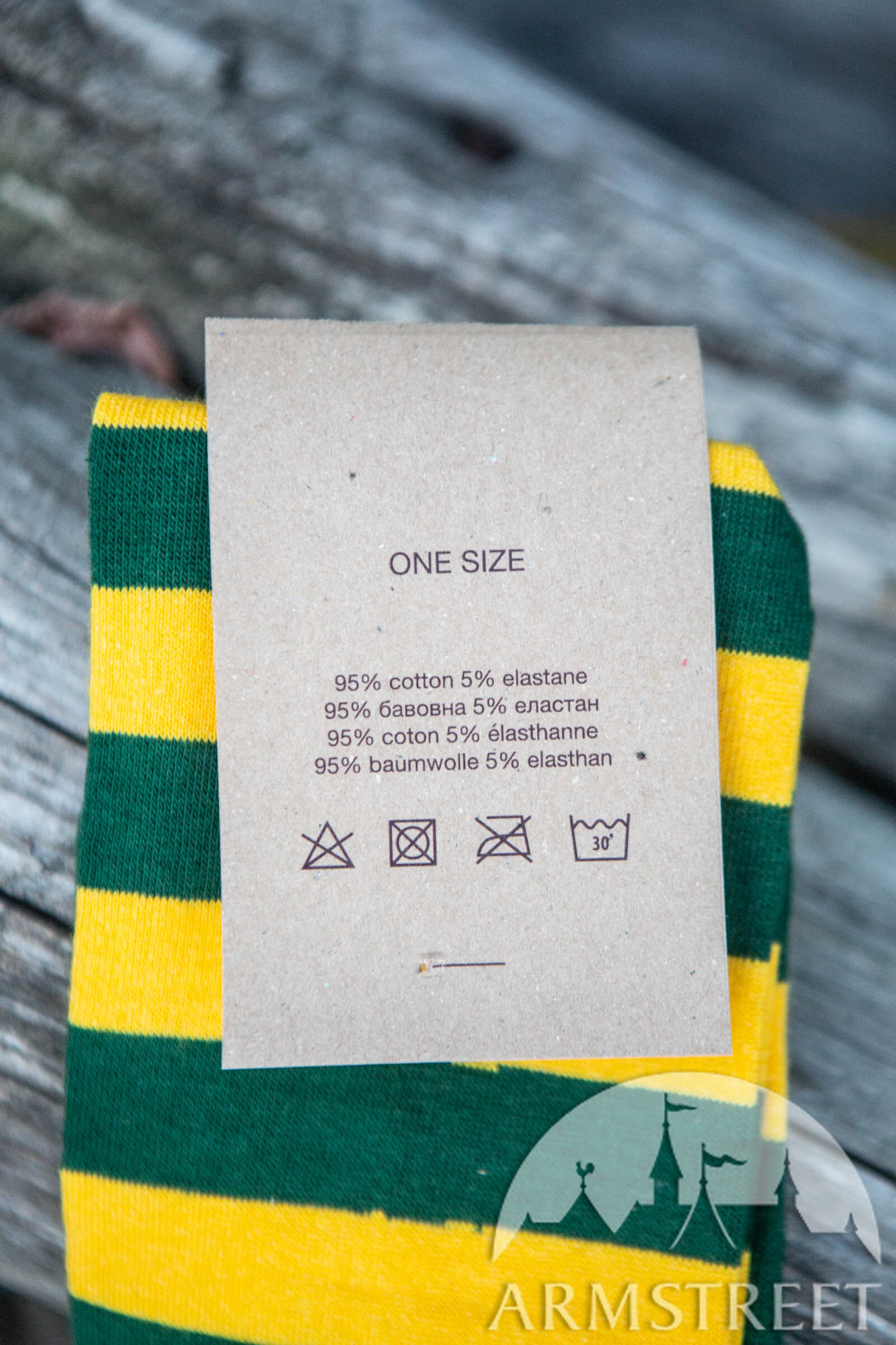 Ces jolies chaussettes sont à la hauteur des genoux et vont garder vos jambes bien au chaud aussi. Elles sont assez épaisses et ont une texture très agréable qui ira bien à toute tenue médiévale. Elles sont rayées en direction horizontale en alternant les couleurs et sont faites en coton 95% et élasthanne 5% qui les rend confortables et un peu plus élastiques.