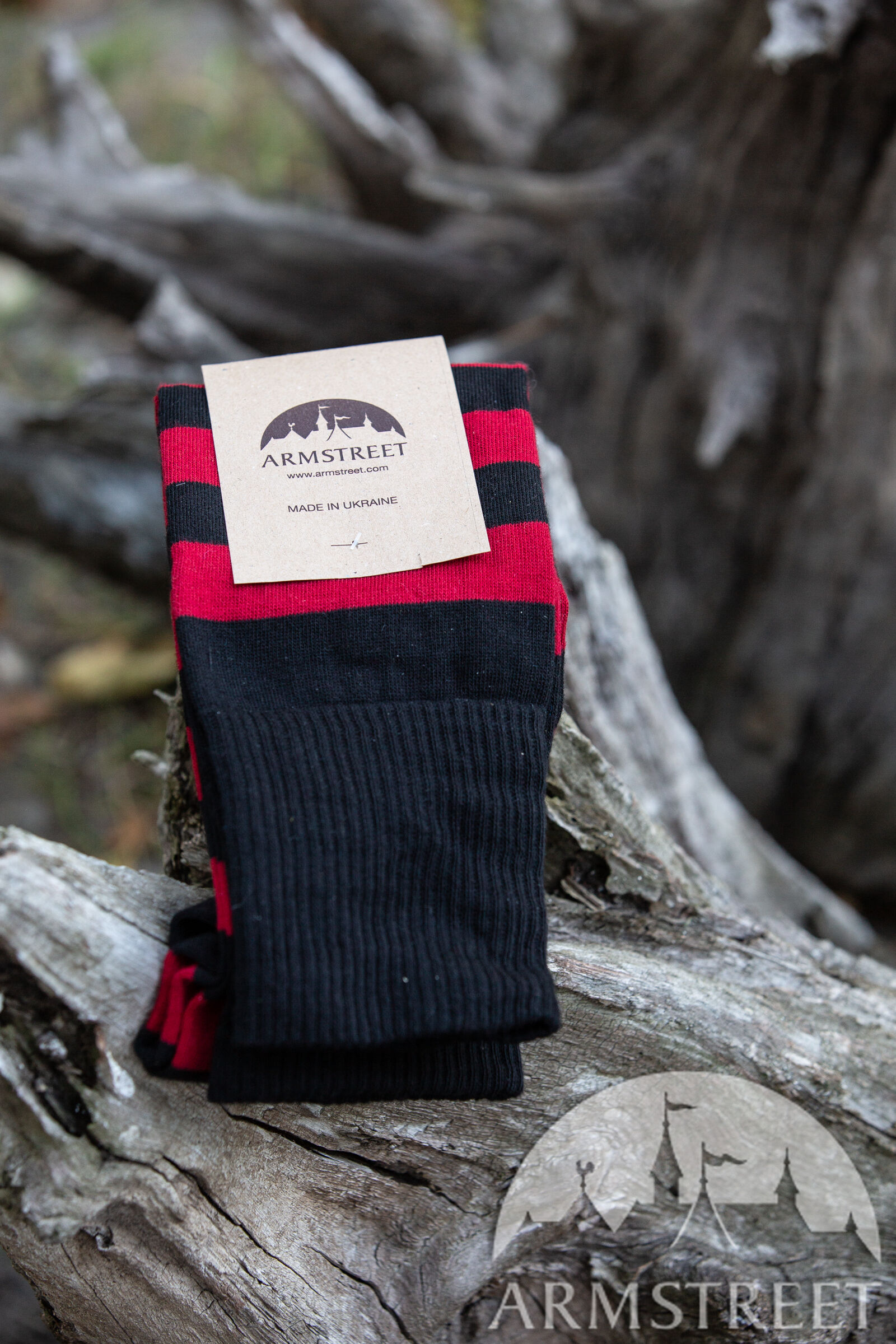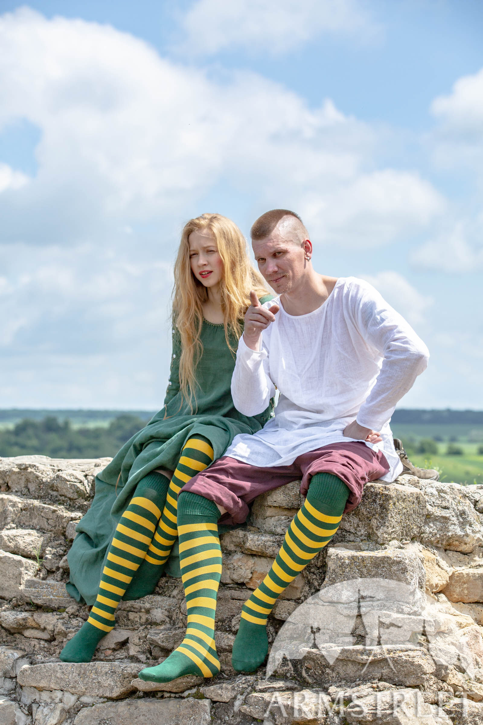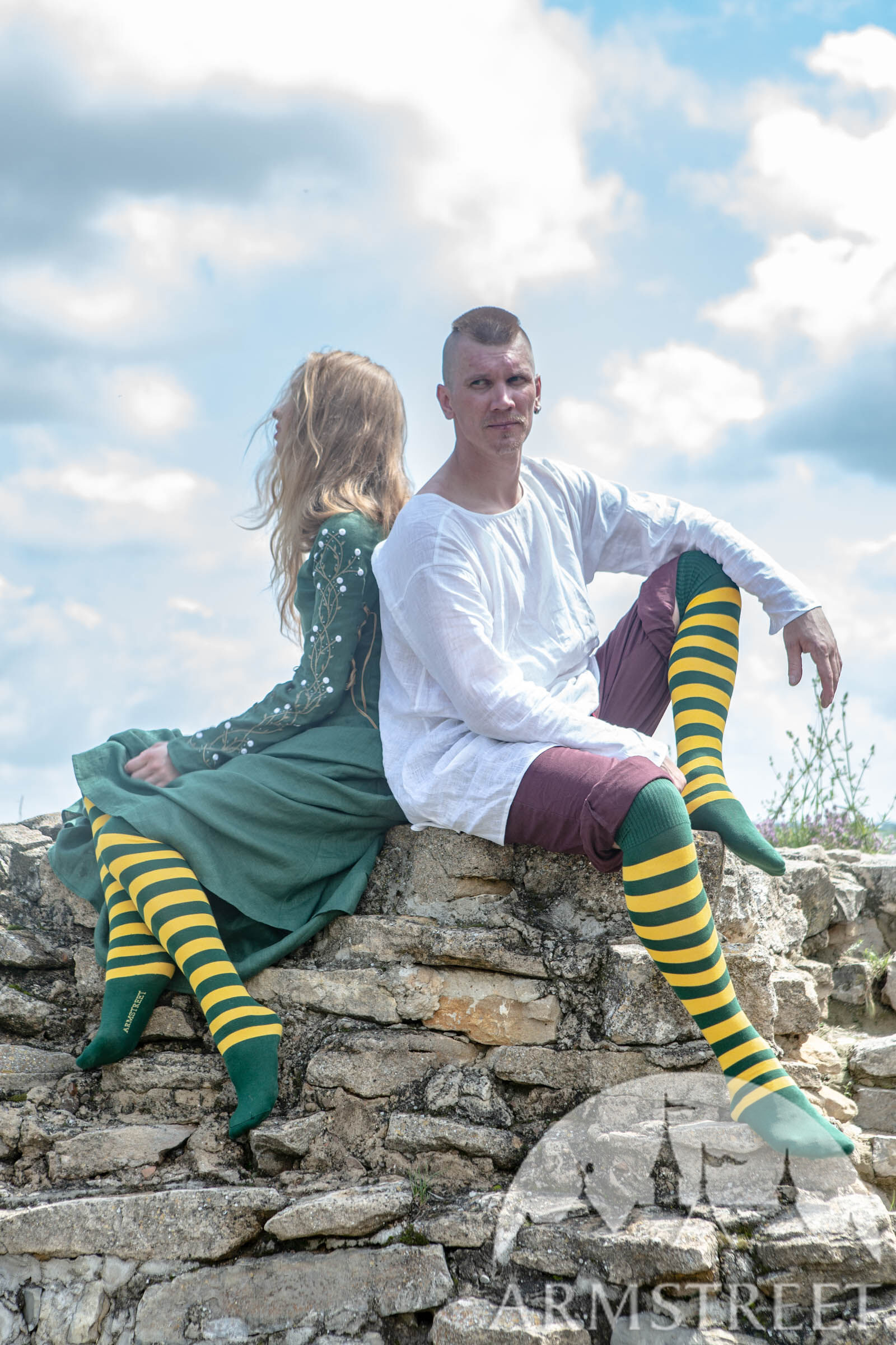 Ces jolies chaussettes sont à la hauteur des genoux et vont garder vos jambes bien au chaud aussi. Elles sont assez épaisses et ont une texture très agréable qui ira bien à toute tenue médiévale. Elles sont rayées en direction horizontale en alternant les couleurs et sont faites en coton 95% et élasthanne 5% qui les rend confortables et un peu plus élastiques.