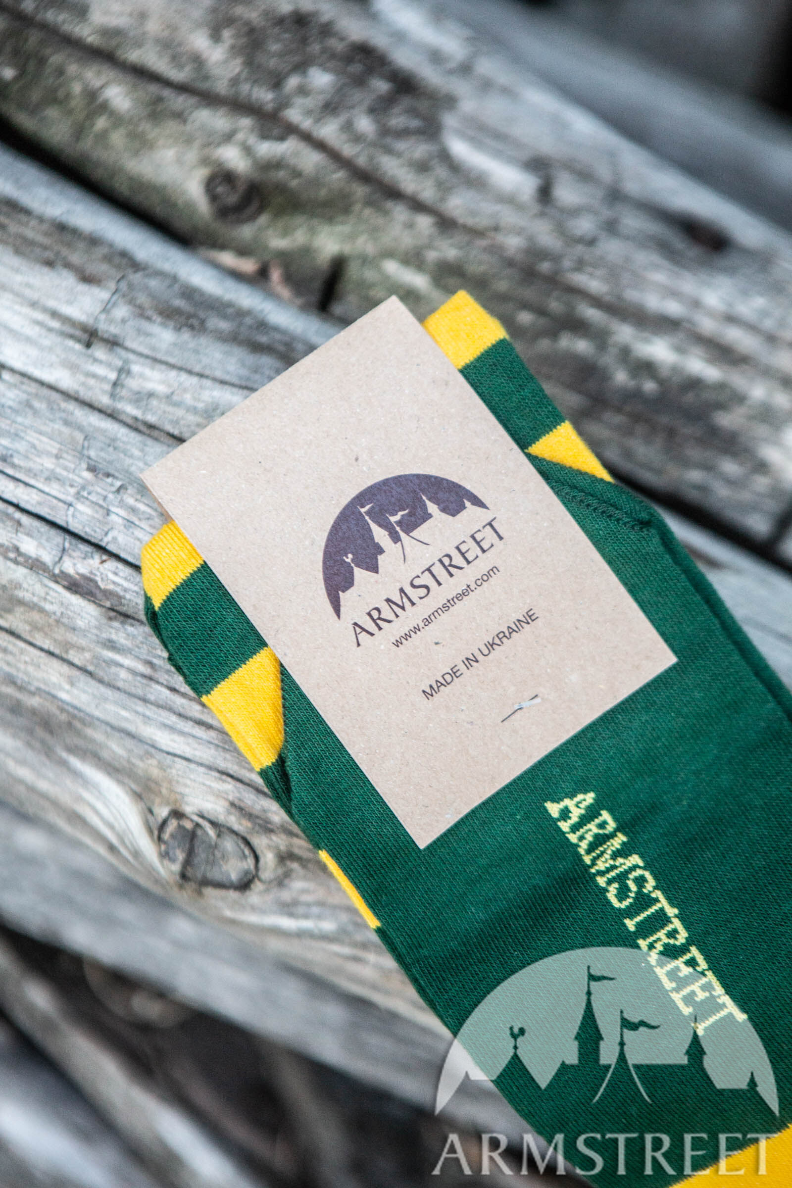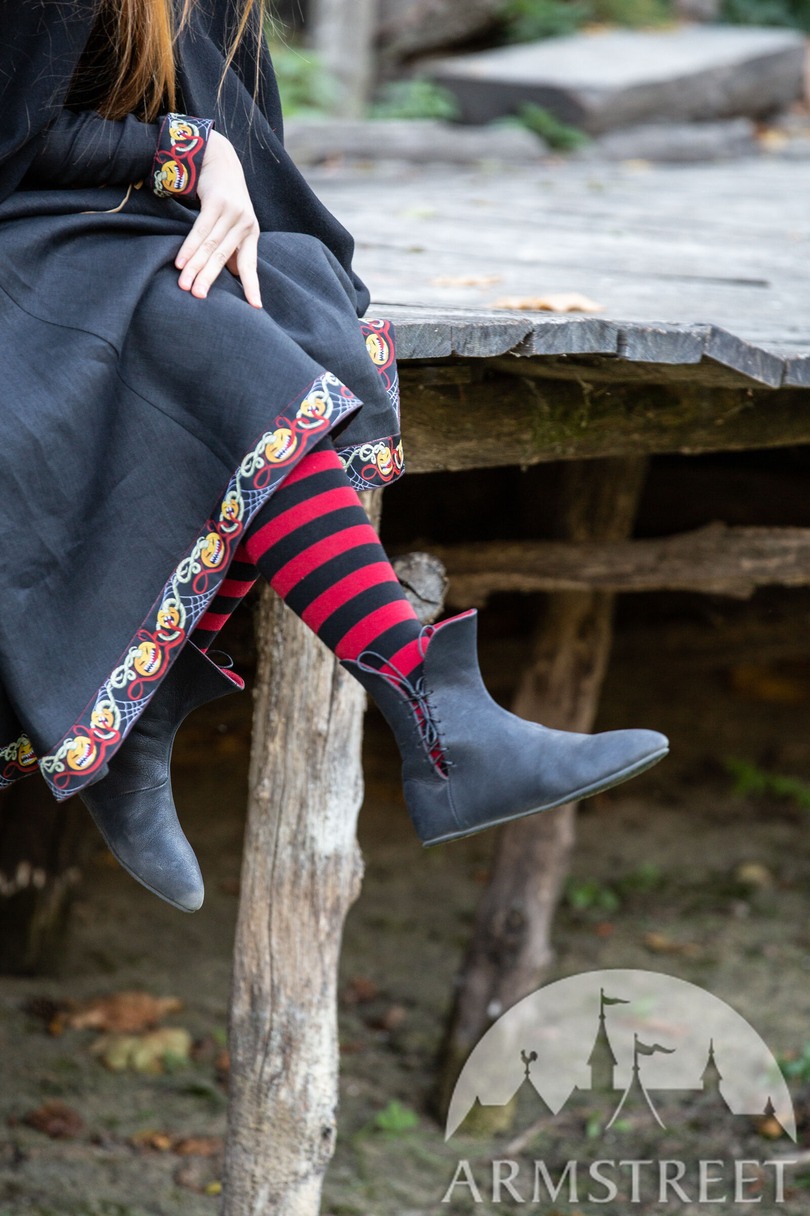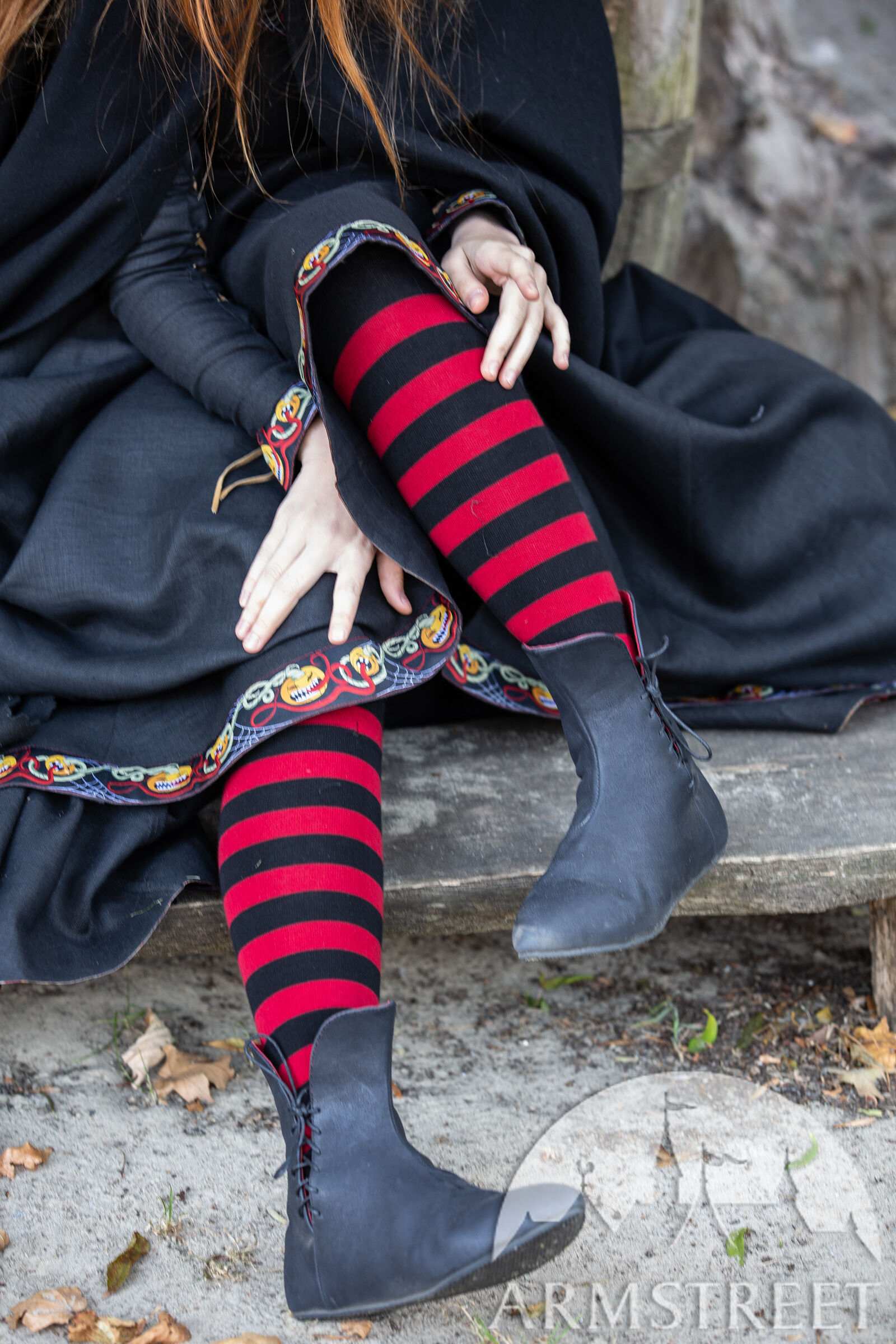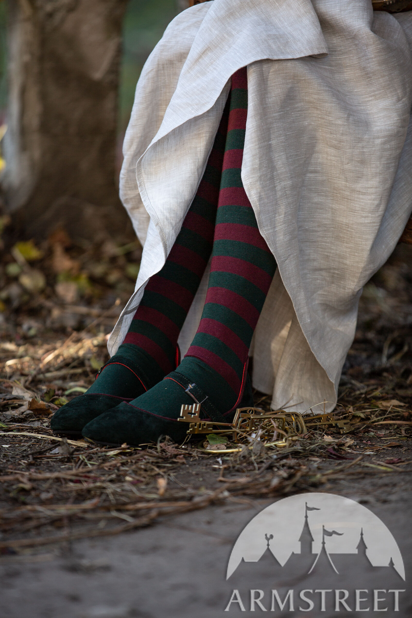Ces jolies chaussettes sont à la hauteur des genoux et vont garder vos jambes bien au chaud aussi. Elles sont assez épaisses et ont une texture très agréable qui ira bien à toute tenue médiévale. Elles sont rayées en direction horizontale en alternant les couleurs et sont faites en coton 95% et élasthanne 5% qui les rend confortables et un peu plus élastiques.