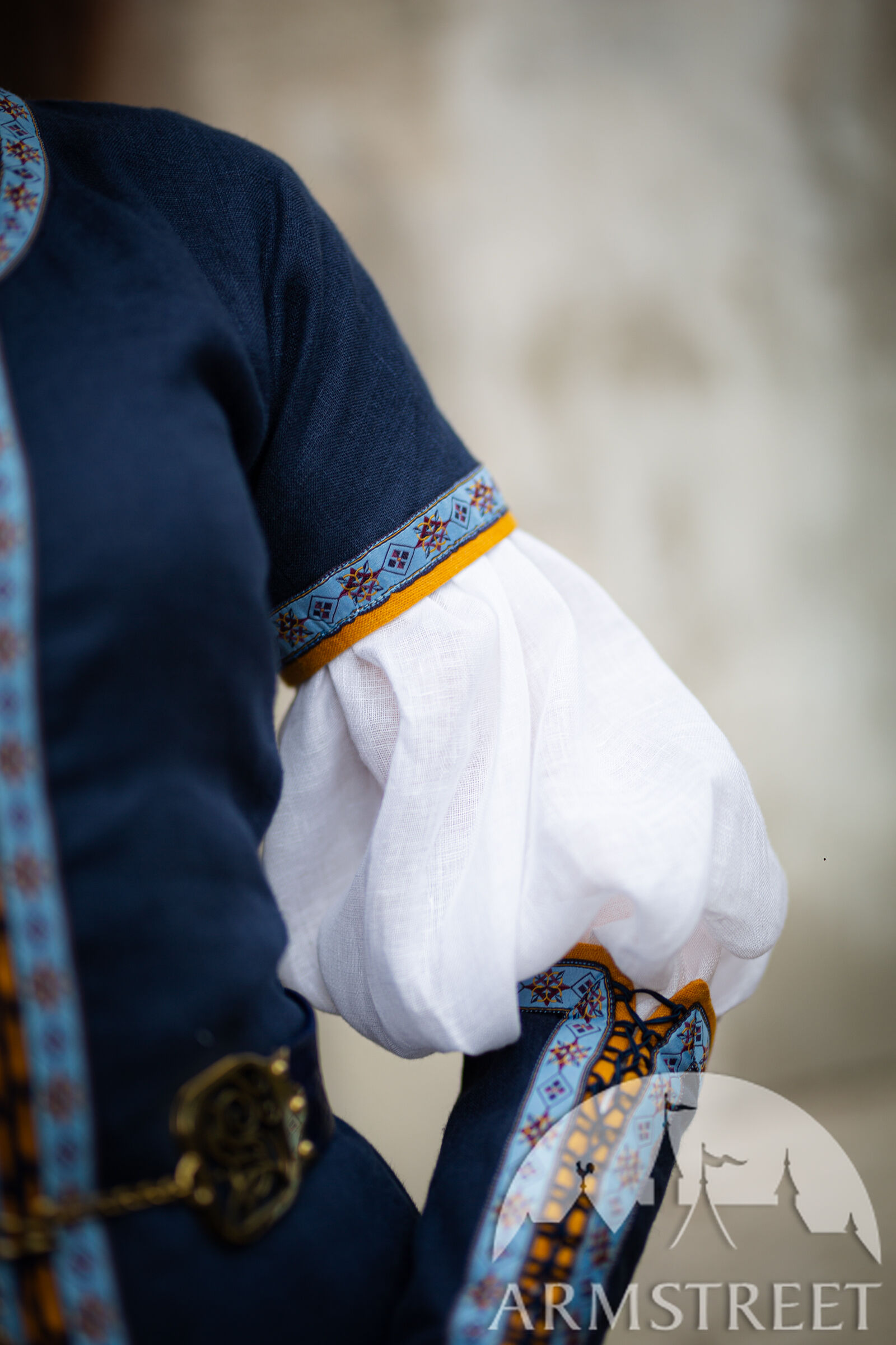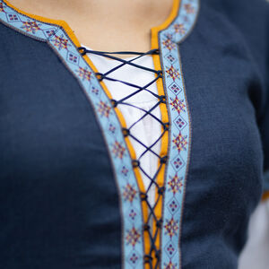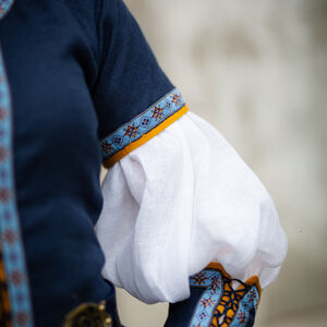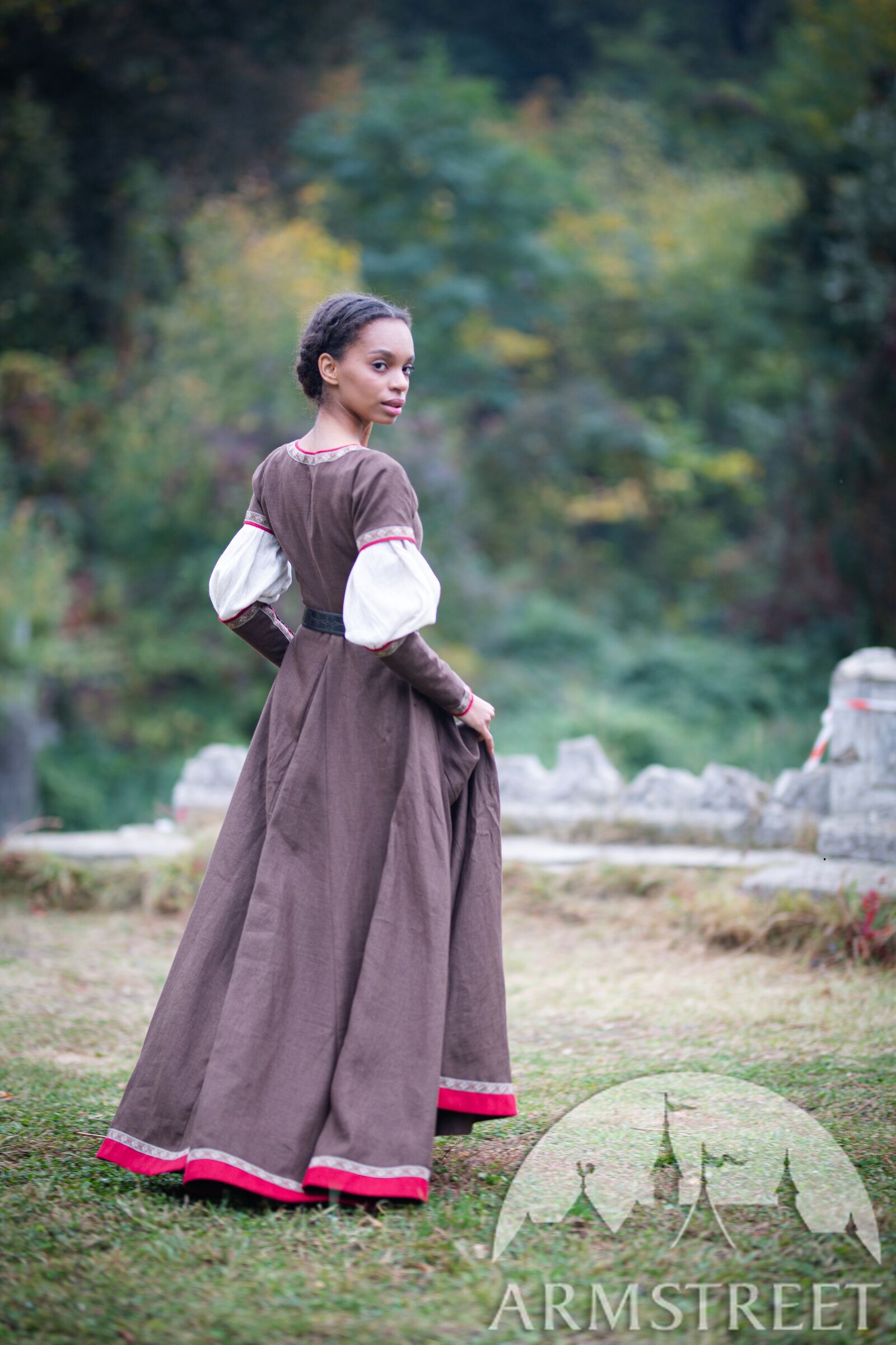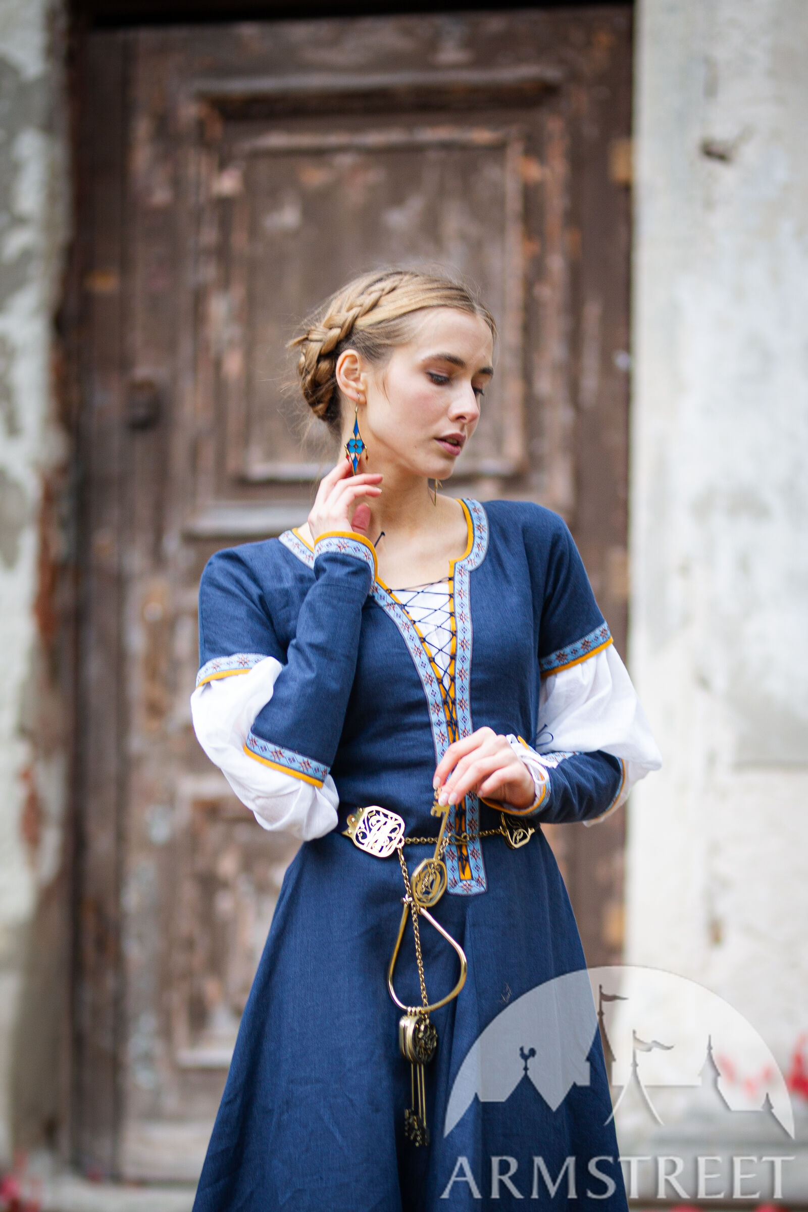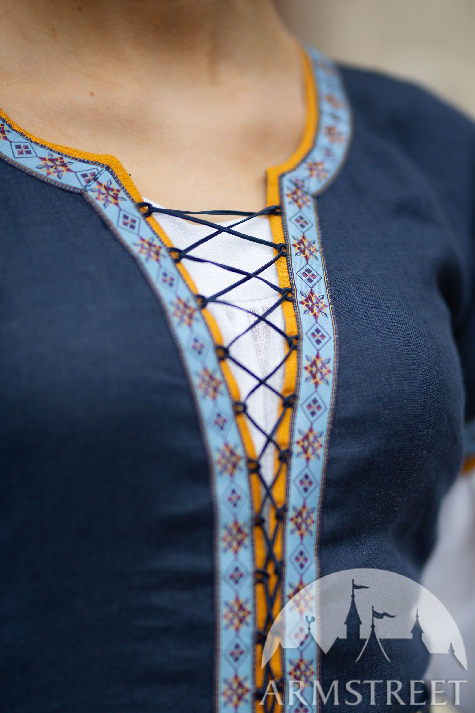Les passements de cette collection sont conçus particulièrement par nos artistes en utilisant des formes géométriques médiévales telles que des diamants et des étoiles. Cela signifie que vous ne pourrez trouver cette garniture nulle part ailleurs et qu’elle est véritablement exclusive à ArmStreet ! Cet ensemble complet comprend trois pièces : une robe en lin à manches courtes, des manches en lin amovibles et une chemise (sous-robe) en lin fin.