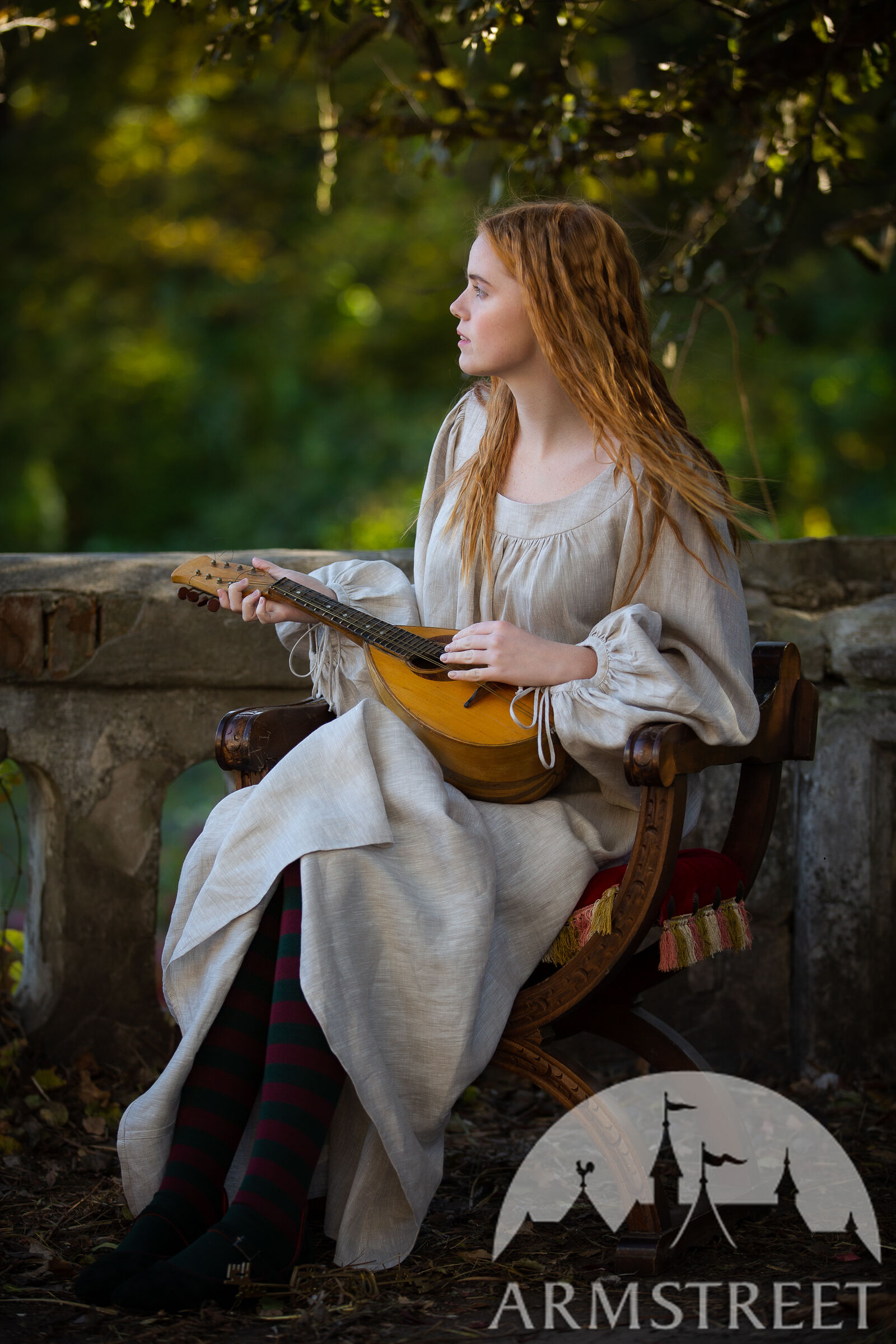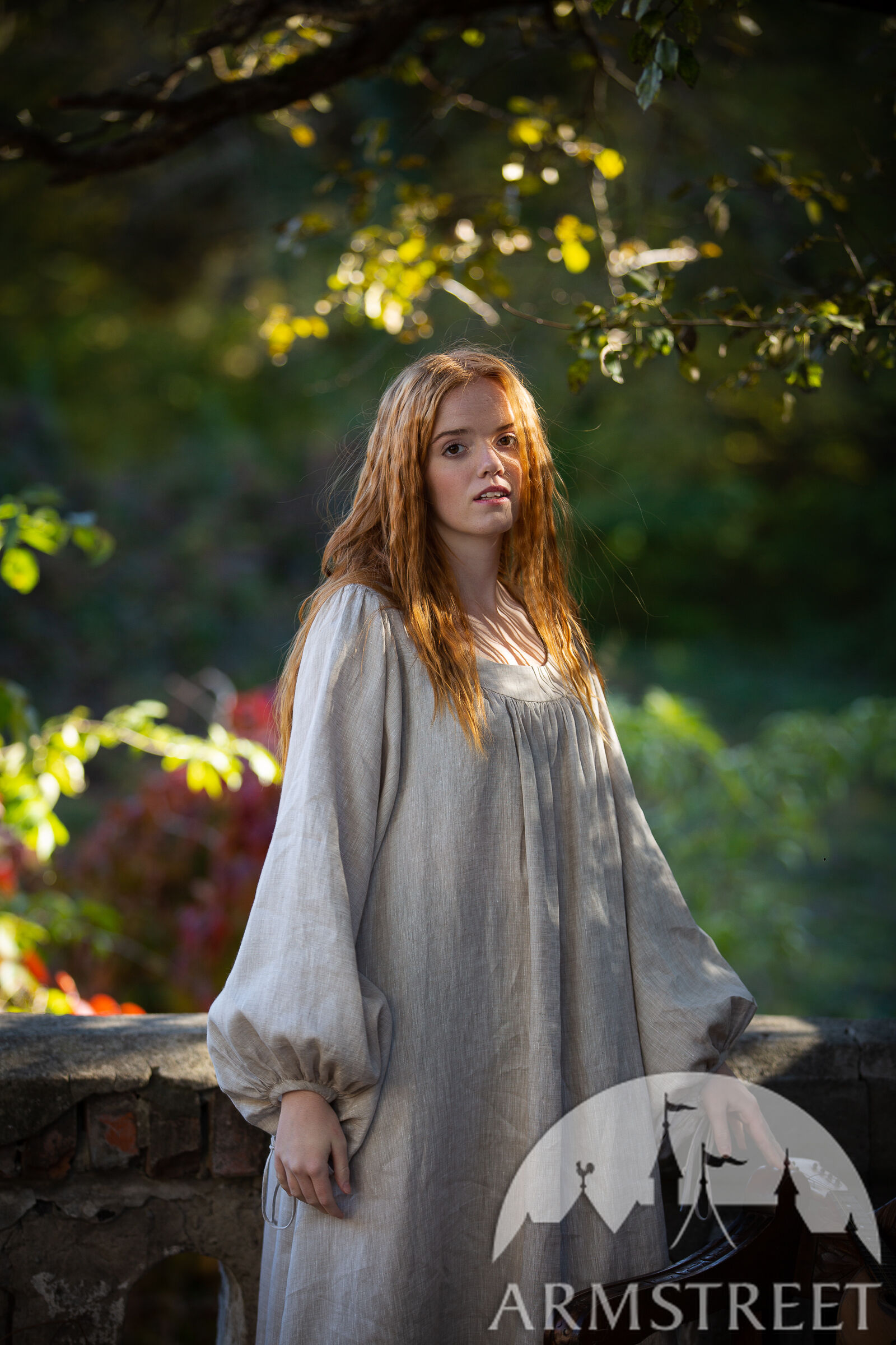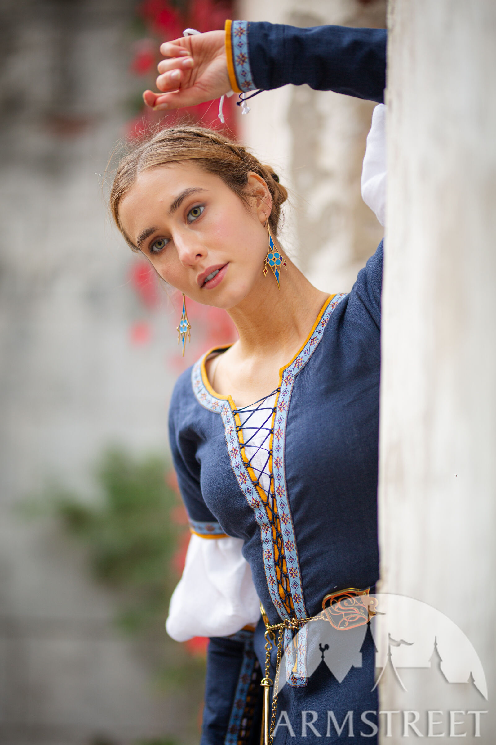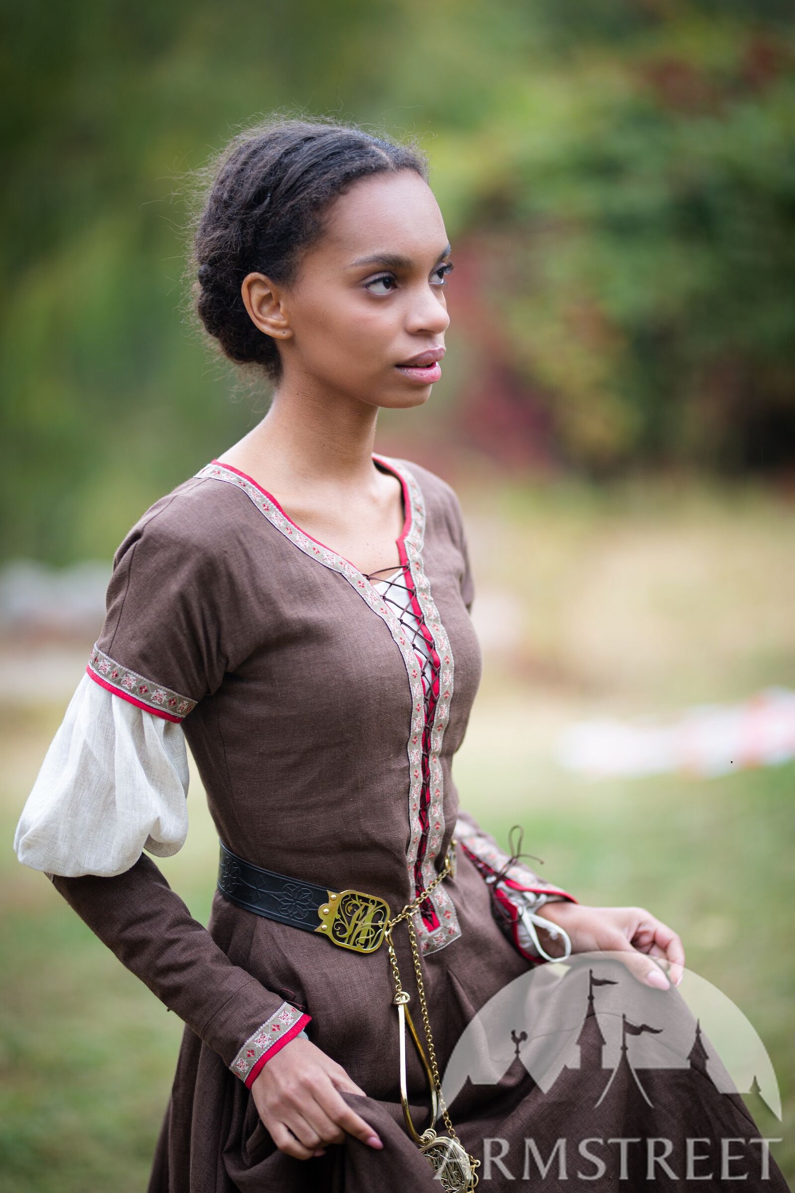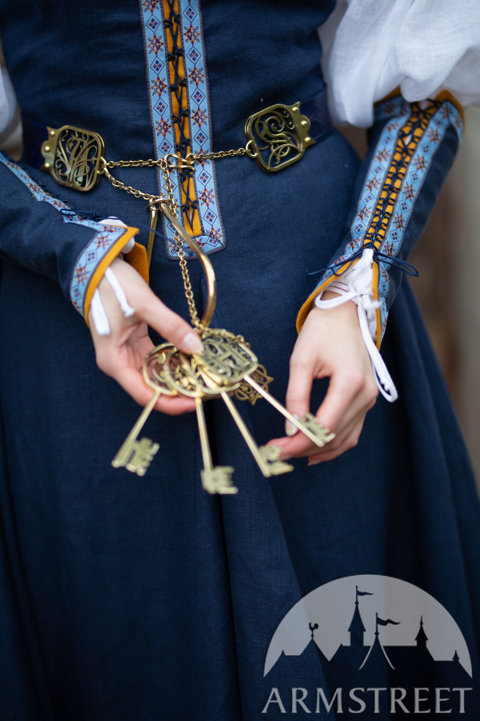 Les passements de cette collection sont conçus particulièrement par nos artistes en utilisant des formes géométriques médiévales telles que des diamants et des étoiles. Cela signifie que vous ne pourrez trouver cette garniture nulle part ailleurs et qu’elle est véritablement exclusive à ArmStreet ! Cet ensemble complet comprend trois pièces : une robe en lin à manches courtes, des manches en lin amovibles et une chemise (sous-robe) en lin fin.
