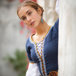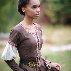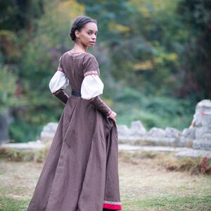 La robe de cette collection est l’un de nos modèles les plus populaires et s’inspire des vêtements des XIIIe-XVe siècles. Un corsage ajusté avec un laçage central cède la place à une jupe incroyablement ample, rehaussée de quatre bandes de tissu supplémentaires. Lorsque vous tournez ou marchez, vous serez étonnée de voir à quel point cette robe bouge avec vous ! Le laçage de cette robe est légèrement différent des autres robes similaires : au lieu de mettre des crochets de laçage en métal, nous choisissons de créer notre propre système de laçage en utilisant un cordon solide pour créer des boucles qui s’adaptent mieux au style de la robe.