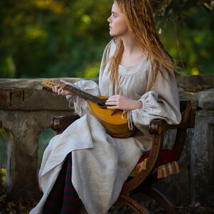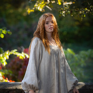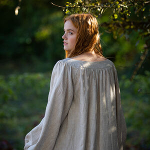 Une chemise est un élément essentiel de tout costume, car elle aide à absorber la transpiration et à garder vos vêtements extérieurs propres ! Cette sous-robe est fabriquée à partir de lin fin, le même tissu que nous utilisons pour tous nos sous-vêtements les plus populaires. Il est un peu plus fin et au tissage plus serré que le lin que nous utilisons pour la robe, ce qui en fait une excellente couche de base. La chemise est en forme de cloche et assez volumineuse, avec des plis et des fronces partout pour garantir une bonne fluidité. Les manches sont larges avec un cordon pour les froncer au poignet, et la chemise elle-même est assez longue.