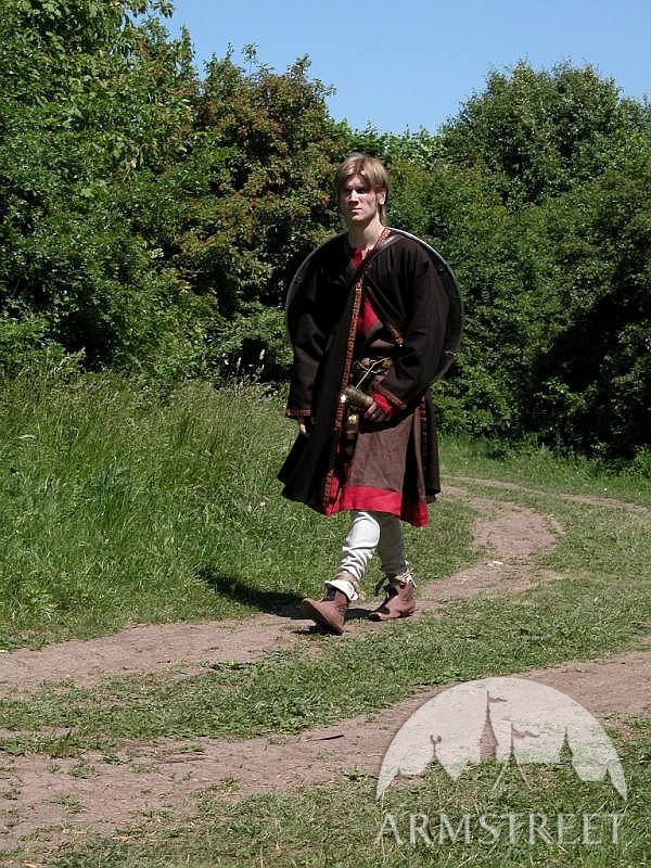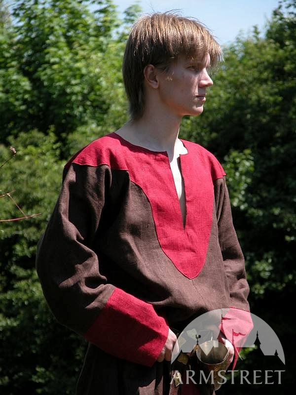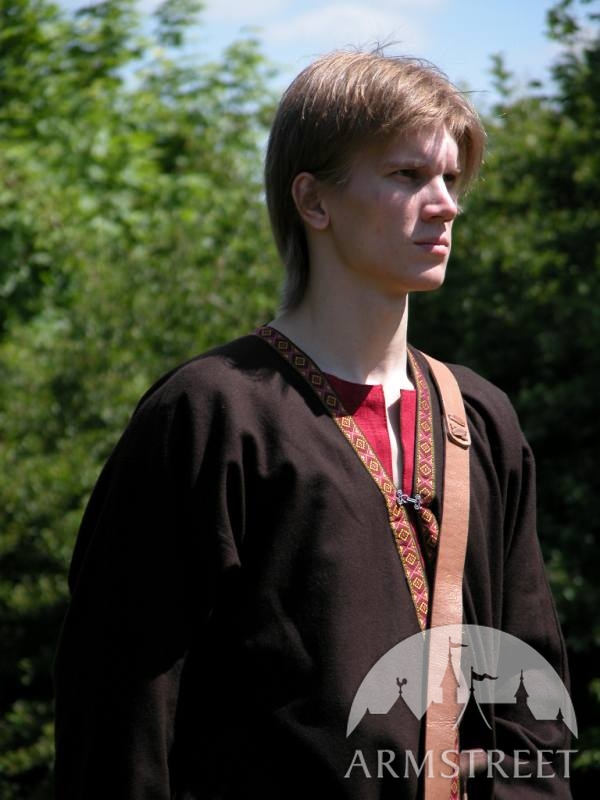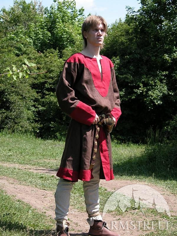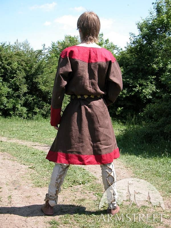C'est le costume de tunique en lin et manteau en laine 100 % naturel. Tunique semble vraiment authentique grâce à tissu de haute qualité de couleurs authentiques et design original. Le lin est le tissu très authentique et est faite conformément à la technologie qui est très proche de la fabrication de tissus d'origine médiévale.