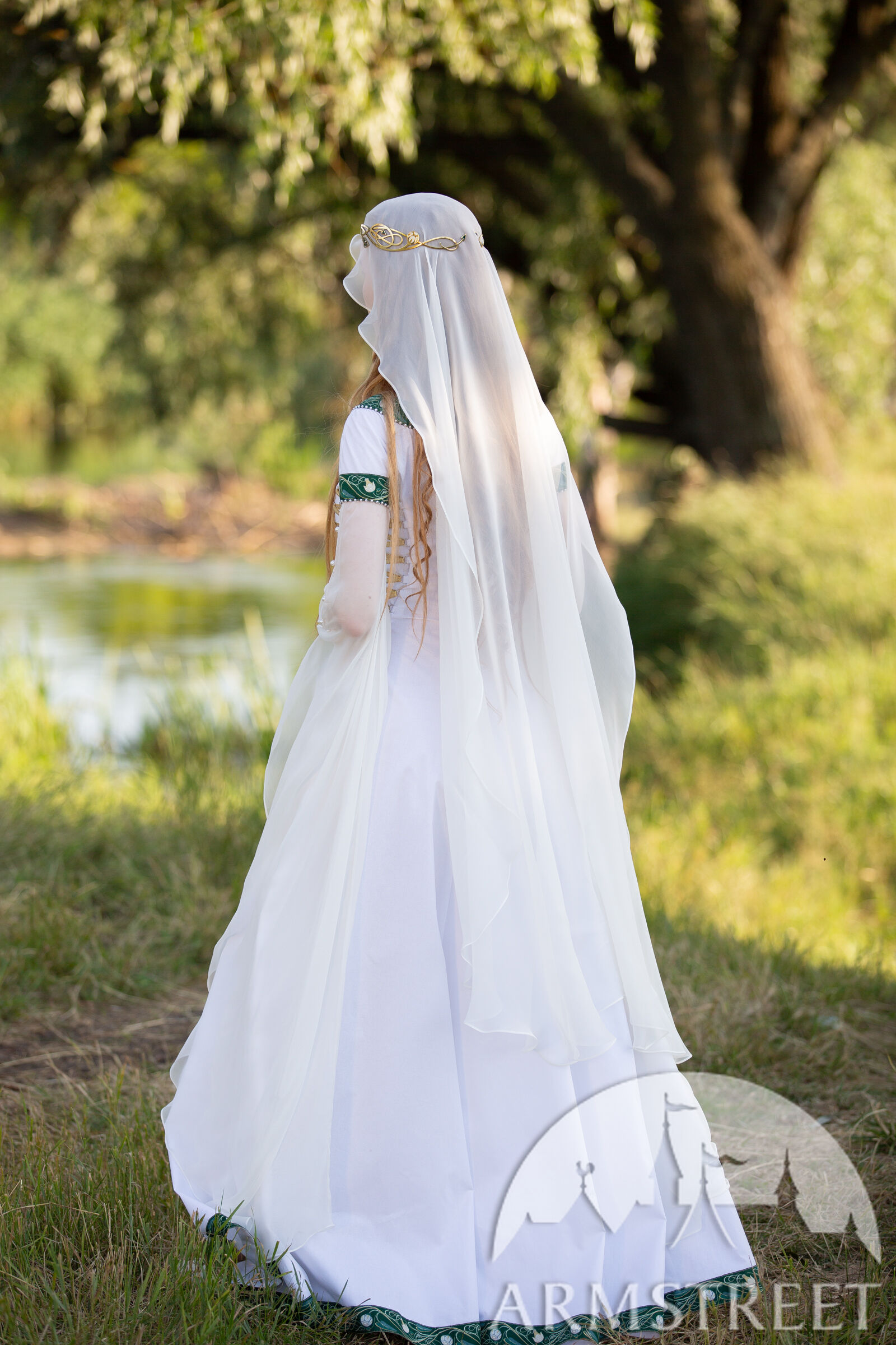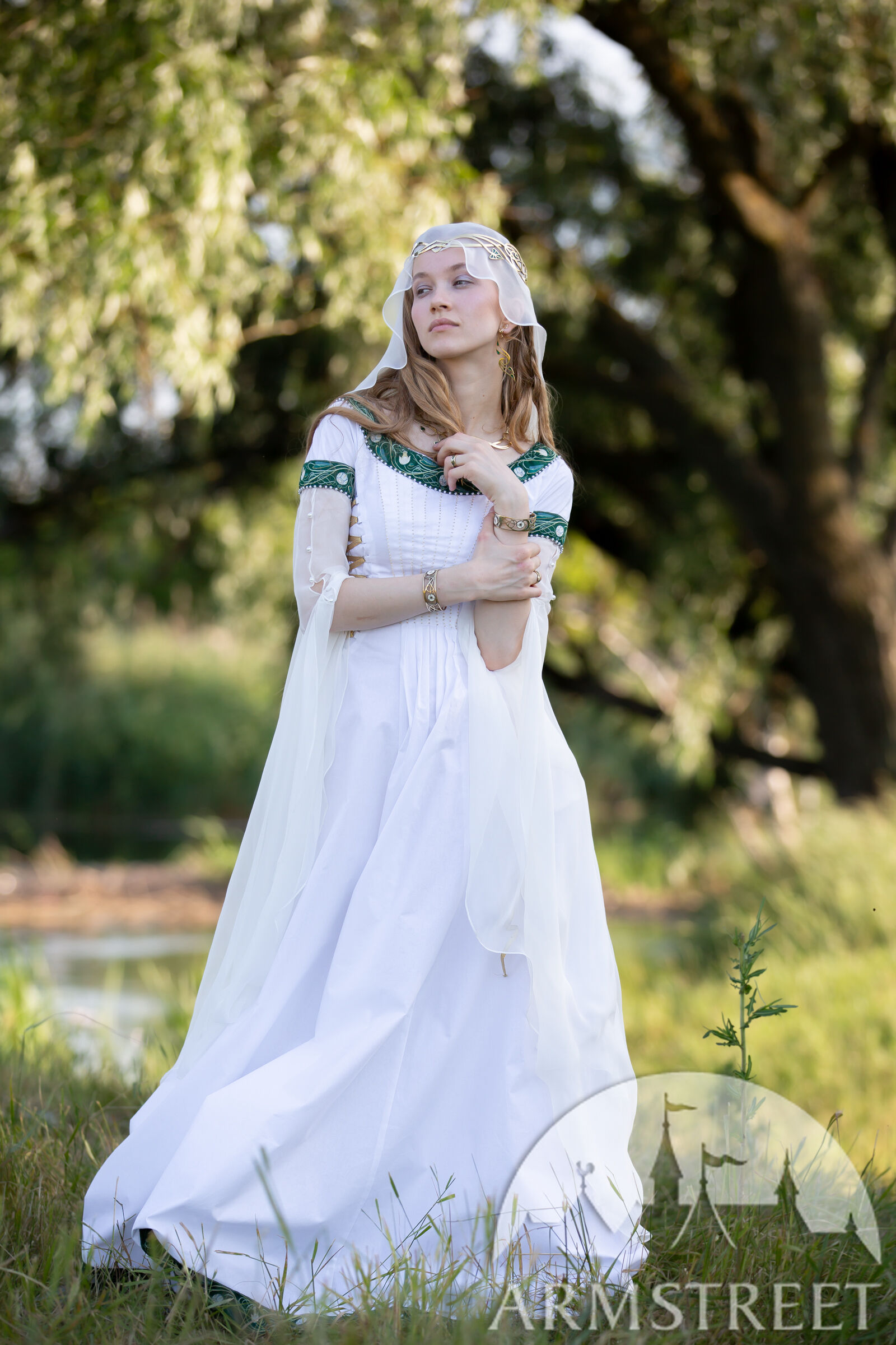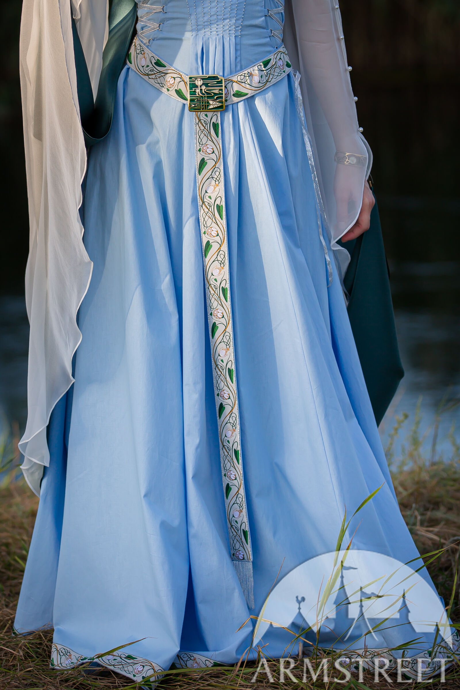 Chaque élément de nos costumes médiévaux est confectionné avec soin et une grande attention aux détails pour sublimer l'occasion spéciale où il est destiné à briller. Loin des costumes de reconstitution historique classiques choisis pour leur aspect pratique, ce sont de véritables trésors, ornés de mille feux. Inspirés par les nénuphars et les motifs Art nouveau, les passements réalisés sur mesure décorent l'encolure, l'ourlet, la ceinture et les manches. Les plis du corsage scintillent de perles, et les manches en chiffon de soie brillent doucement comme un clair de lune. Ce même éclat subtil se retrouve dans le voile de soie fluide, qui parachève l'ensemble d'une touche de légèreté et de féerie. Le voile est de taille unique et mesure 1,5 m de diamètre.