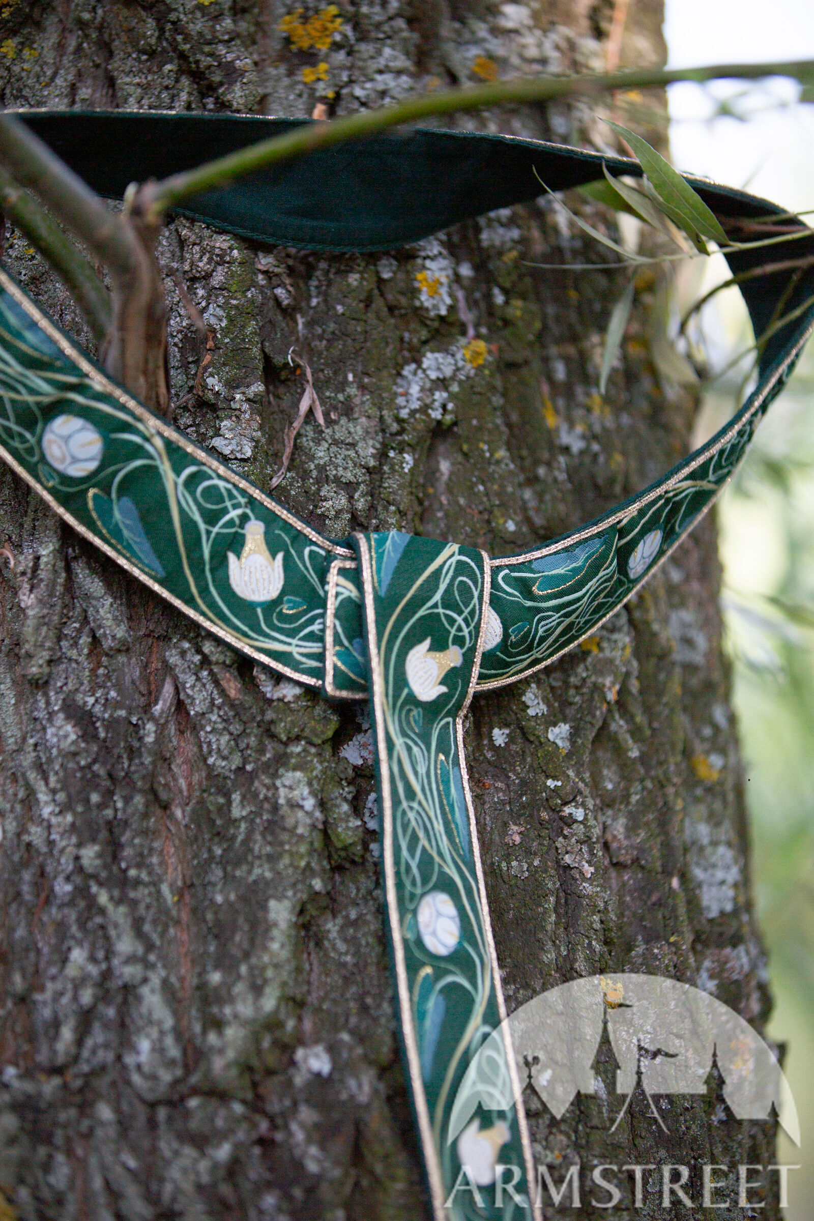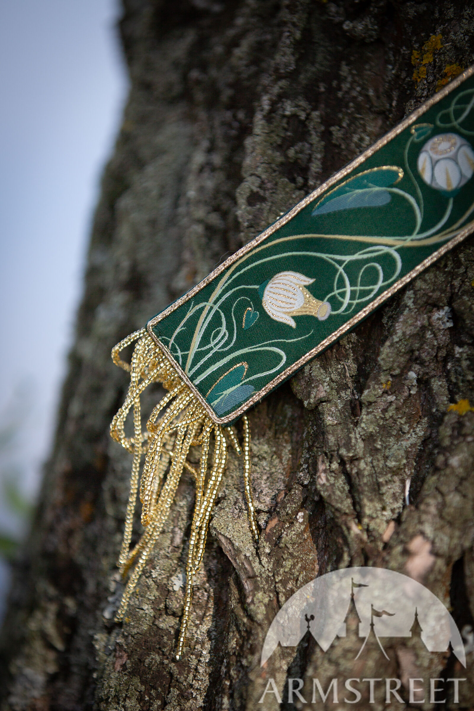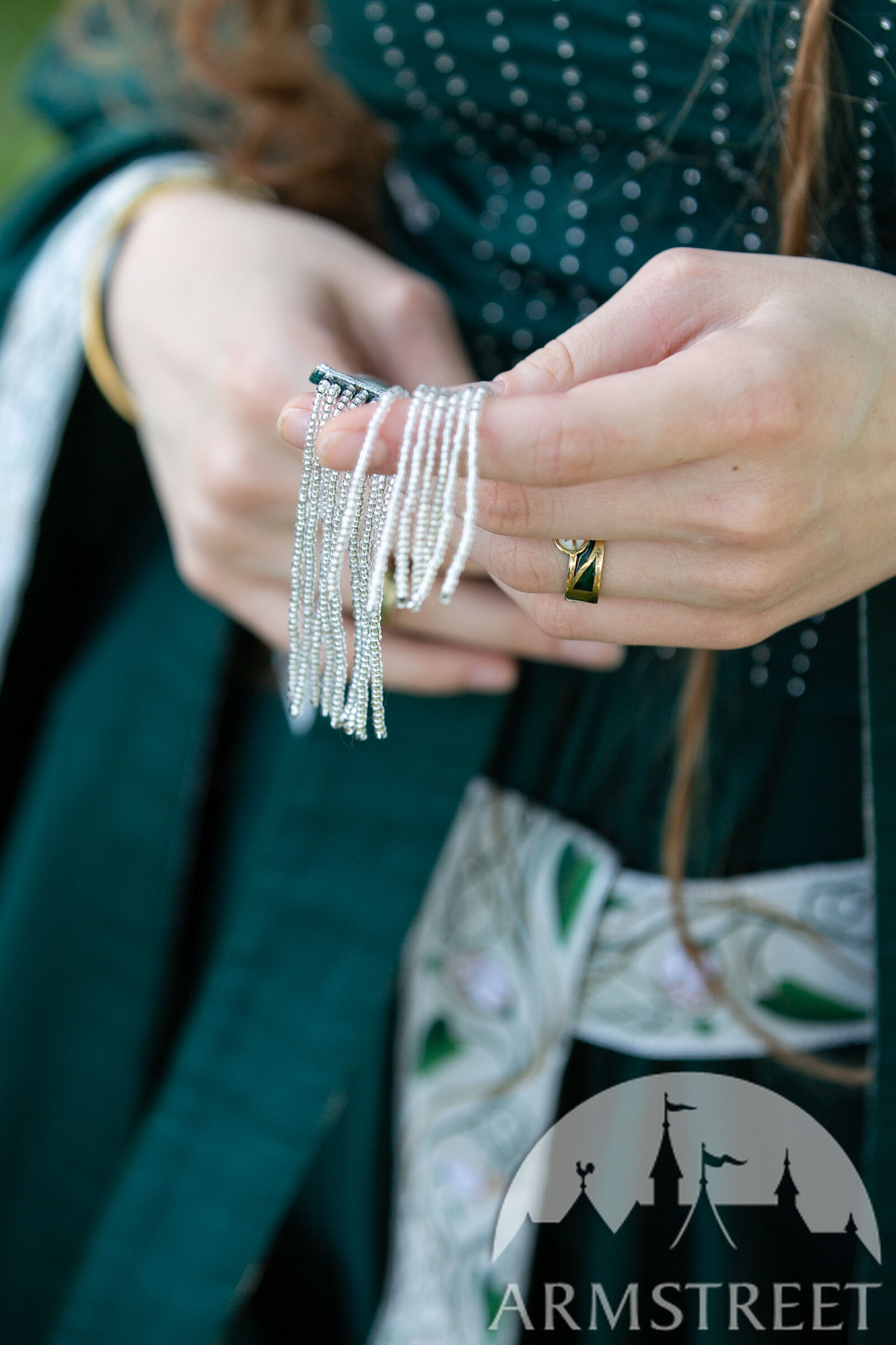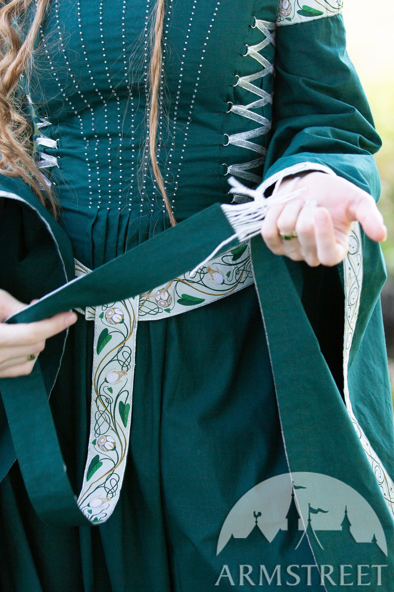 Chaque élément de nos costumes médiévaux est confectionné avec soin et une grande attention aux détails pour sublimer l'occasion spéciale où il est destiné à briller. Loin des costumes de reconstitution historique classiques choisis pour leur aspect pratique, ce sont de véritables trésors, ornés de mille feux. Inspirés par les nénuphars et les motifs Art nouveau, les passements réalisés sur mesure décorent l'encolure, l'ourlet, la ceinture et les manches. Les plis du corsage scintillent de perles, et les manches en chiffon de soie brillent doucement comme un clair de lune. Ce même éclat subtil se retrouve dans le voile de soie fluide, qui parachève l'ensemble d'une touche de légèreté et de féerie. Le voile est de taille unique et mesure 1,5 m de diamètre.