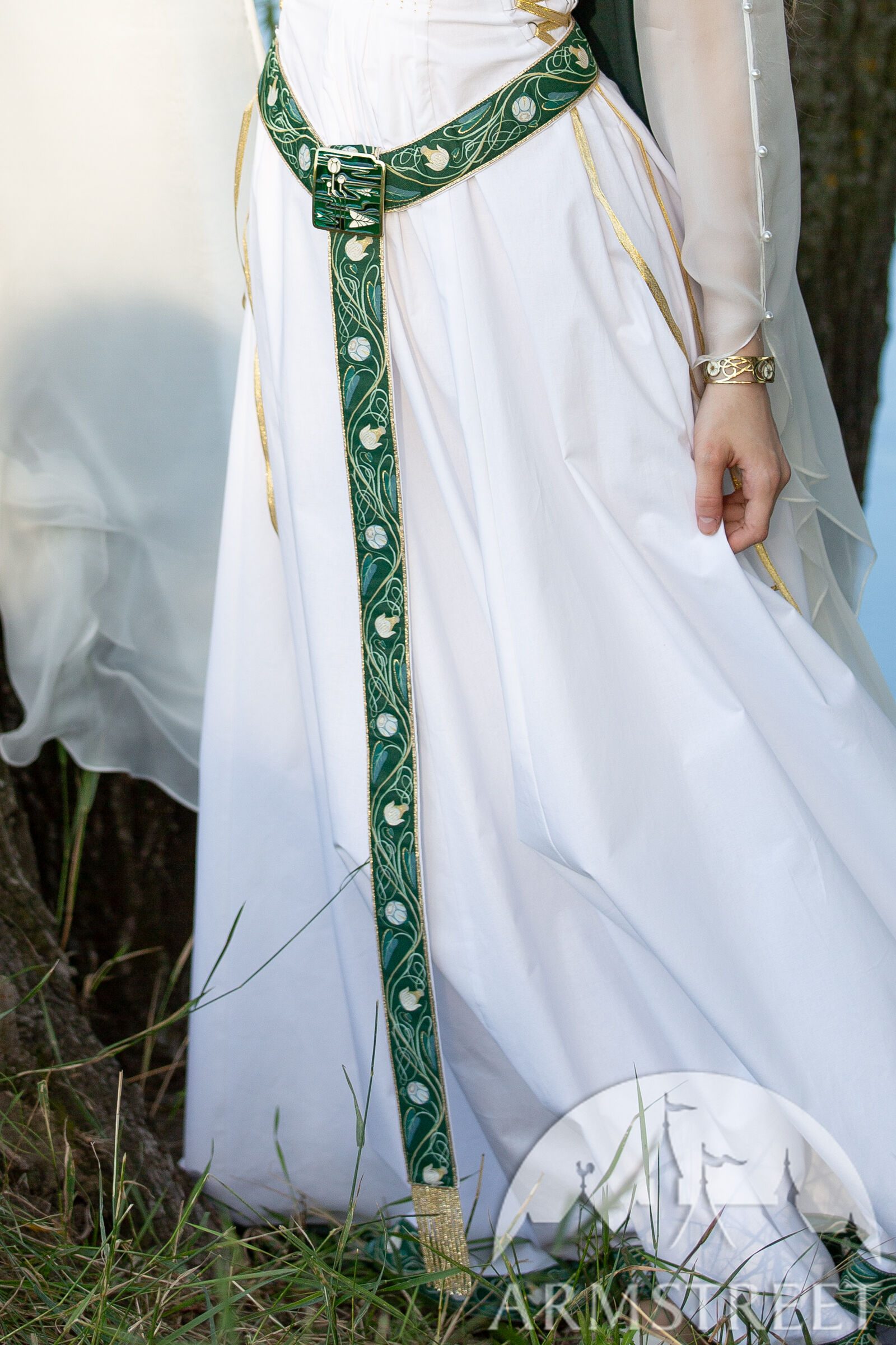 Au cœur de cet ensemble se trouve une robe de mariée féérique, rayonnant d'élégance et de charme. Son large décolleté, typique des vêtements féminins de la Renaissance, est orné de fausses perles et de motifs délicats, lui conférant à la fois pudeur et féerie. Le corsage ajusté, orné de plis et de perles, flatte toutes les silhouettes, tandis que le laçage latéral assure un maintien parfait. Les manches courtes et décoratives laissent place à de longues manches fluides en chiffon de soie naturelle, si légères qu'elles semblent flotter au moindre souffle de vent. La jupe, longue et ample, est composée de panneaux supplémentaires qui créent une silhouette gracieuse et fluide, avec un ourlet d'une longueur impressionnante de 8 à 9 mètres. Parfaite en elle-même, cette robe de mariée médiévale est sublimée par une ceinture en tissu. Celle-ci harmonise l'ensemble, ajoutant élégance et charme. Drapée jusqu'au sol, la ceinture apporte une touche de féérique et de fluidité à votre allure. Confectionnée en popeline de coton doux, cette ceinture est ornée d'un passement en soutache et d'une frange perlée de 9 cm. Sa forme parfaitement élaborée assure un ajustement impeccable à chaque fois, tandis que sa fermeture à bouton dissimulé lui confère l'allure d'une ceinture médiévale avec un confort moderne.