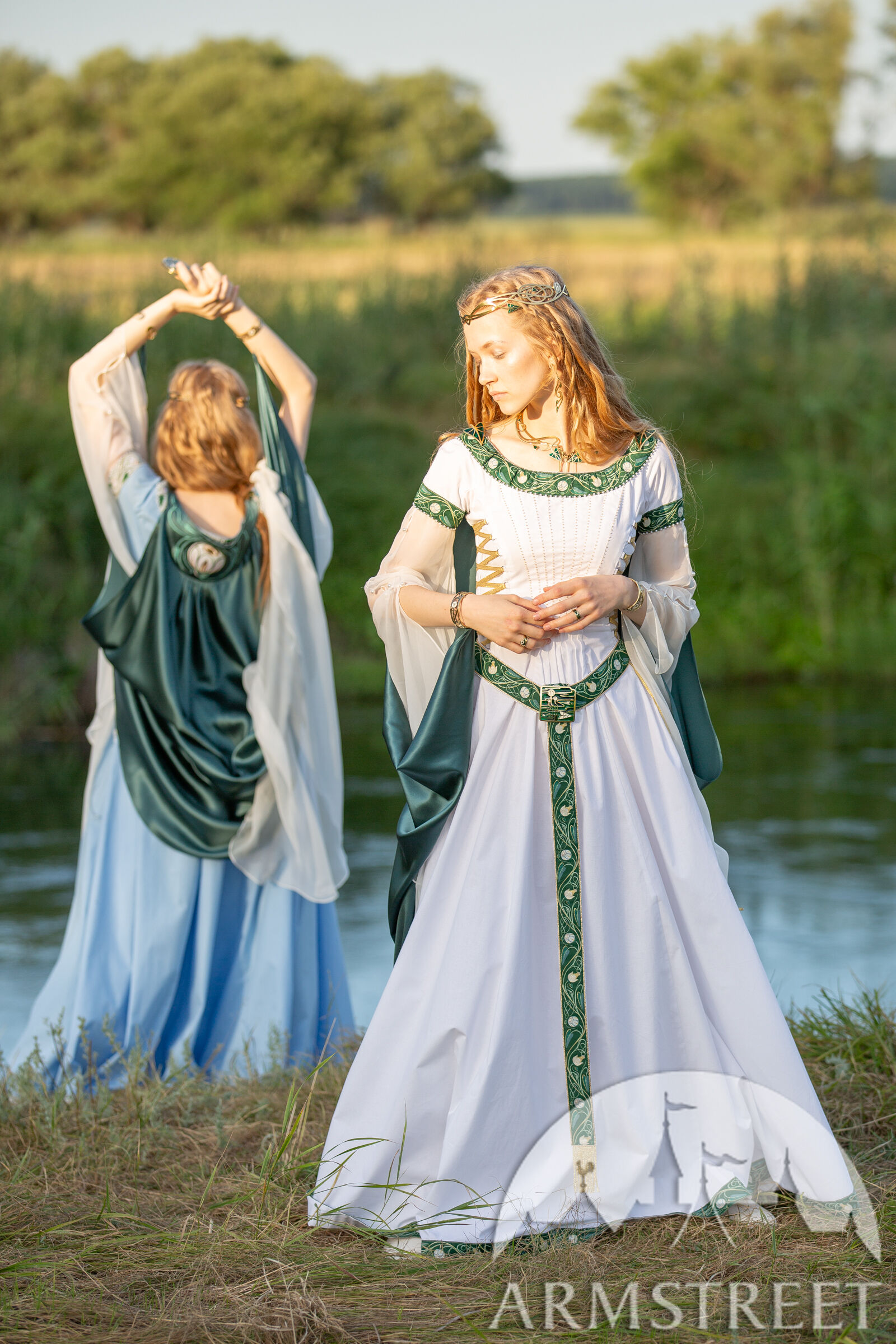 Il était une fois... Inspirés par les nénuphars et les contes elfiques, nous avons créé une série d'articles d'une beauté et d'une délicatesse rares. Aujourd'hui, le costume de mariage médiéval vient couronner cette aventure que nous avions entreprise il y a longtemps. La collection « Fleurs d'Eau » allie des tissus doux et fluides, des motifs intemporels et des détails enchanteurs, la rendant idéale pour célébrer l'amour au bord d'un lac paisible, sous des arbres centenaires ou dans tout autre décor féérique.