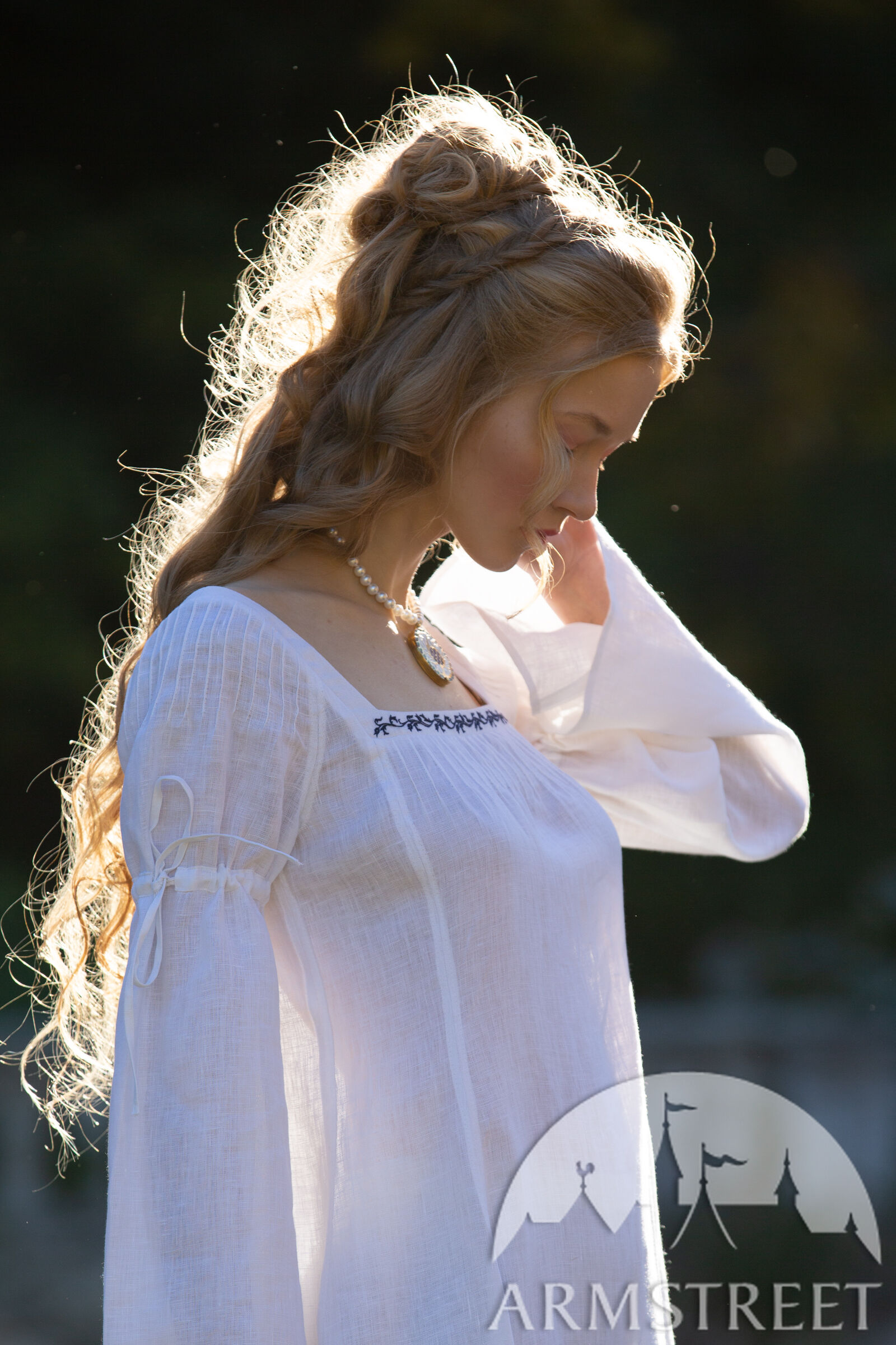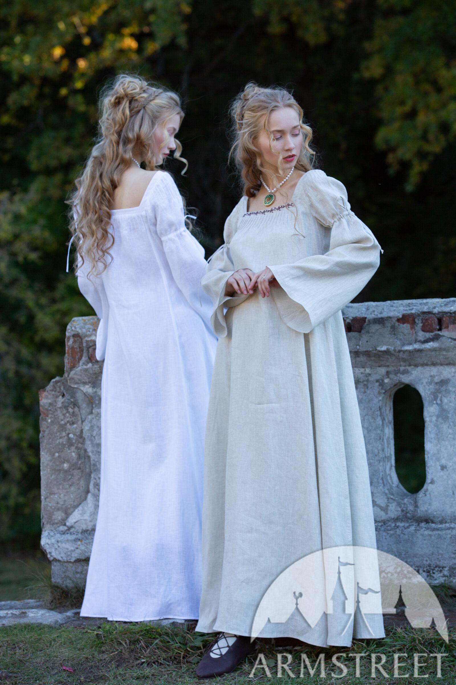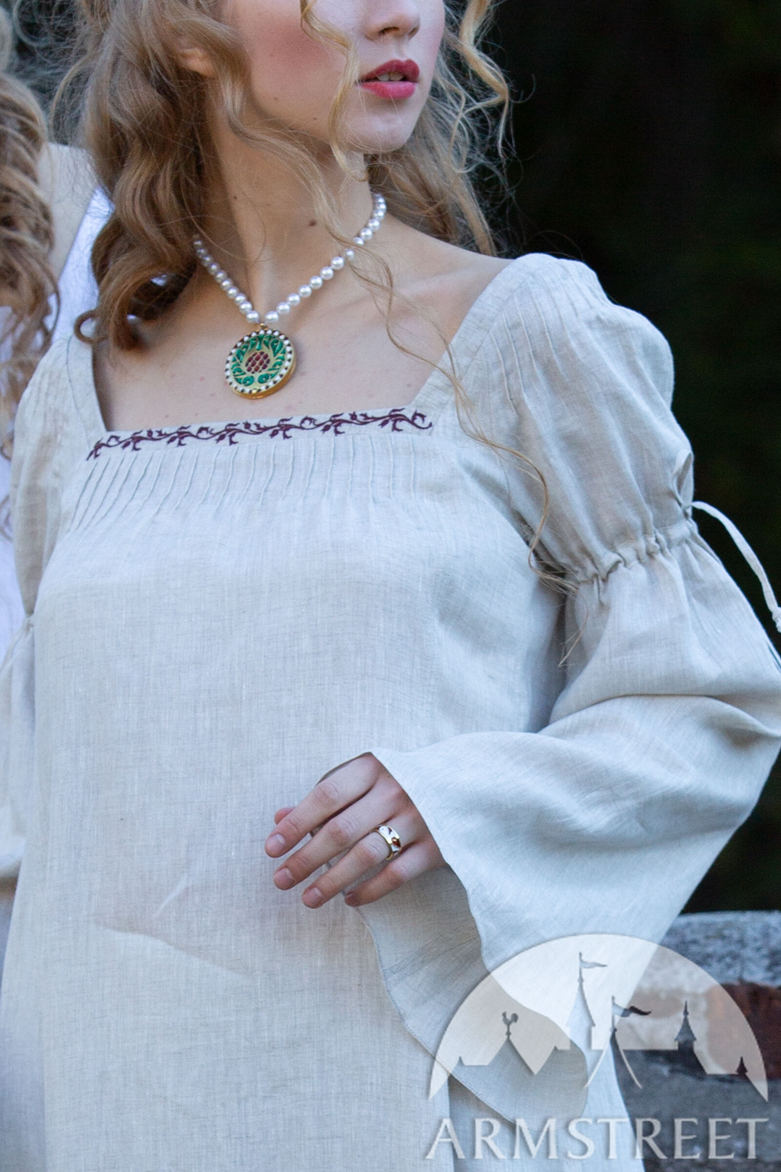 Ce type de chemise se portait traditionnellement sous la robe extérieure pour la protéger de l'usure et de la transpiration, tout en apportant volume et authenticité aux costumes de la Renaissance. Confectionnée en lin fin et doux, elle présente des manches cloche avec des cordons en lin, de petits plis aux épaules et une encolure carrée. Inspirée par la grâce et la beauté des vêtements des dames de la noblesse, elle est dotée de goussets supplémentaires pour créer une jupe volumineuse. Son délicat motif de feuillage brodé à la main le long de l'encolure ajoute une touche subtile et luxueuse.