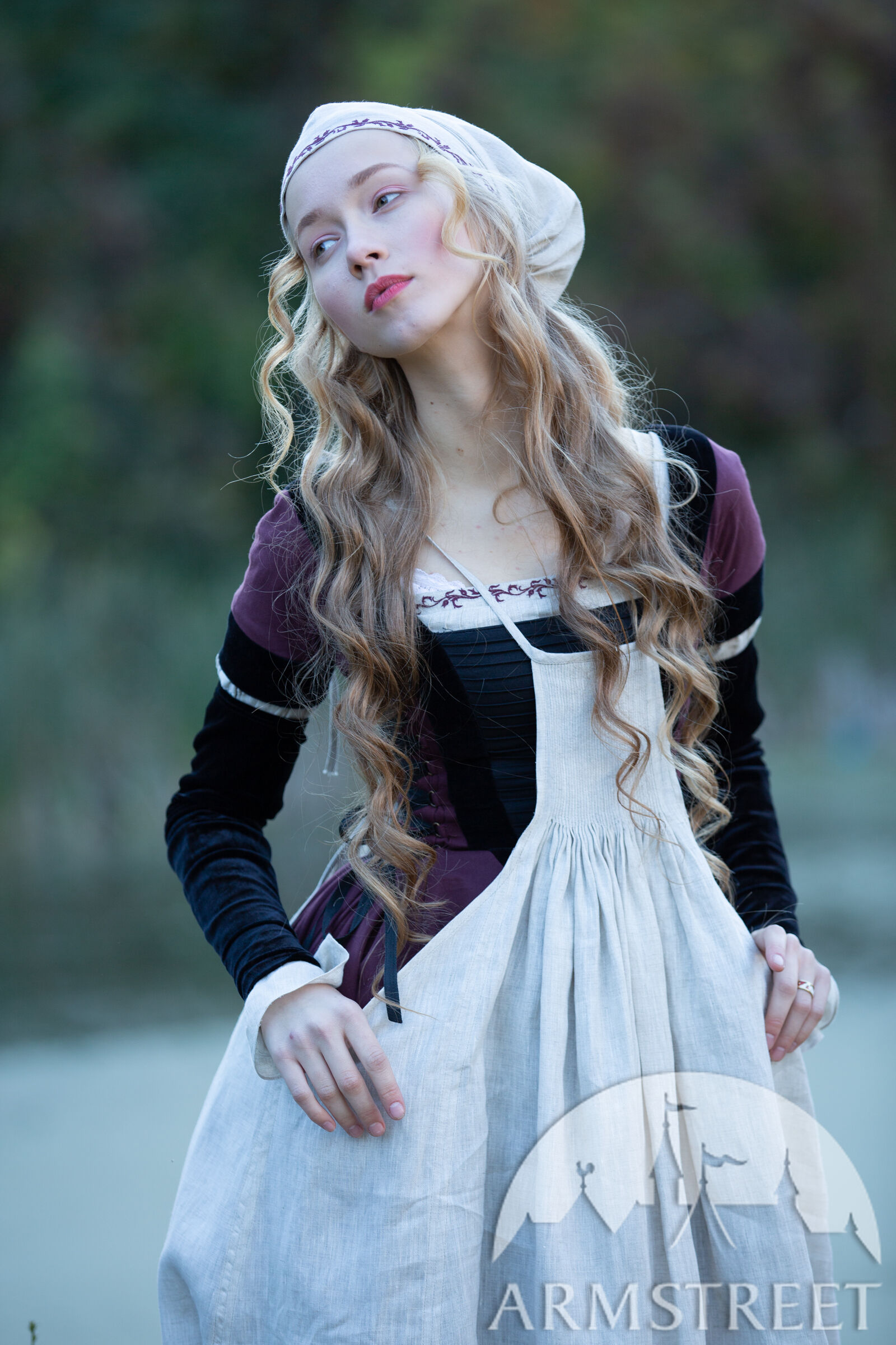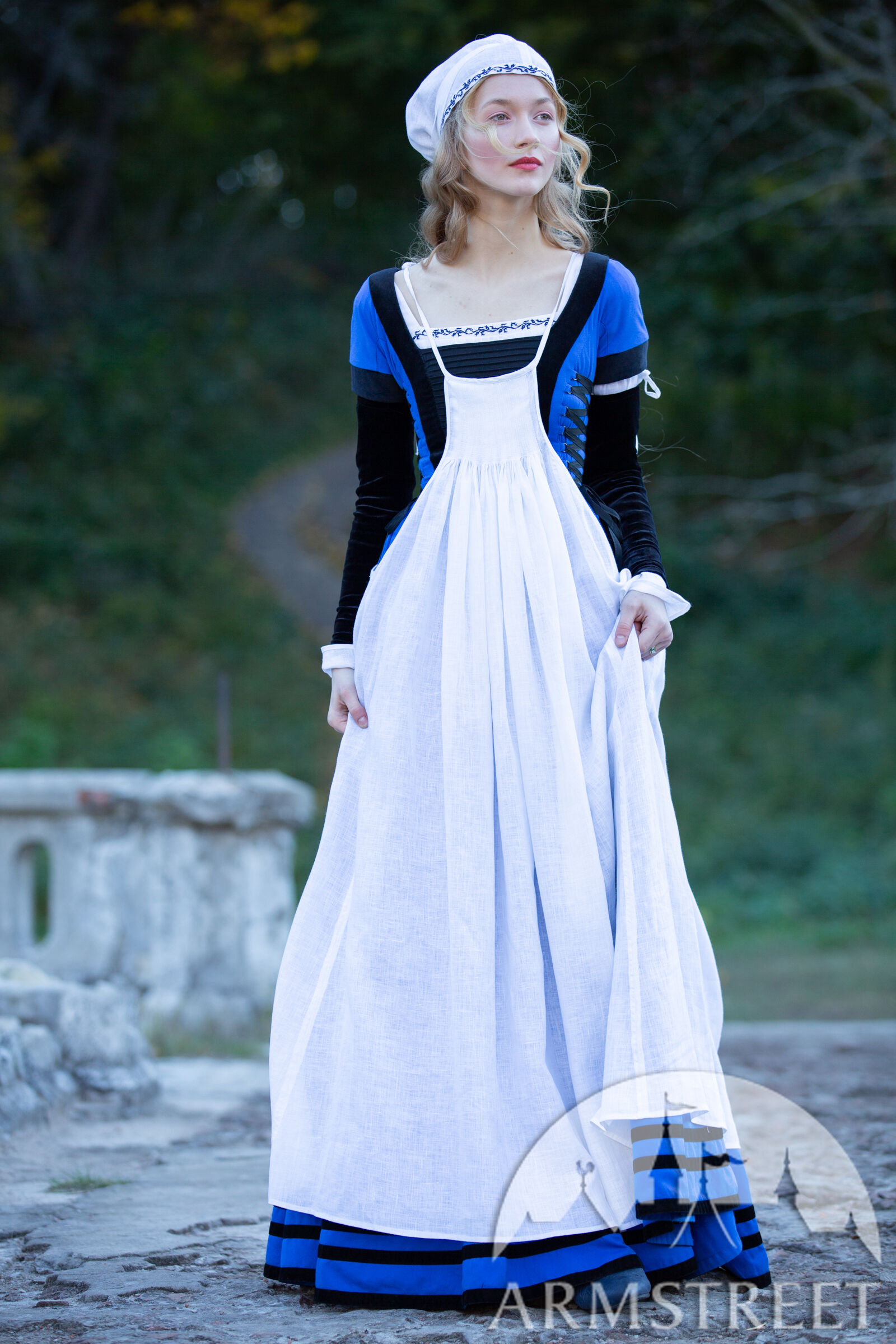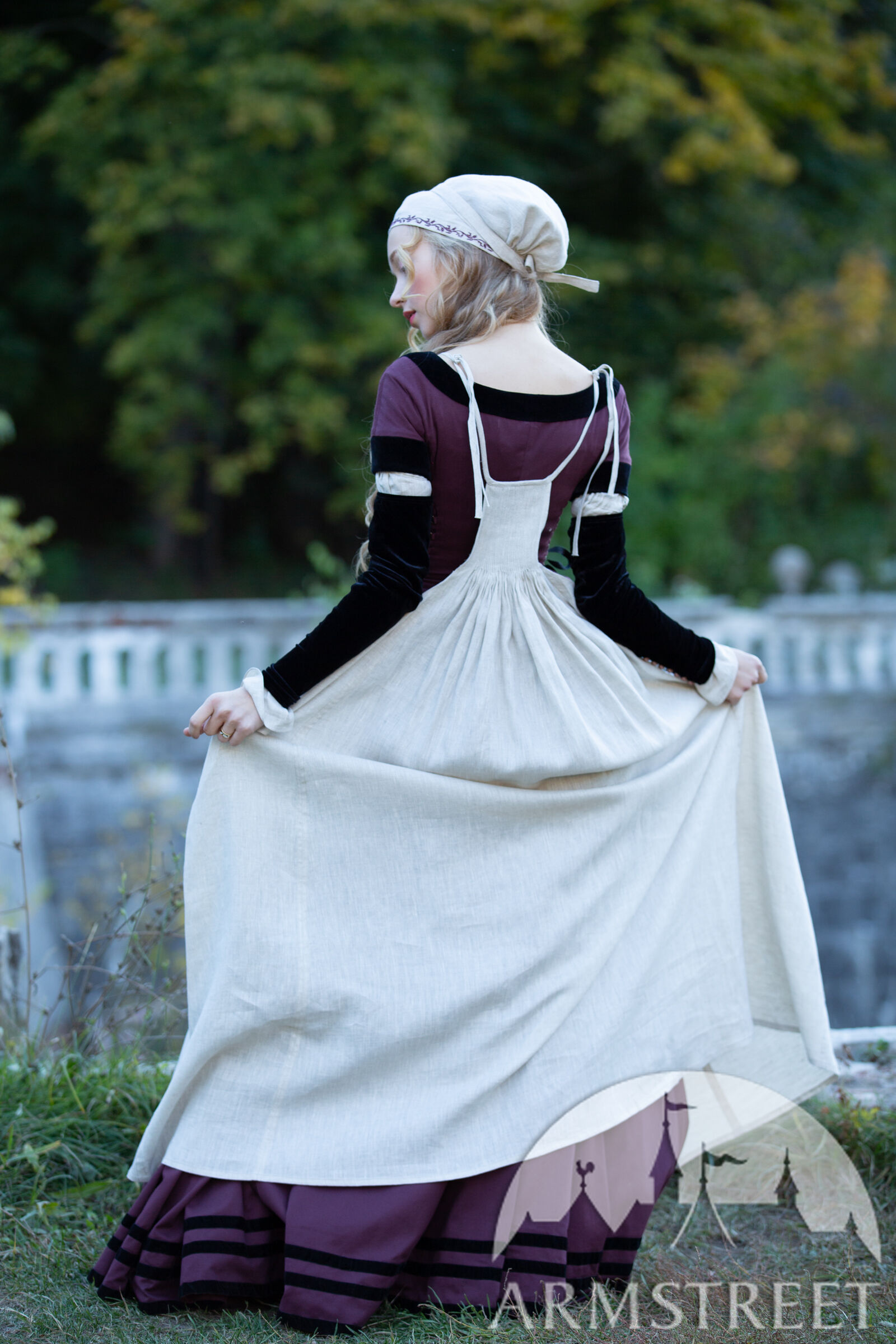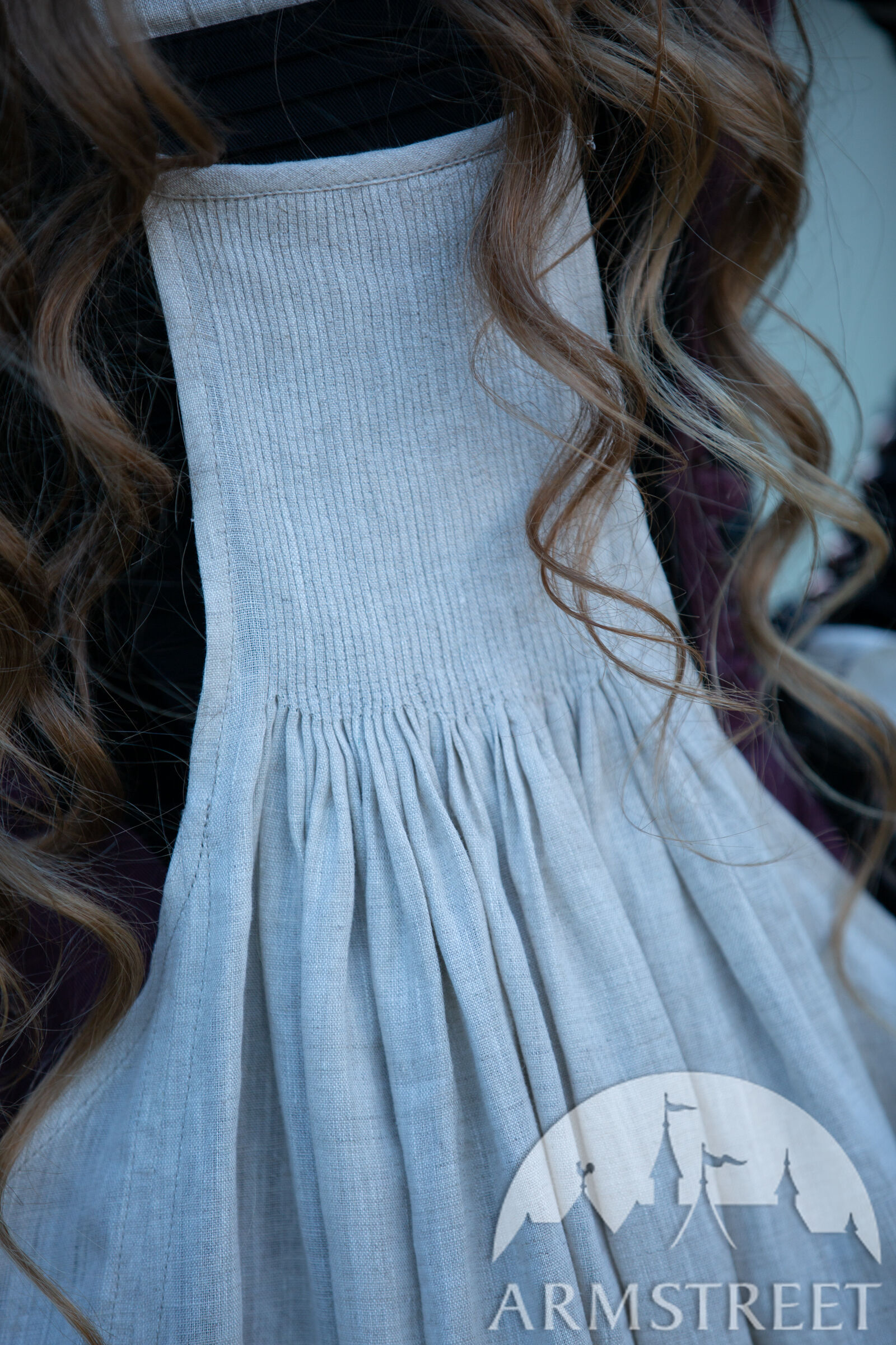 Ce tablier convient aux costumes Renaissance pour femmes incarnant différents rôles, tels que les fermières, les sages-femmes et les marchandes. Porté comme couche extérieure, il protège la robe des salissures et de l'usure sans la dissimuler entièrement : l'ourlet du bas, l'encolure et le laçage latéral de la partie centrale de cette tenue Renaissance restent visibles. Contrairement aux tabliers modernes, il couvre l'avant et l'arrière et possède des bretelles réglables pour un confort optimal. Ce tablier est vraiment volumineux – 1,5 mètre de tissu froncé en de minuscules plis de 2 mm sur la poitrine, donnant une ligne d’ourlet d’environ 4 mètres. Confectionné en lin fin, il est extrêmement pratique et n'entrave pas les mouvements.