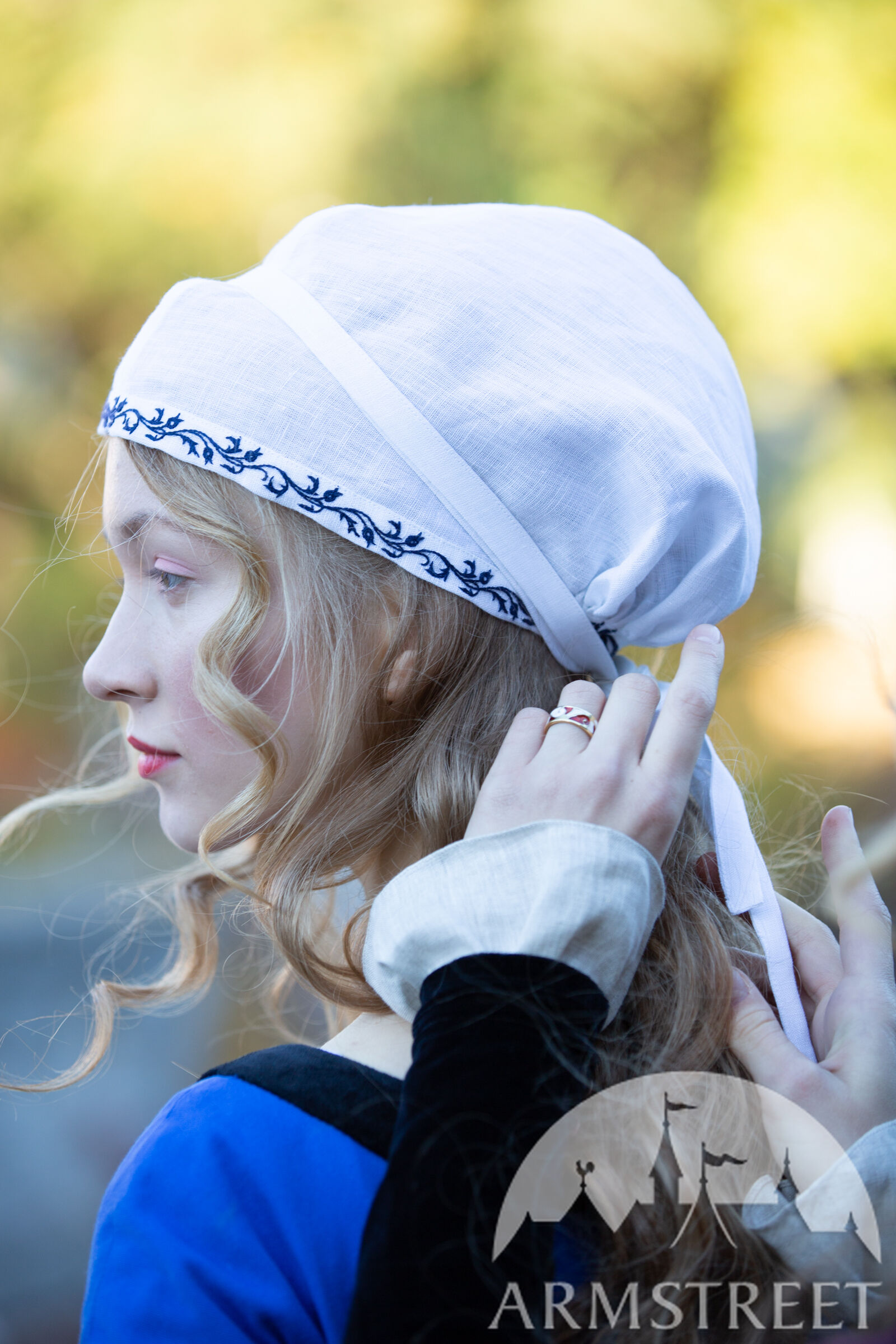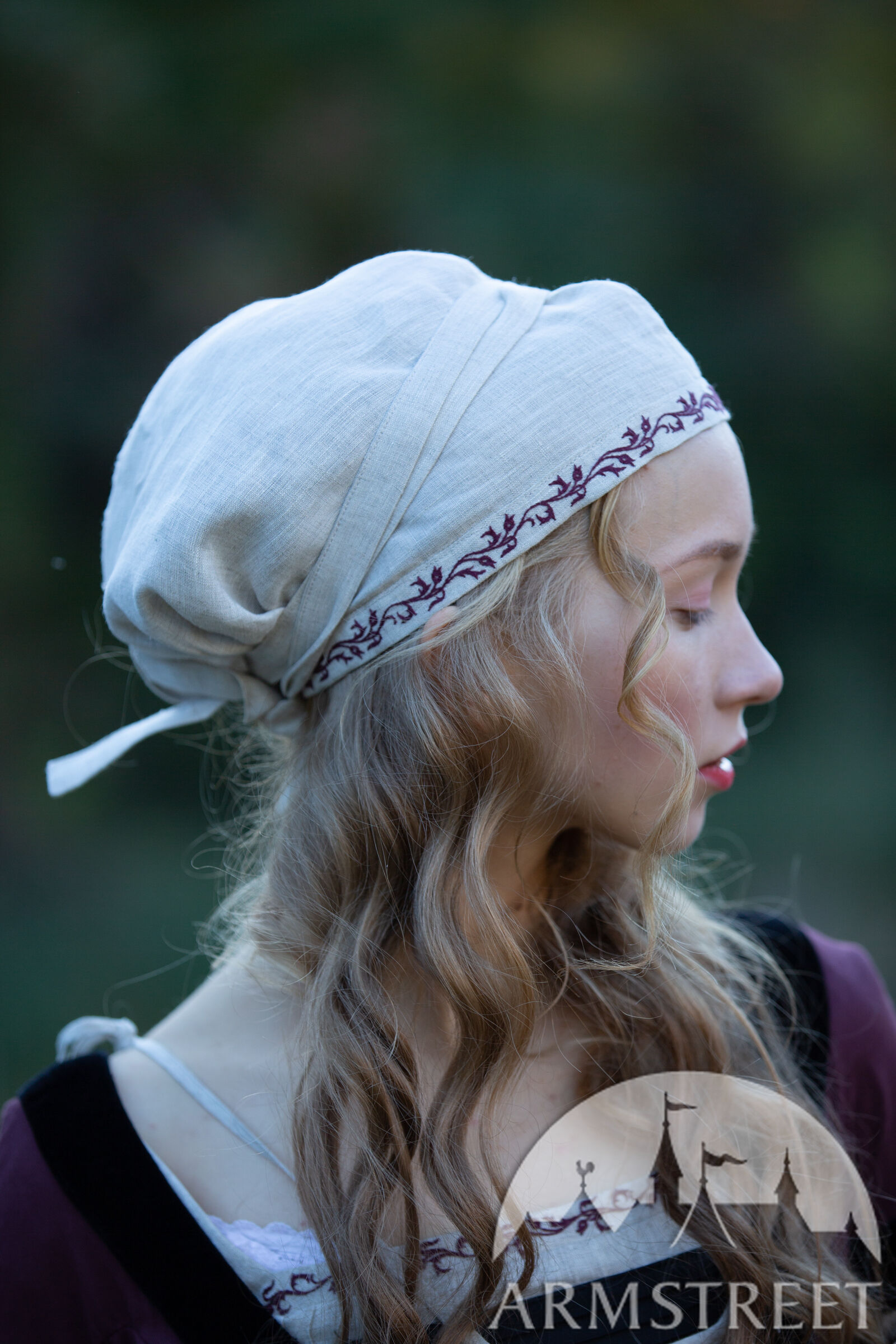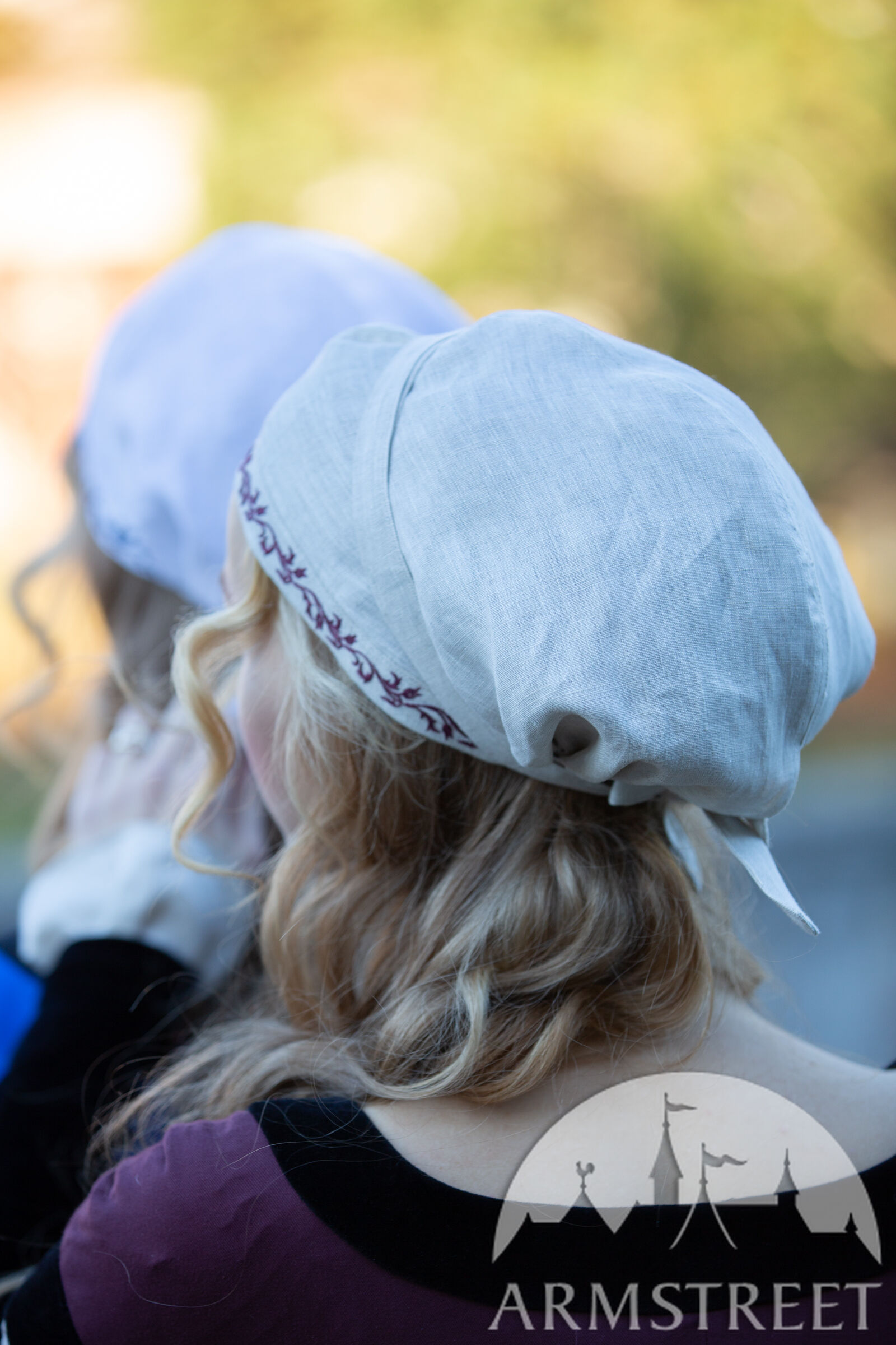 Cette coiffe d'inspiration historique est dérivée du bonnet Sainte Brigitte représenté dans la Bible de Maciejowski (XIIIe siècle). Confectionnée en lin fin, elle présente une couture centrale et un volume généreux à l'arrière. Ce couvre-chef peut accueillir tous les types de cheveux, quelle que soit la longueur de vos tresses, et les maintient en place grâce à deux longs cordons. Un magnifique ornement brodé à la main, le long de la ligne des cheveux, est assorti à celui de l'encolure de la chemise. Vous pouvez la porter seule ou sous un chapeau. Cette coiffe convient à divers personnages médiévaux, des paysans aux nobles.