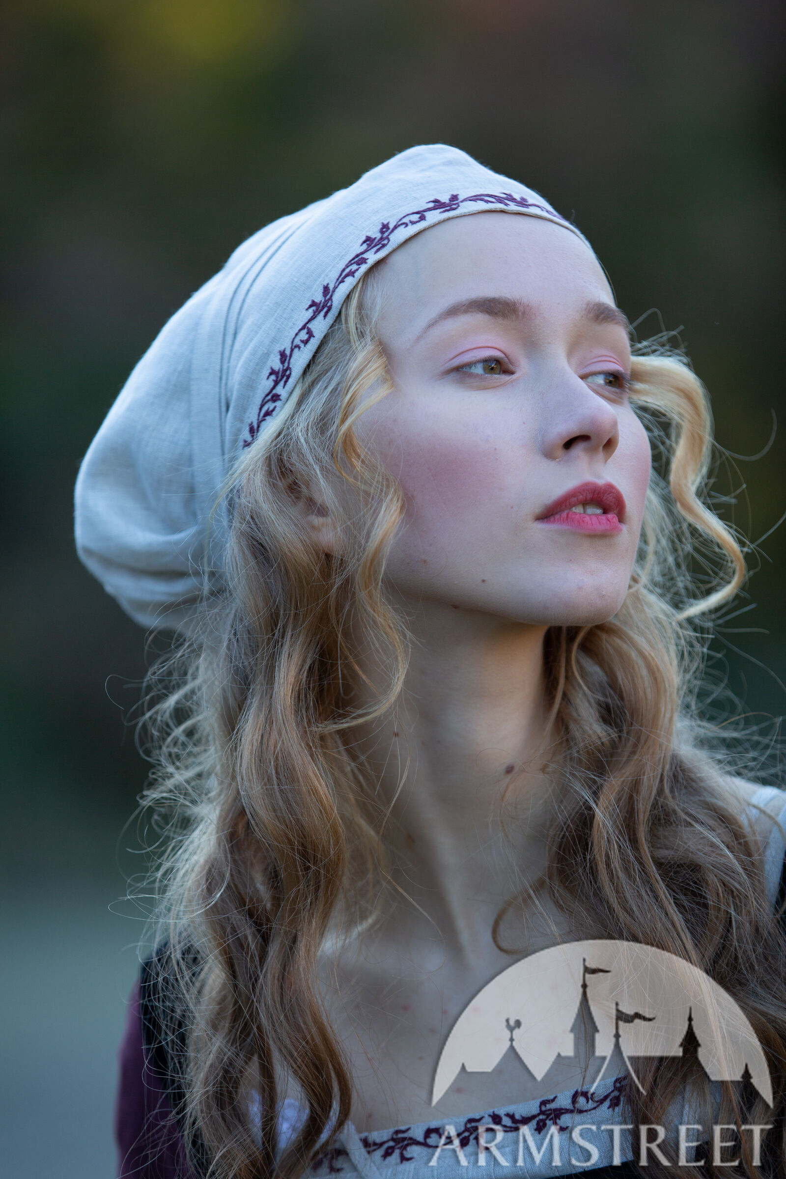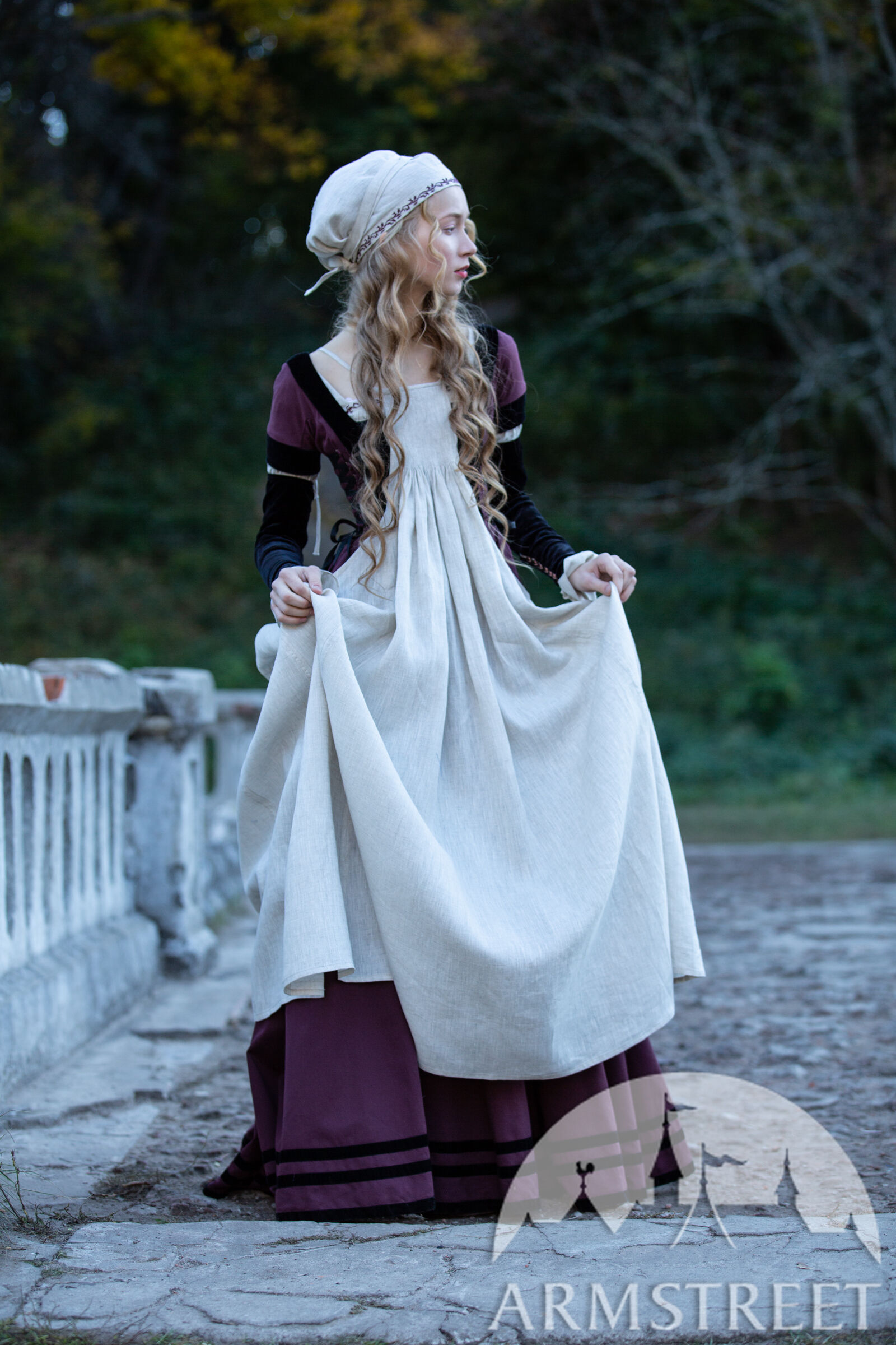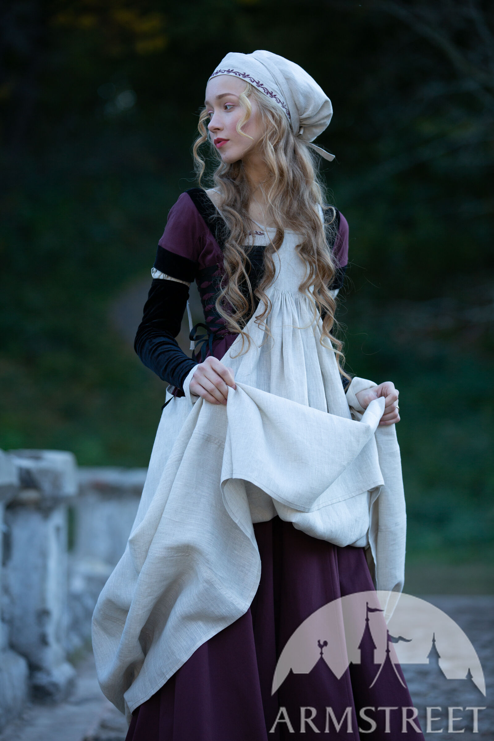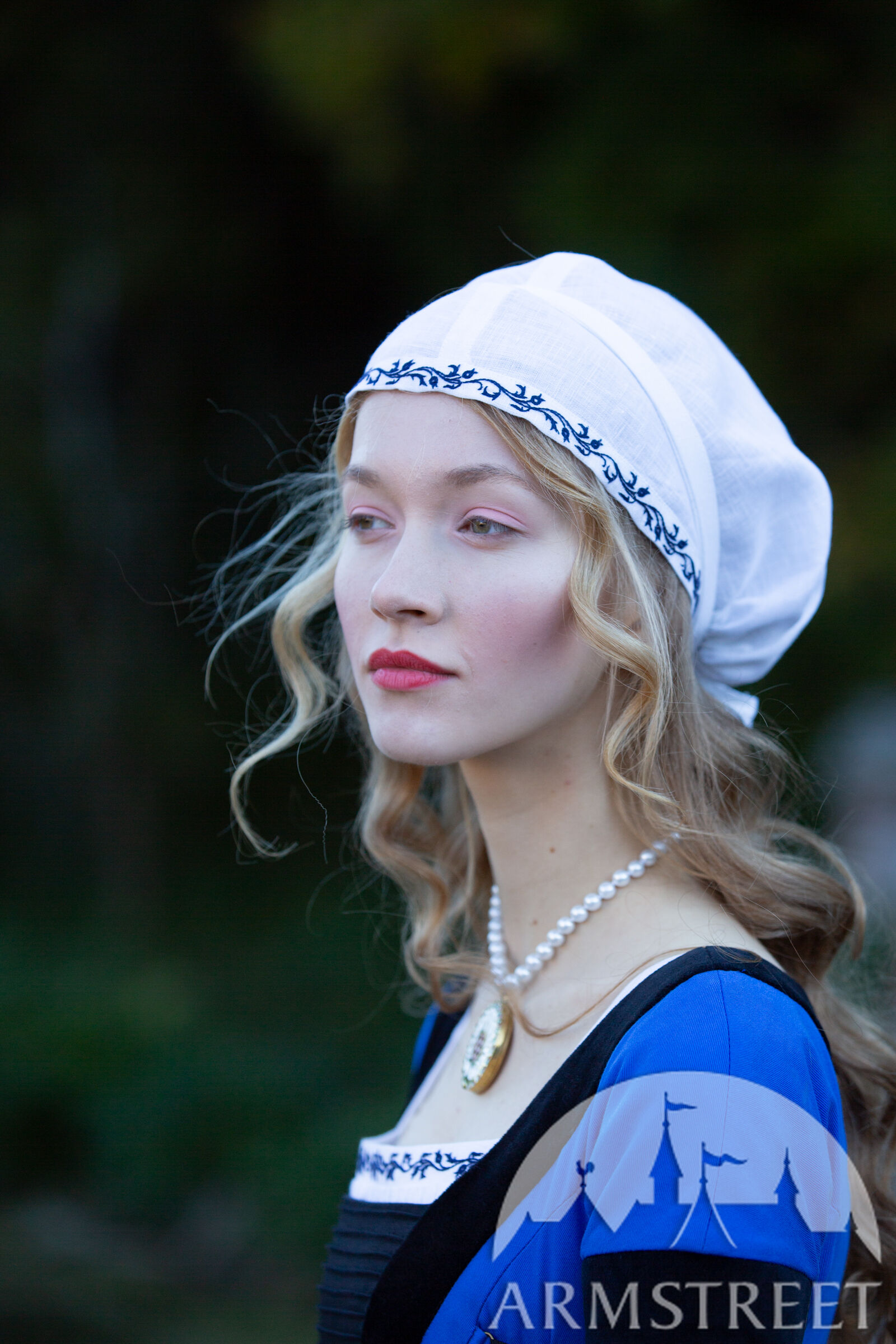 Cette coiffe d'inspiration historique est dérivée du bonnet Sainte Brigitte représenté dans la Bible de Maciejowski (XIIIe siècle). Confectionnée en lin fin, elle présente une couture centrale et un volume généreux à l'arrière. Ce couvre-chef peut accueillir tous les types de cheveux, quelle que soit la longueur de vos tresses, et les maintient en place grâce à deux longs cordons. Un magnifique ornement brodé à la main, le long de la ligne des cheveux, est assorti à celui de l'encolure de la chemise. Vous pouvez la porter seule ou sous un chapeau. Cette coiffe convient à divers personnages médiévaux, des paysans aux nobles.