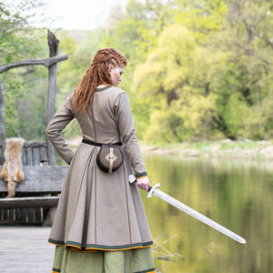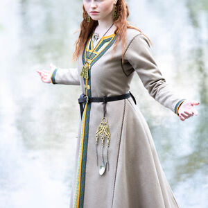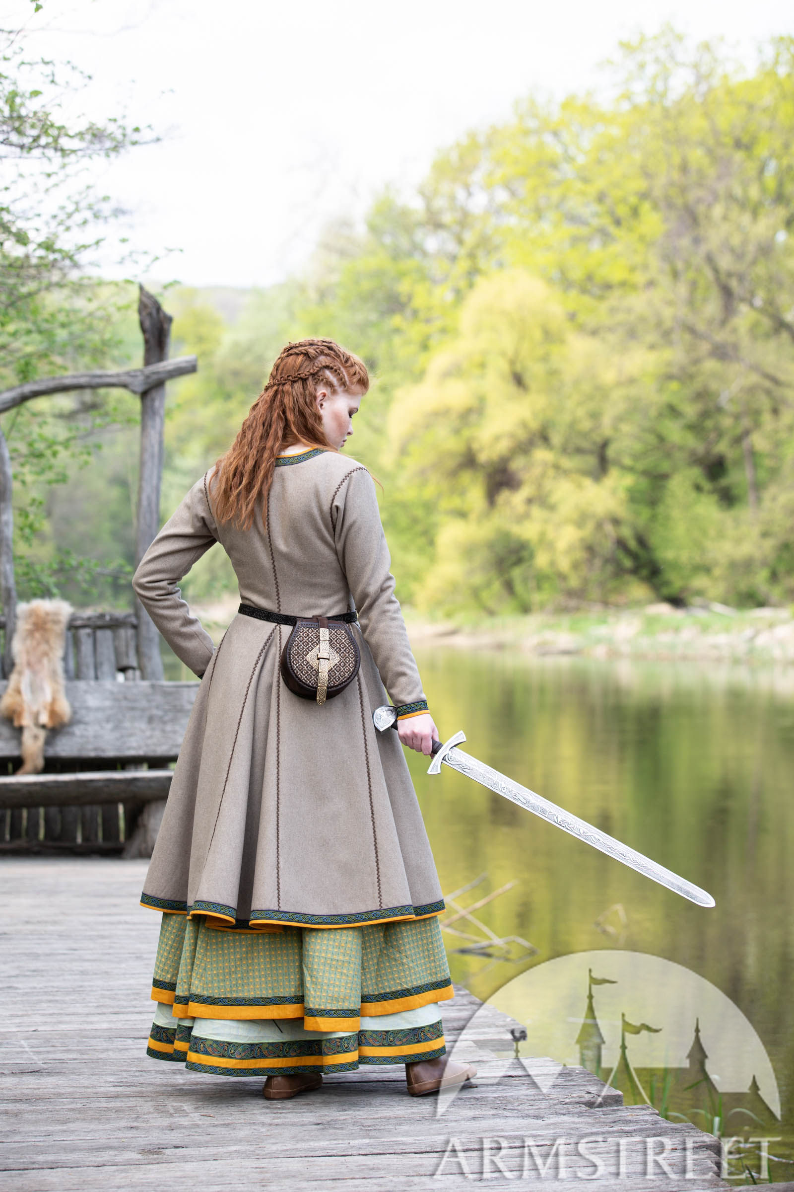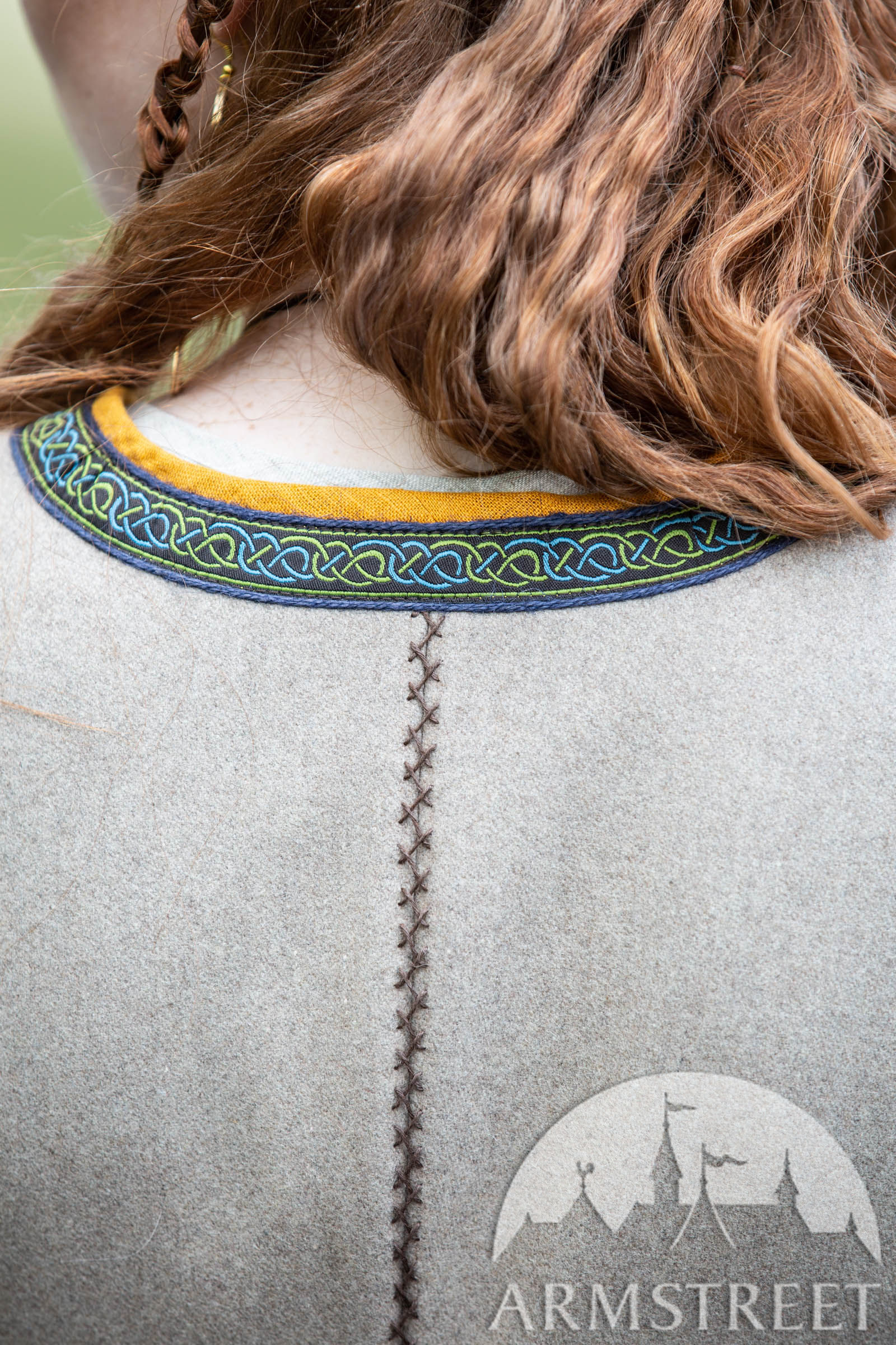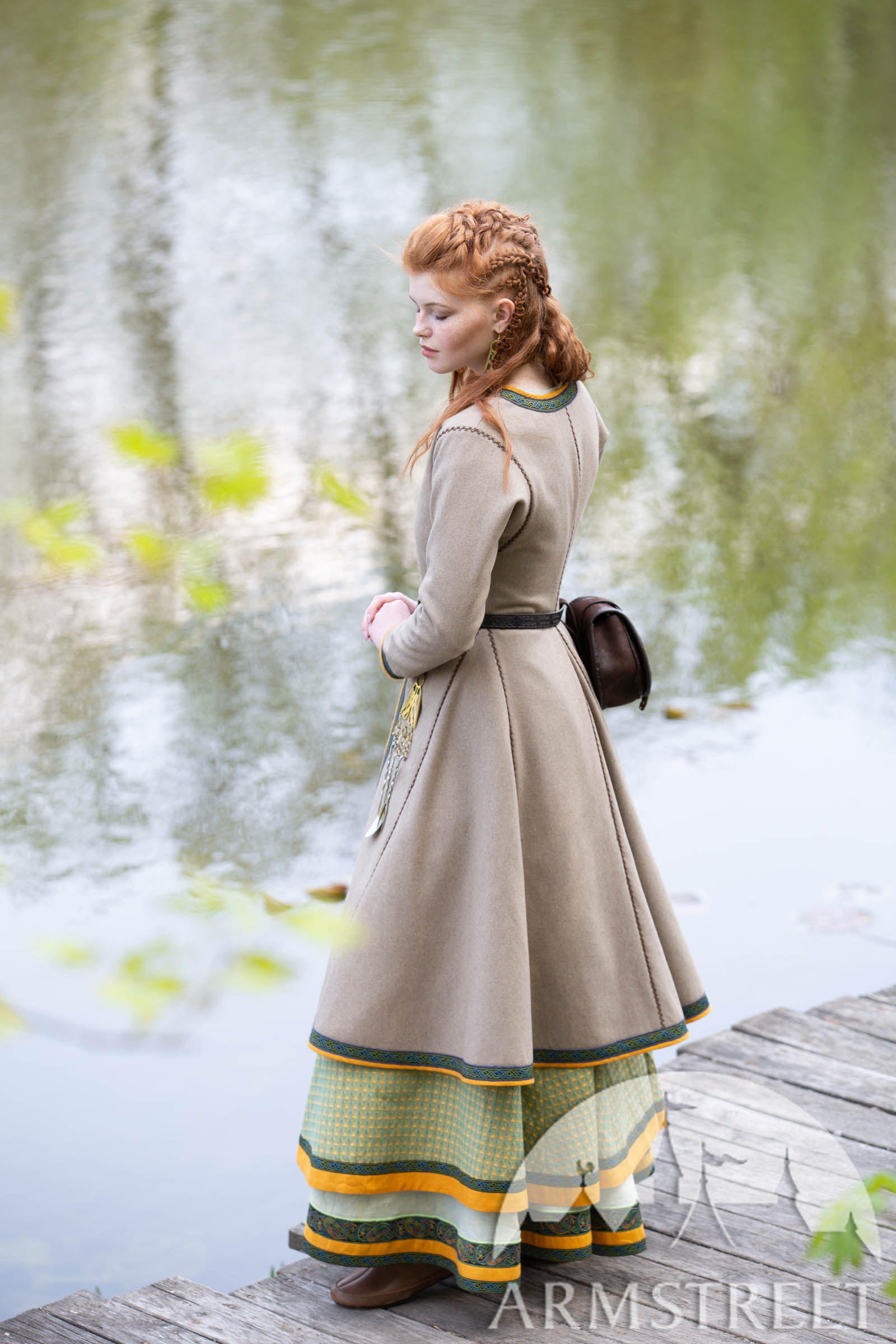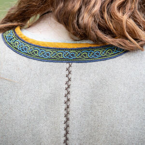 Les bords du caftan (col, manchettes et tous les autres ourlets) sont décorés d’une bande de lin jaune et d’une couture brodée élégante pour vous protéger des mauvais esprits et fournir au manteau un aspect raffiné. Le manteau est un habit habituellement porté par-dessus les robes et tuniques pour protéger contre le vent et vous tenir au chaud. C’est la couche supérieure de la tenue et nous y avons conçu des motifs historiques avec de légères modifications pour le rapprocher et mettre en valeur le corps moderne. Le choix de la laine était évident pour ce caftan – elle repousse bien l’eau, elle est chaude et ce tissu naturel était souvent utilisé dans les vêtements médiévaux. Cette laine notamment est très chaude et douce et a l’air formidable. L’article a été entièrement doublée avec soin du lin 100% naturel, l’étoffe respirable qui fournit au caftan de la structure et est très agréable contre la peau.