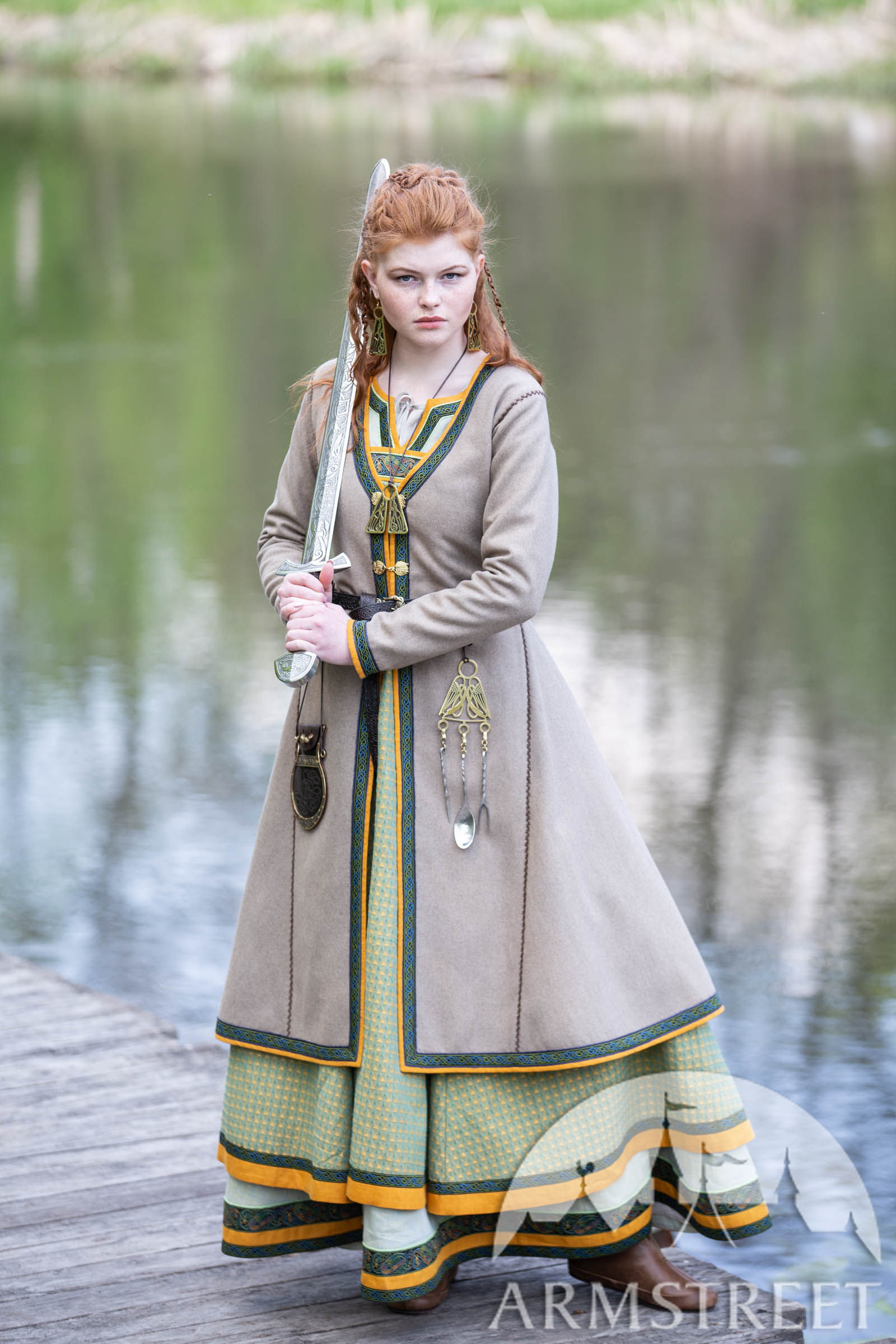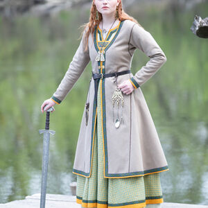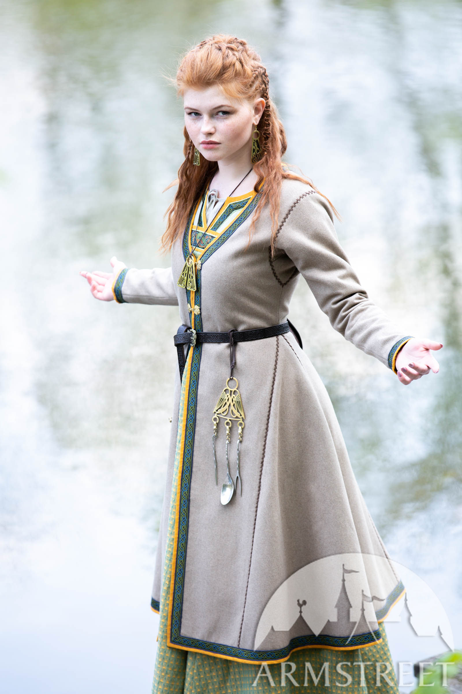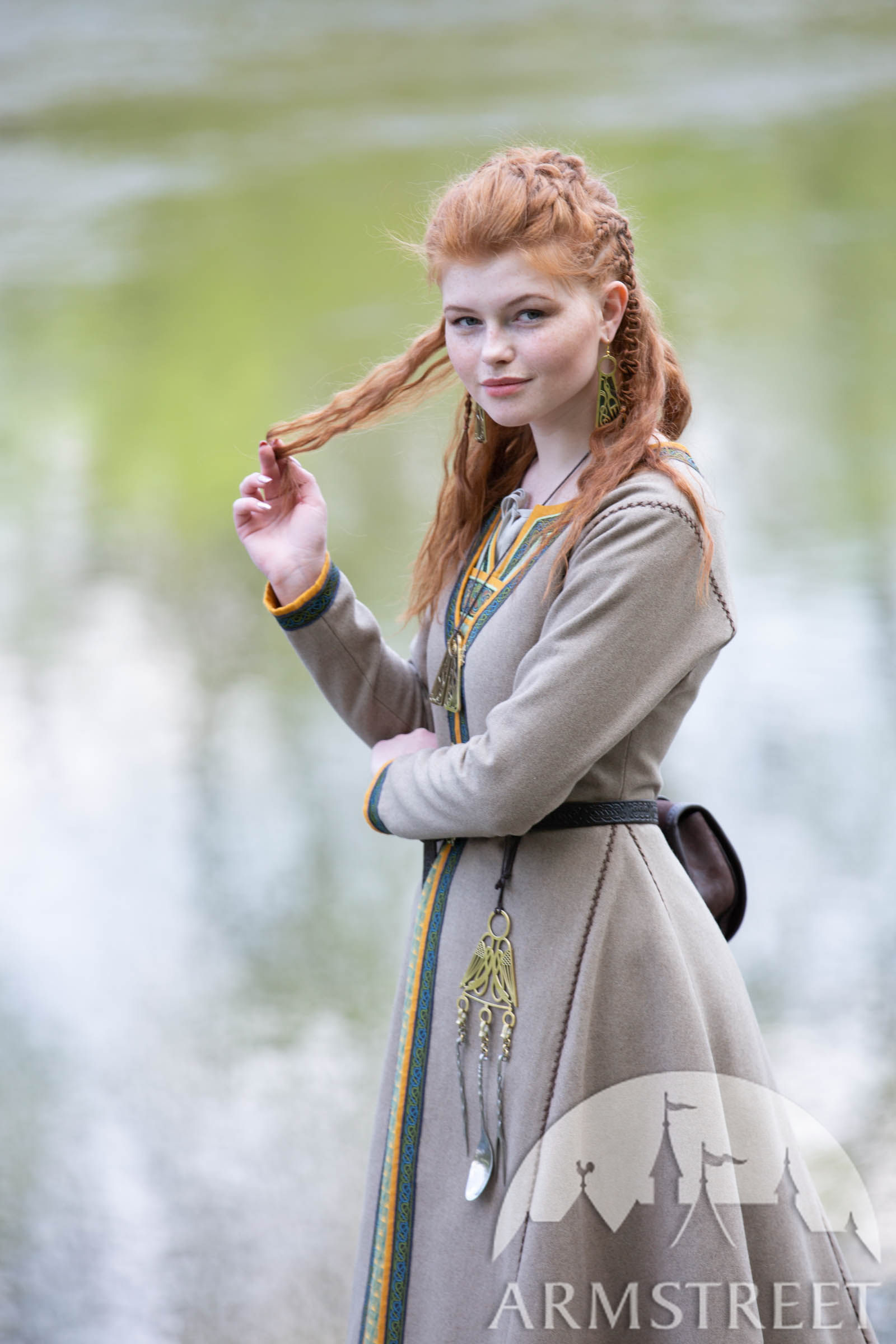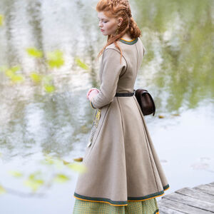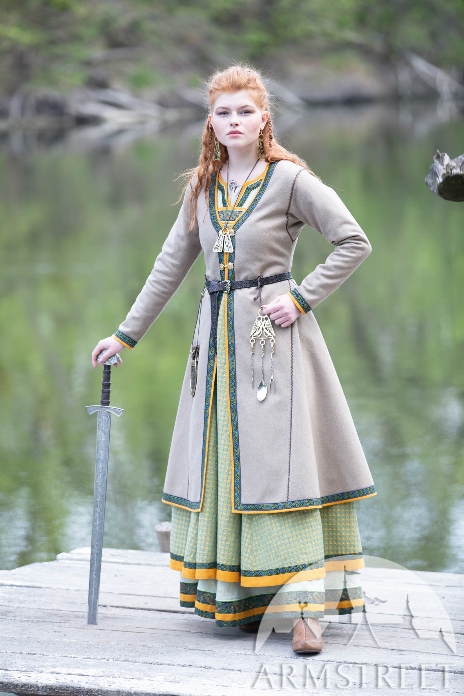 Les bords du caftan (col, manchettes et tous les autres ourlets) sont décorés d’une bande de lin jaune et d’une couture brodée élégante pour vous protéger des mauvais esprits et fournir au manteau un aspect raffiné. Le manteau est un habit habituellement porté par-dessus les robes et tuniques pour protéger contre le vent et vous tenir au chaud. C’est la couche supérieure de la tenue et nous y avons conçu des motifs historiques avec de légères modifications pour le rapprocher et mettre en valeur le corps moderne. Le choix de la laine était évident pour ce caftan – elle repousse bien l’eau, elle est chaude et ce tissu naturel était souvent utilisé dans les vêtements médiévaux. Cette laine notamment est très chaude et douce et a l’air formidable. L’article a été entièrement doublée avec soin du lin 100% naturel, l’étoffe respirable qui fournit au caftan de la structure et est très agréable contre la peau.