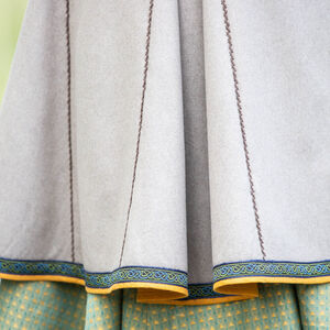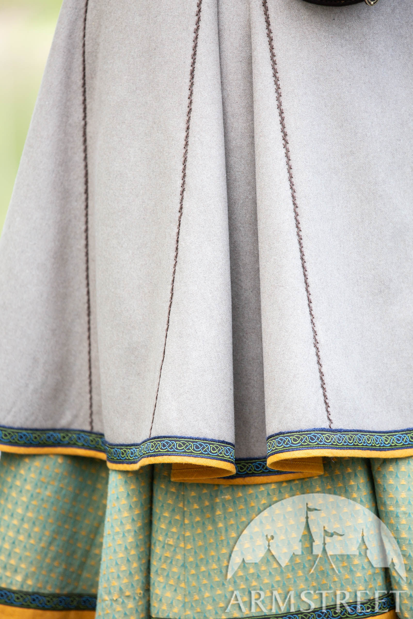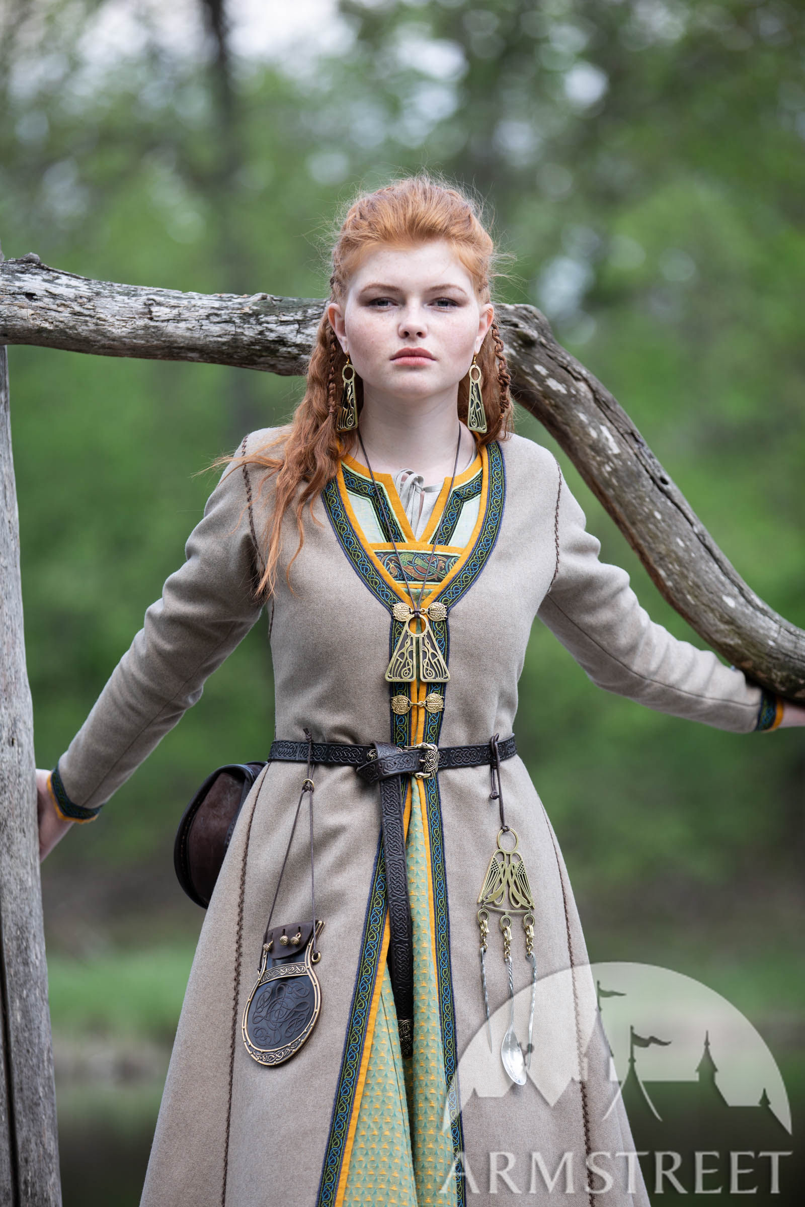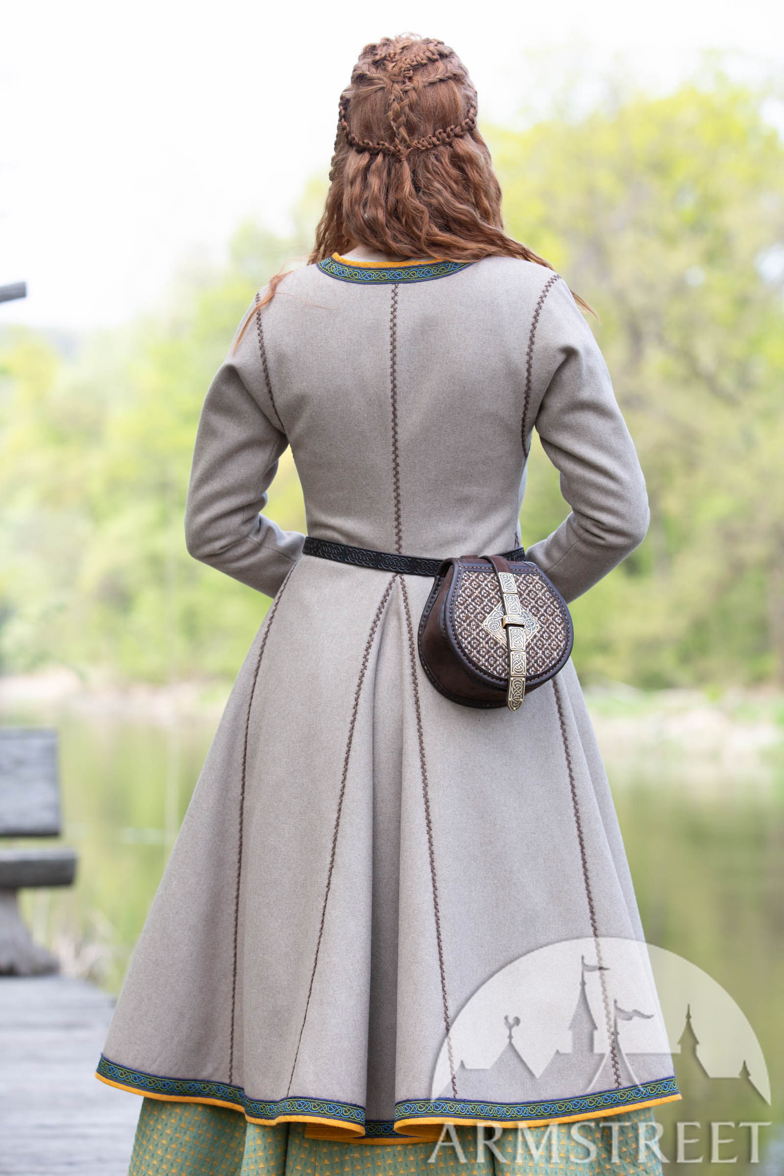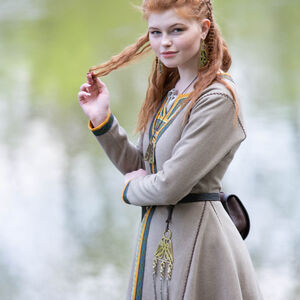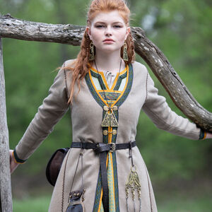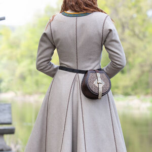 Les bords du caftan (col, manchettes et tous les autres ourlets) sont décorés d’une bande de lin jaune et d’une couture brodée élégante pour vous protéger des mauvais esprits et fournir au manteau un aspect raffiné. Le manteau est un habit habituellement porté par-dessus les robes et tuniques pour protéger contre le vent et vous tenir au chaud. C’est la couche supérieure de la tenue et nous y avons conçu des motifs historiques avec de légères modifications pour le rapprocher et mettre en valeur le corps moderne. Le choix de la laine était évident pour ce caftan – elle repousse bien l’eau, elle est chaude et ce tissu naturel était souvent utilisé dans les vêtements médiévaux. Cette laine notamment est très chaude et douce et a l’air formidable. L’article a été entièrement doublée avec soin du lin 100% naturel, l’étoffe respirable qui fournit au caftan de la structure et est très agréable contre la peau.