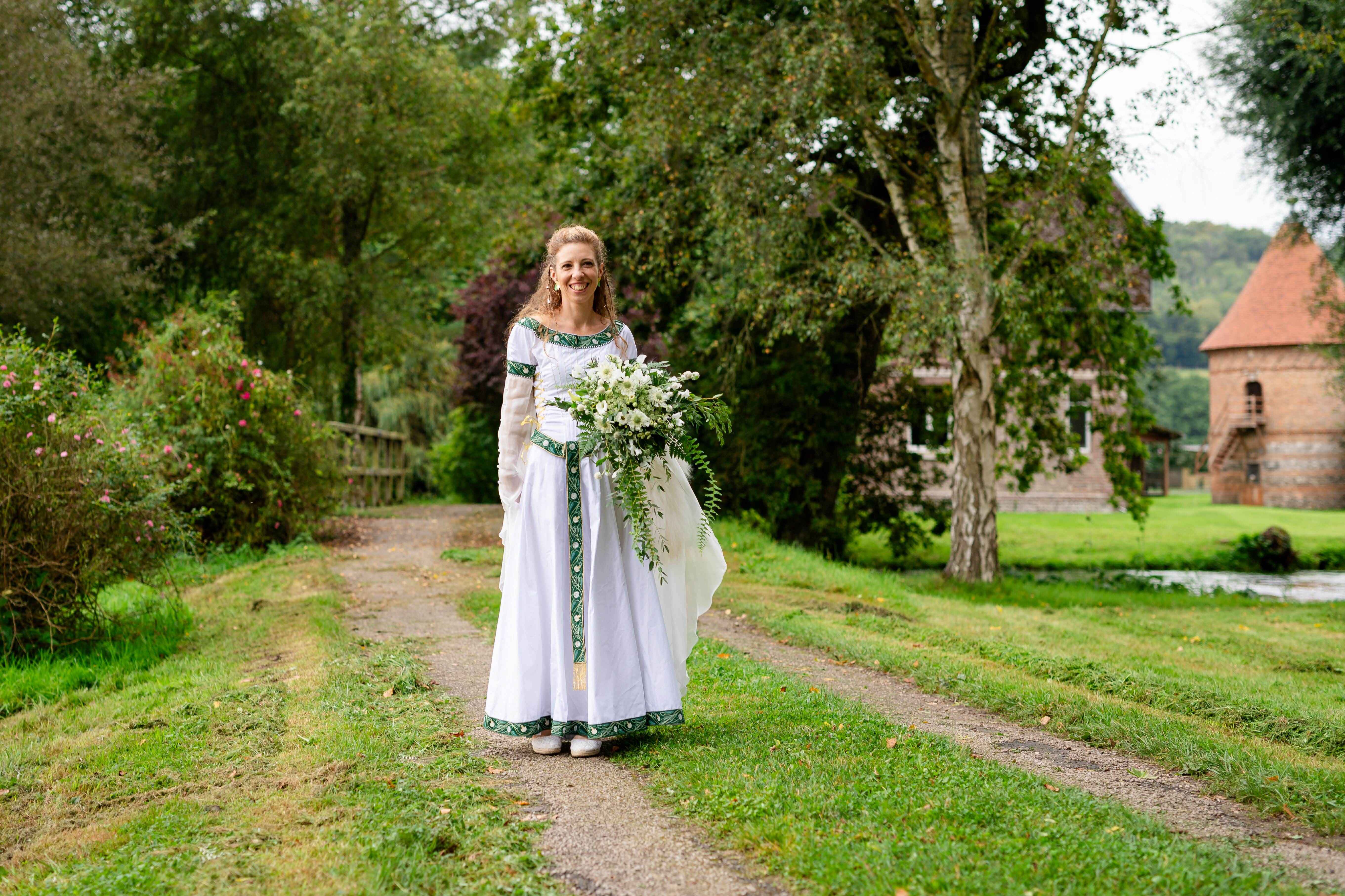 Cette robe a été créée tout d’abord en tant que robe de mariée. Inspirée par les silhouettes médiévales la robe a une encolure assez large qui n’est pourtant pas trop criarde. Le corset ajusté est décoré de plis, de billes et de fausses perles. Les manches courtes qui finissent par un magnifique passement se transforment en de ravissantes manches amples en forme de cloche qui rappellent les ailes. Il y a des anneaux de laçage sur les côtés qui permettent d’ajuster la robe juste à votre taille pour mettre en valeur vos formes (et si nécessaire de les ajuster proprement après une fête copieuse). La jupe tombe gracieusement jusqu’au sol et les pointes supplémentaires lui donnent 8 à 9 mètres de longueur à l’ourlet !