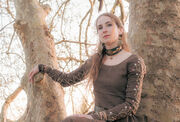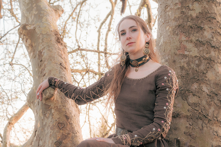 La coupe de cette robe est bien étroite et élégante et reproduit la silhouette classique que vous trouverez dans beaucoup de nos robes (comme notre robe Conte de Fées précédente). D’abord elle ressemble à une tunique mais le laçage au dos permet de l’ajuster bien au corps et les laçages sur les manches les font bien ajustées et élégantes. Les lacets sont d’une couleur naturelle et resserrent à travers une série d’anneaux robustes installés dans le tissu. La jupe de la robe s’évase et tombe admirablement sans vous encombrer, comme font beaucoup d’autres robes, mais froufroute avec le vent et met en valeur votre silhouette.