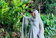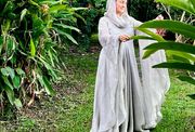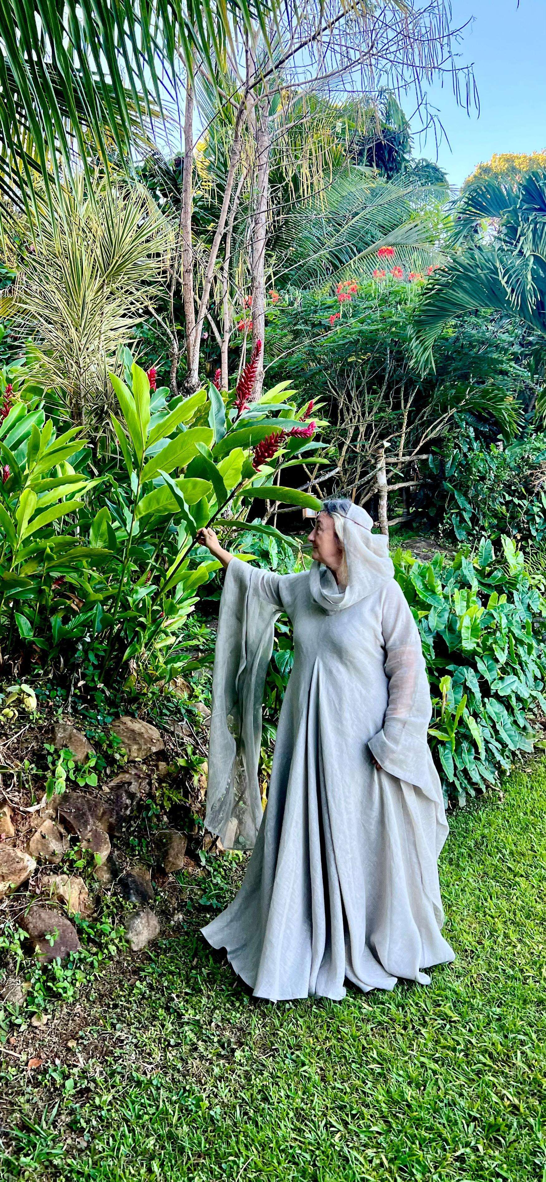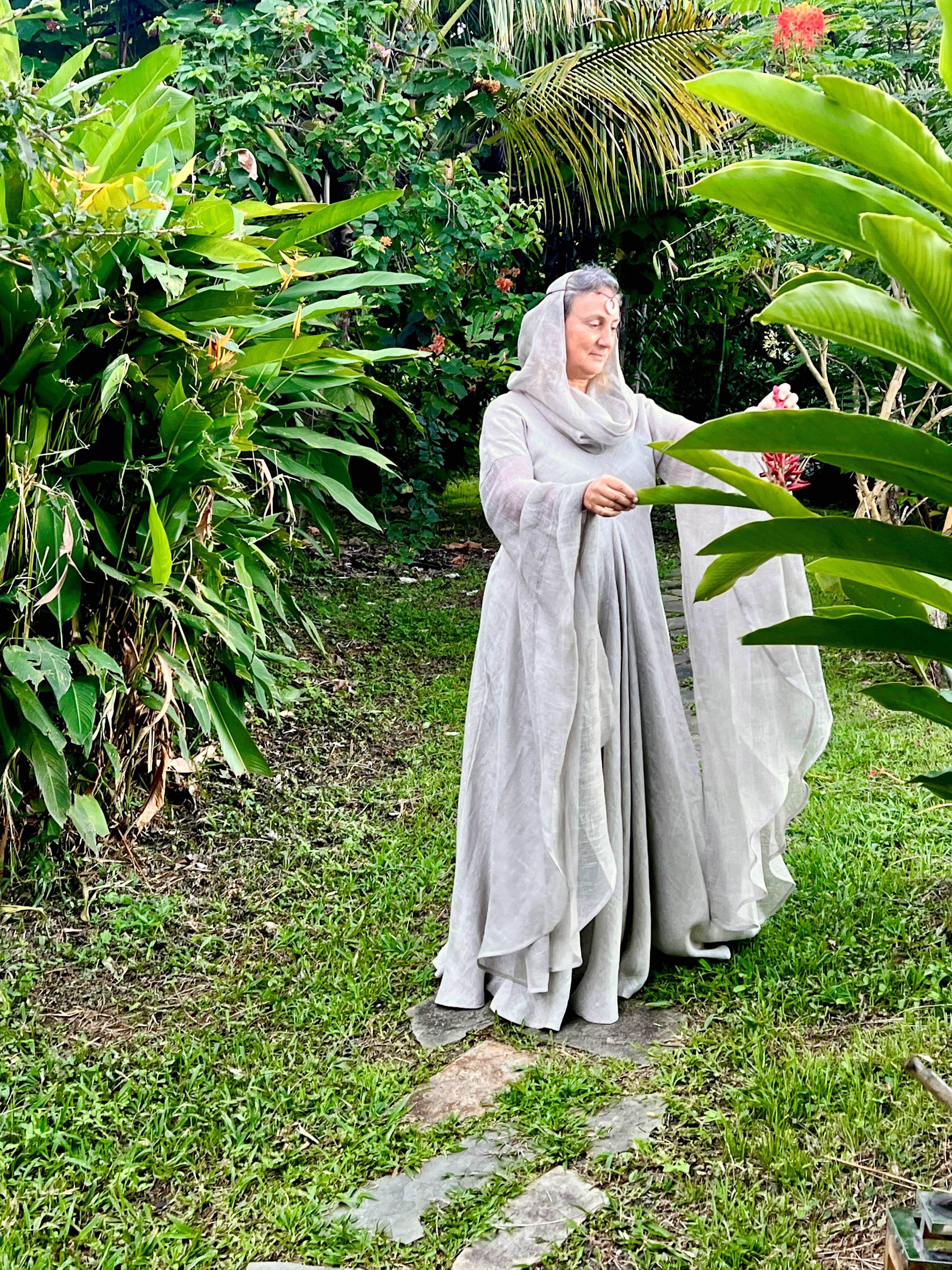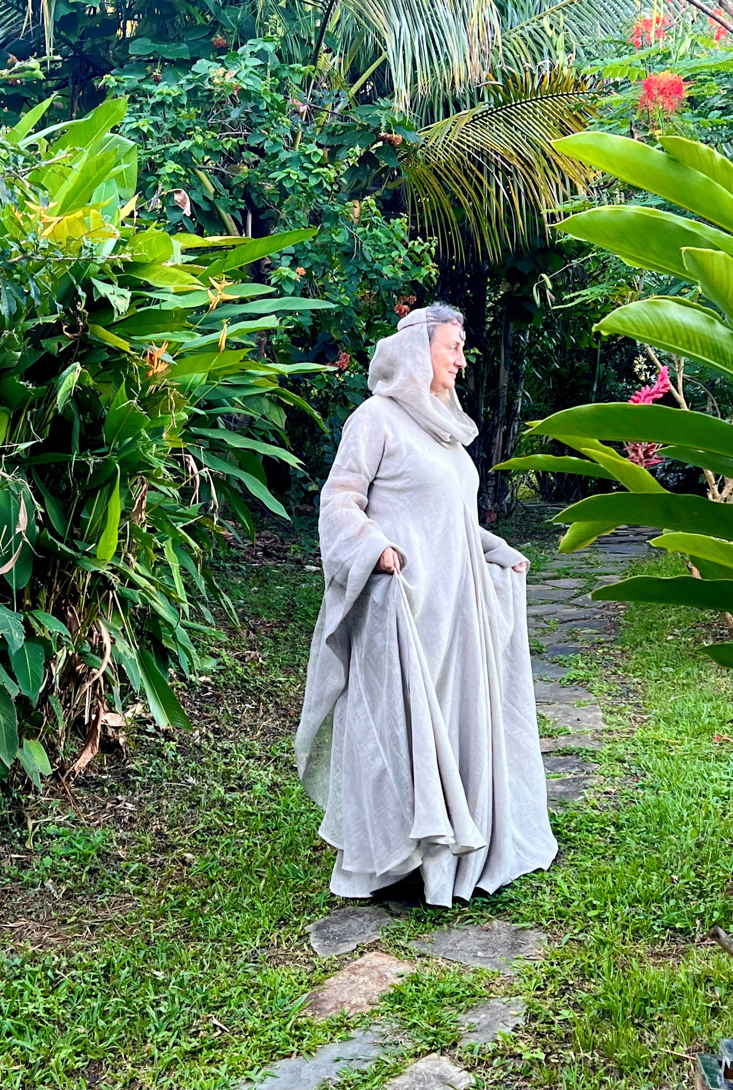 Je suis absolument conquise par cette magnifique robe !!! L'ampleur de tissu est incroyable et sa finesse la rend très agréable à porter malgré le climat tropical des Caraïbes. La longueur est beaucoup trop importante donc nous allons y remédier après un ou deux lavages.. Cela faisait plusieurs années que je voulais faire cet achat en attendant toujours de "maigrir" pour en être digne, mais à 52 ans j'ai décidé de ne pas attendre d'avoir une canne pour me faire plaisir et je ne le regrette pas du tout. La robe de par ses lignes magnifiques cache ce que l'on veut cacher et la longueur des manches sublimes allonge la silhouette. J'ai essayé cette magnifique tenue avec ma ceinture viking "Gudrun l'Héroique", et avec les bijoux et ceinture de la collection "Archère". Tous les accessoires sa marient très bien avec mais elle est si belle qu'elle se suffit aussi à elle-même. Je la porte avec la chemise en lin fin couleur naturelle "La Grâce" car elle est assez transparente. Pour info je fais 75kgs pour 1.62m donc plutôt rondelette :-). Un immense merci à Natacha qui a été d'une aide inestimable et a supporté mes angoisses vis a vis de la livraison vers ma petit île du bout du monde. Je n'oublie pas les merveilleux artisans d'Armstreet qui persévèrent malgré le fardeau qu'ils subissent. Mon coeur est avec eux chaque fois que j'effleure cette sublime tenue.