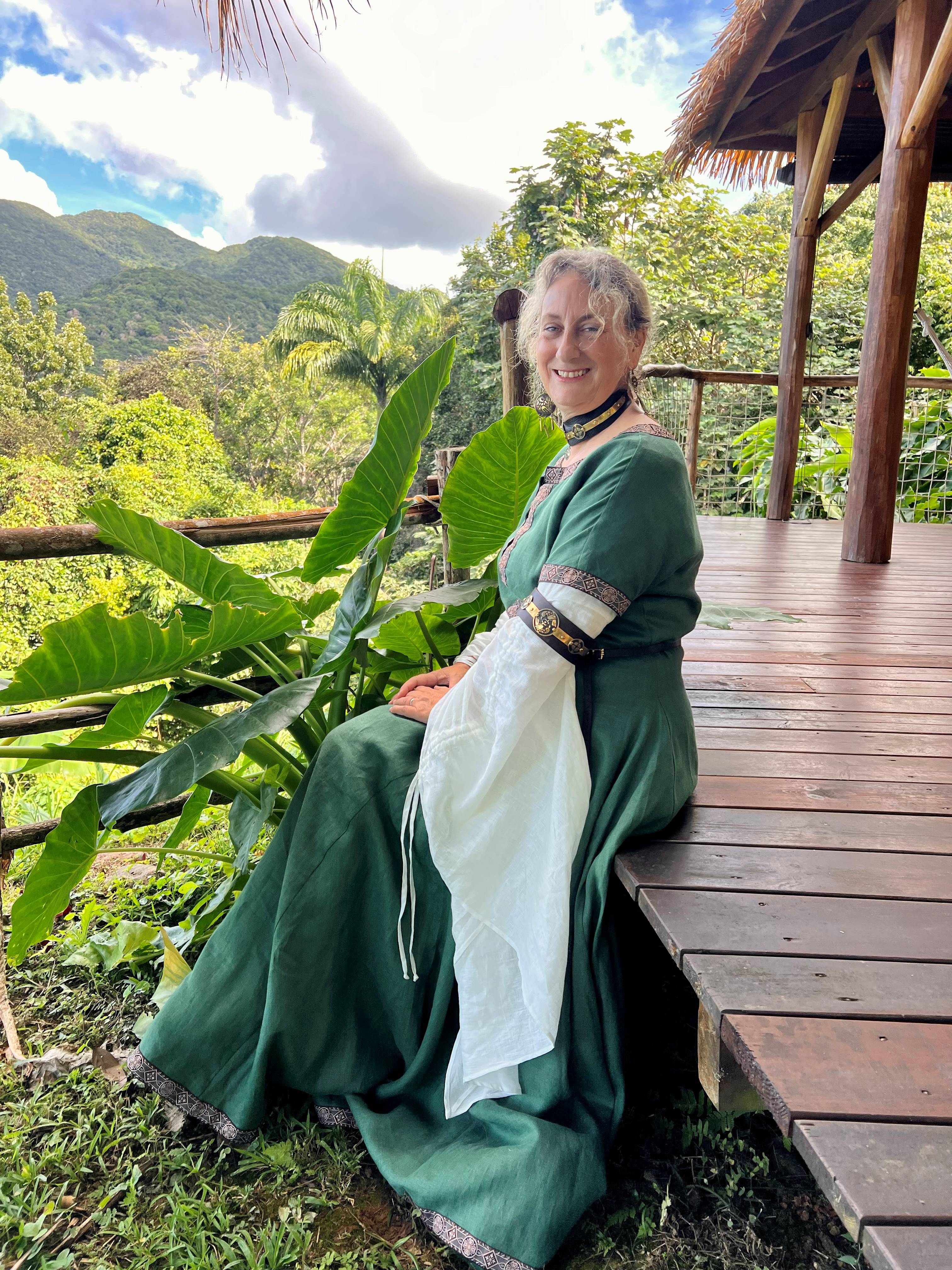 J'ai reçu mon magnifique ensemble de la collection Archère aujourd'hui et malgré l'attente pour recevoir mon colis (j'habite en Guadeloupe donc tous les colis prennent du temps) j'étais comme une enfant qui ouvre son cadeau de Noel. Que dire ?? tout est parfait !! les finitions sont absolument magnifiques, la robe est agréable à porter même sous notre climat tropical, et je suis enfin prête à jouer avec mon petit groupe de musique médiévale en portant mes propres vêtements. La robe et la chemise sont cependant bien trop longues mais il me semble avoir lu que le lavage fait rétrécir le lin, donc je verrais cela. Je tiens remercier Natacha et Nataliia pour leur aide précieuse et les échanges rapides même les jours de week-end et surtout toutes les personnes d'Armstreet en Ukraine qui font un travail remarquable. je fais 75kgs pour 1.62m et ai commandé mes robes en taille 8. La tunique est en vert avec le passement brun La ceinture Viking "corset de guerre Gudrun l'héroique" qui est également arrivée avec mes accessoires va très très bien avec l'ensemble Archères. Un immense merci à tous depuis les Caraibes.