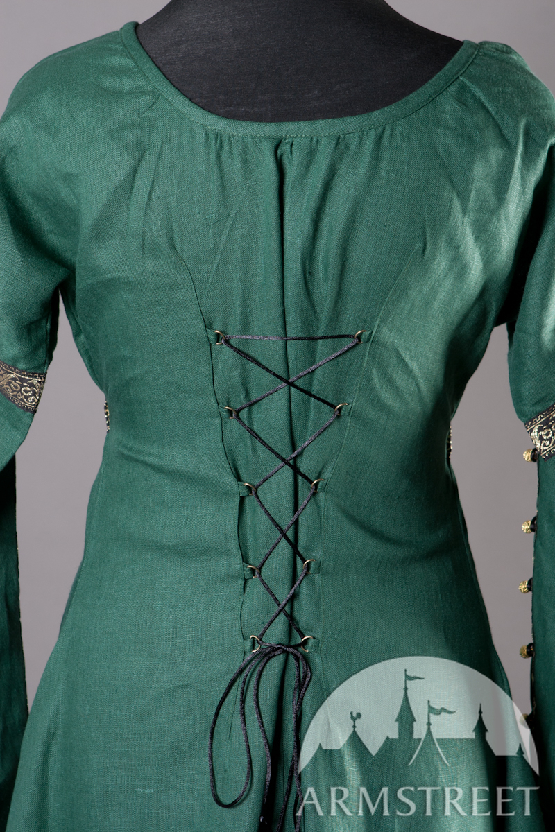 La robe présentée sur les photos est réalisée en lin vert qui s’allie parfaitement avec la verdure estivale. Le lin naturel dont la robe est fabriquée tient le corps sec et frais ainsi cette robe est indispensable pour votre garde-robe d’été. Pendant les températures chaudes on a toujours envie de se sentir décontracté et le tissu léger authentique de structure respirable est indispensable lorsque les degrés montent. Parmi les couleurs de lin disponibles nous avons les coloris naturels, vifs et sombres et la gamme de galons dorés ou argentés assortis permettent de rendre la tenue plutôt médiévale, fantastique ou gothique. Les contes de la forêt sont imprévisibles, au cas où vous auriez perdu le fil du temps – vous serez envoûté par une touche de la nature. Et là l’enchanteresse ne vous laissera pas abandonner sa forêt magique !