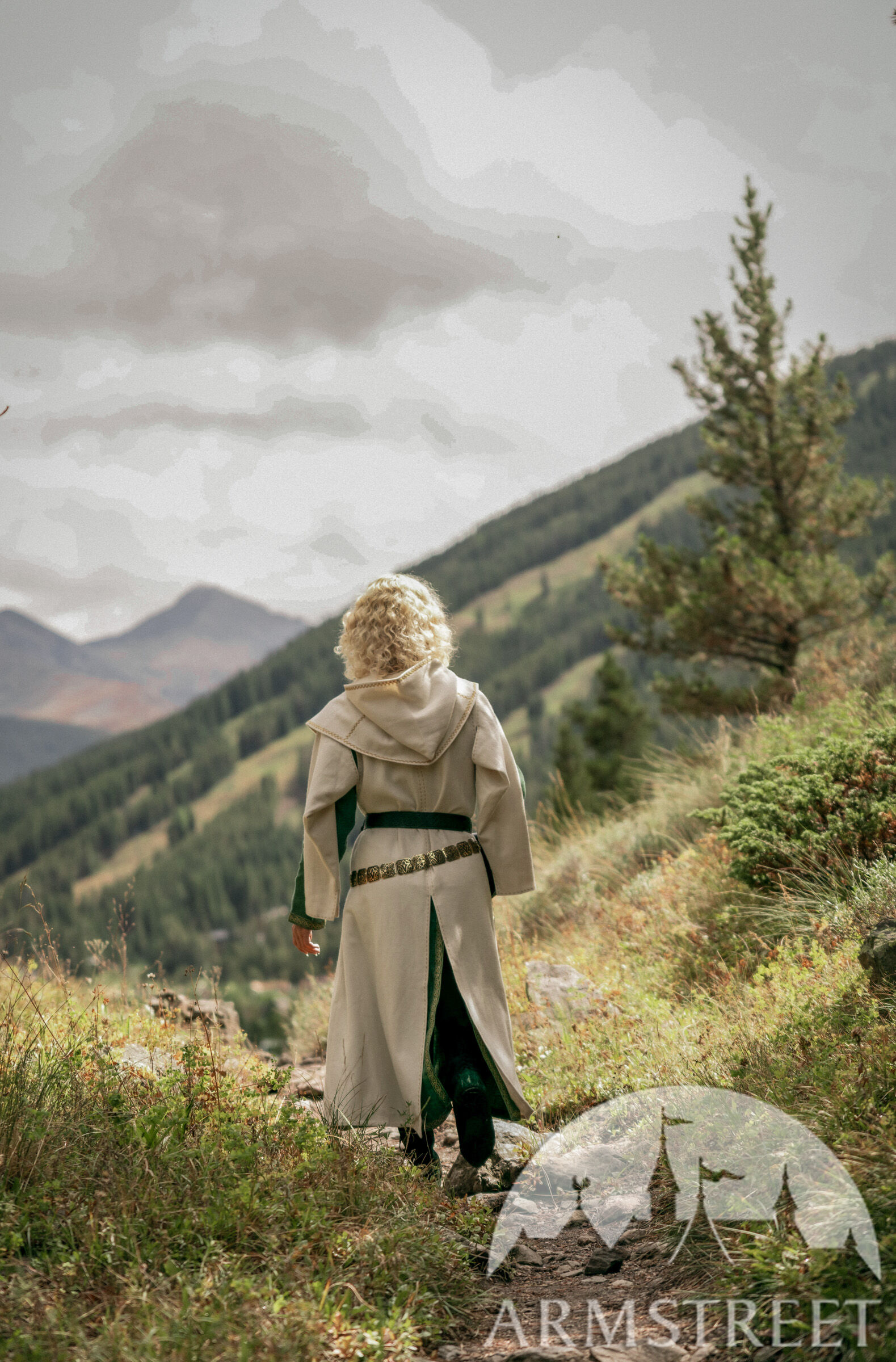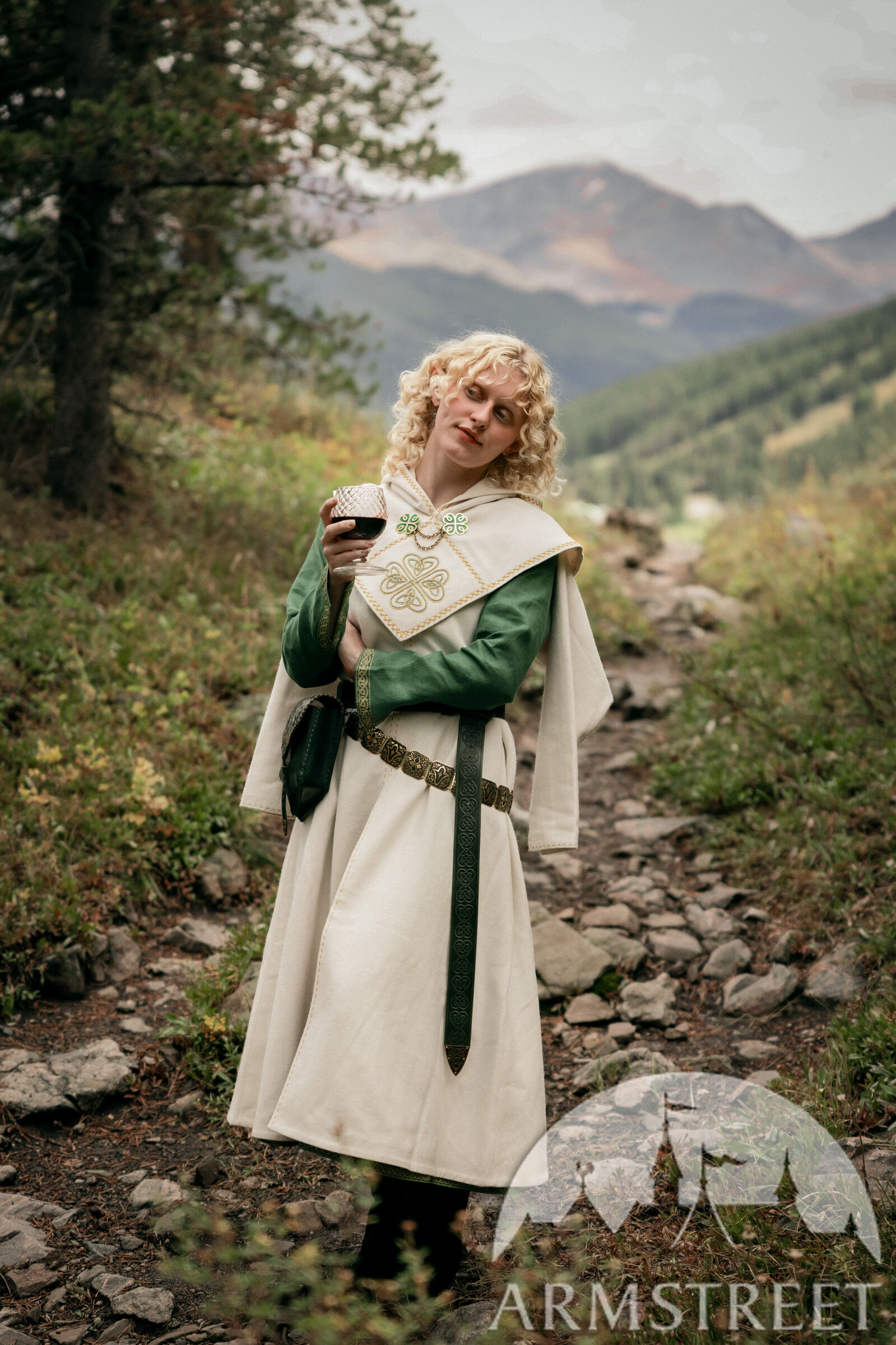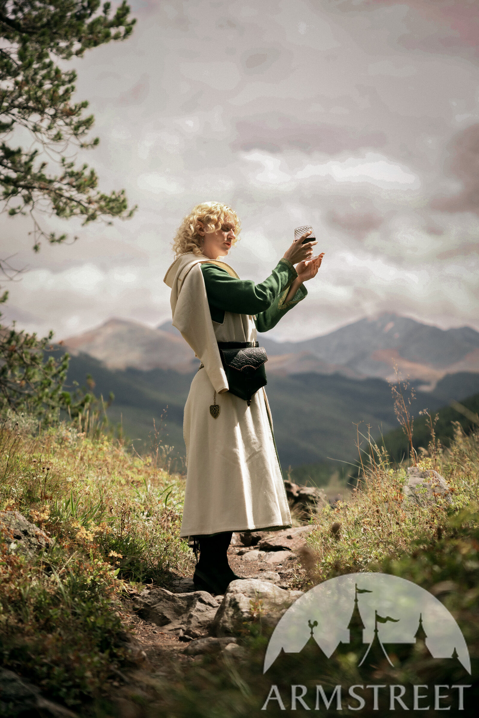 Ce modèle n'est pas un simple surcot. Confectionné en laine italienne de qualité supérieure, doux et fluide, il est doté de manches amovibles. Vous pouvez les porter comme des manches classiques ou les laisser pendre de vos épaules comme des ailes pour avoir les bras libres. À l'instar de notre tunique médiévale « Les Collines Creuses », il est doté de fentes d'aisance devant et derrière qui facilitent la course et la marche. Le vêtement est orné de surpiqûres dorées contrastantes le long de la fente centrale et des manches. Il possède un décolleté profond pour être plus confortable lorsqu'il est porté par-dessus un autre vêtement.
