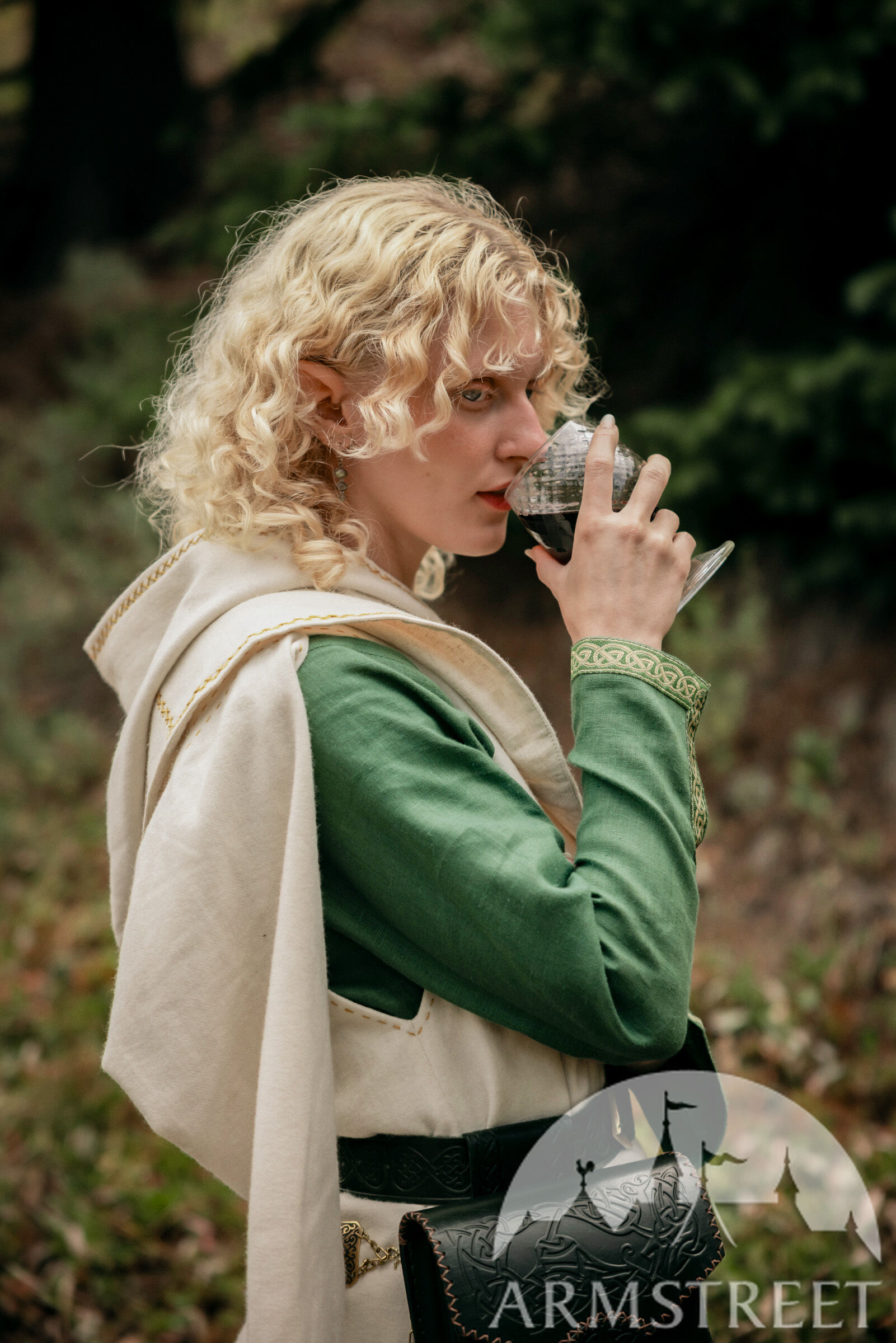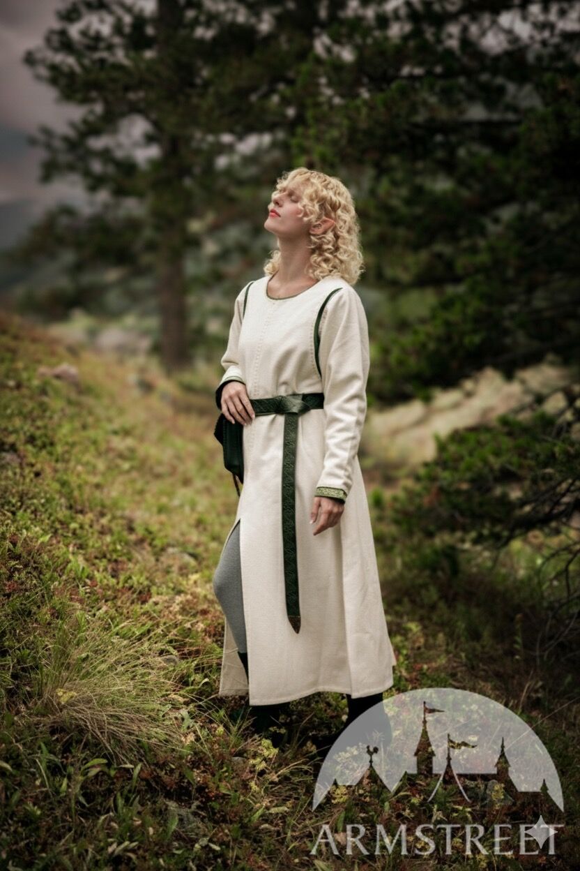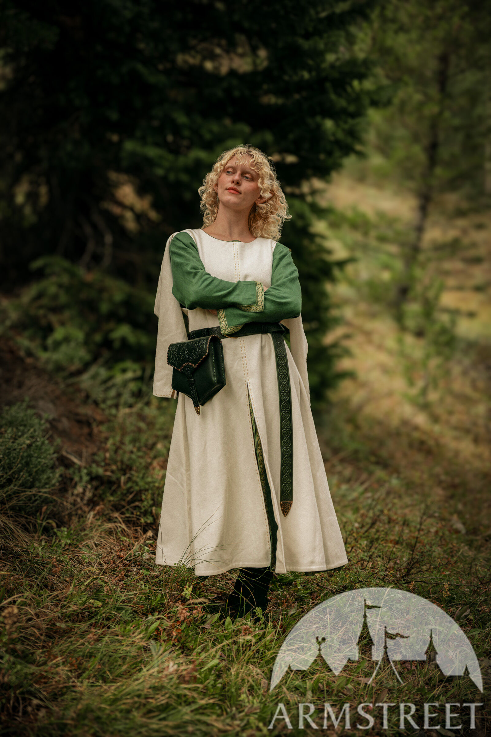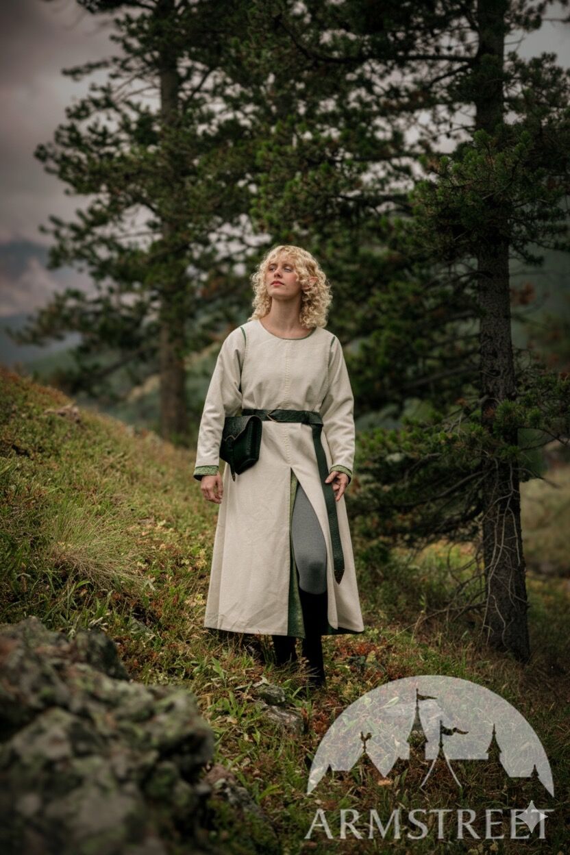 Ce modèle n'est pas un simple surcot. Confectionné en laine italienne de qualité supérieure, doux et fluide, il est doté de manches amovibles. Vous pouvez les porter comme des manches classiques ou les laisser pendre de vos épaules comme des ailes pour avoir les bras libres. À l'instar de notre tunique médiévale « Les Collines Creuses », il est doté de fentes d'aisance devant et derrière qui facilitent la course et la marche. Le vêtement est orné de surpiqûres dorées contrastantes le long de la fente centrale et des manches. Il possède un décolleté profond pour être plus confortable lorsqu'il est porté par-dessus un autre vêtement.