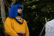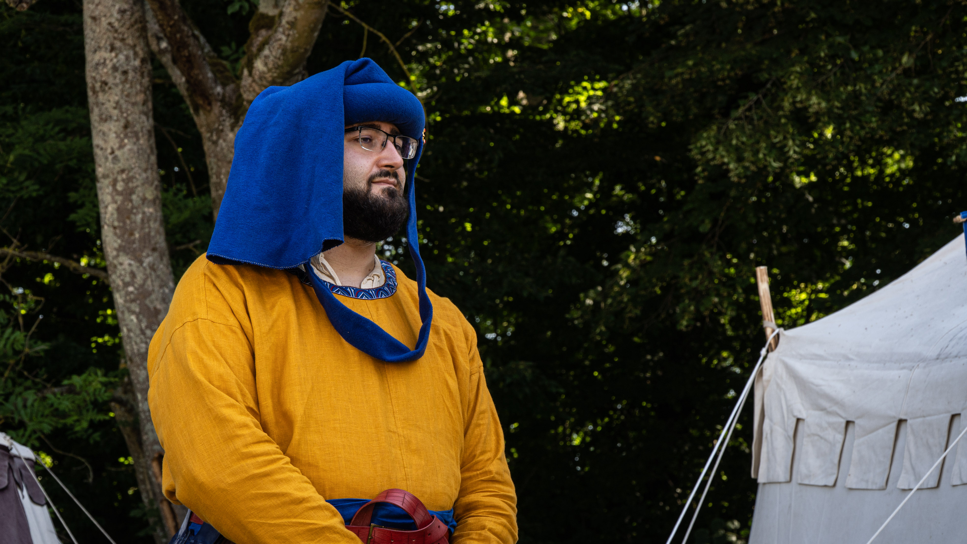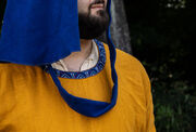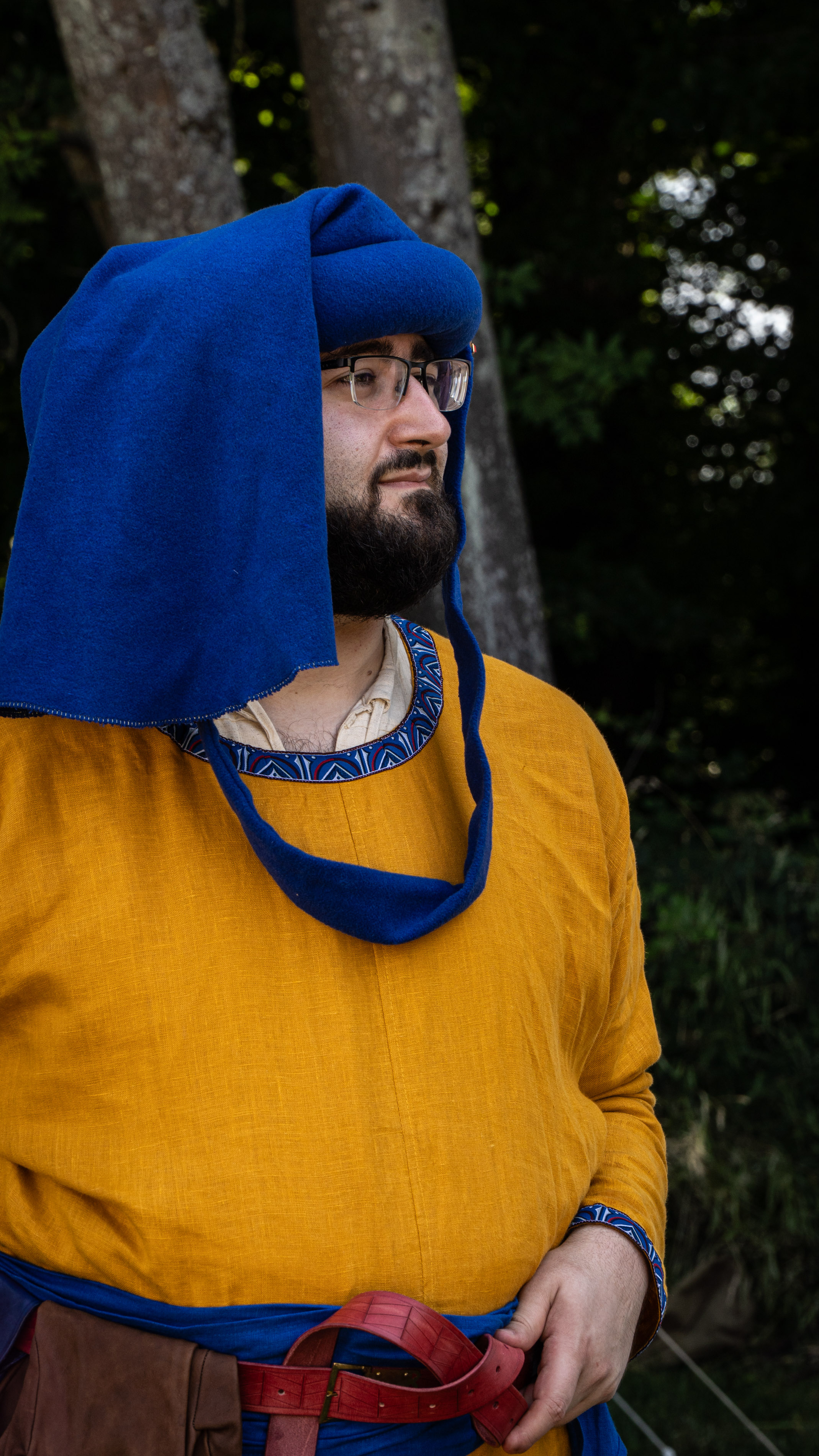 Ce type de tunique était très répandu dans les textes historiques et était portée majoritairement par des gens de statut supérieur à cause de sa longueur. Les matériaux étaient très chers et les métiers à tisser étaient beaucoup plus cours que ceux d’aujourd’hui par conséquent les habits longs nécessitaient des dessins plus complexes et beaucoup plus de temps à fabriquer que les habits plus courts. L’utilisation frivole du tissu était assez courante au XIV siècle où les gens aisés allaient jusqu’à suspendre tout simplement du tissu sur les manches pour faire voir à quel point ils pouvaient gaspiller le tissu ! Alors nous imaginons que cette tunique sera portée par un représentant d’un milieu moyen : un marchand ou un noble voyageant.