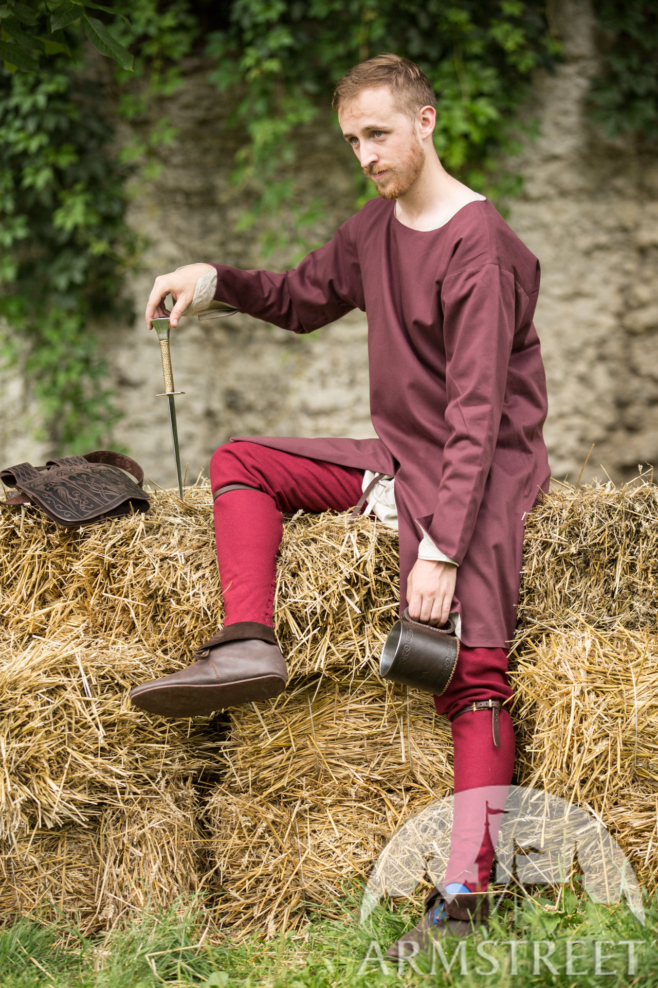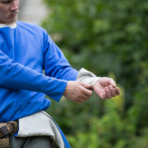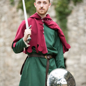 La couche inférieure de la tunique est fabriquée en lin fin blanc ou naturel, extrêmement agréable au toucher. Le lin est le tissu respirant, parfait pour tous les saisons et qui s'adoucit avec le temps. La couche extérieure est faite en coton naturel, le matériau solide et résistant, parfait pour porter par-dessous un gambison, une cotte de maille ou des armures en plaques. La tunique peut facilement supporter toutes les rigueurs de la vie quotidienne médiévale, ainsi que le combat intense et tout type d’aventure. Même si vous envisagez de la porter/laver chaque jour, les deux matériaux dont la tunique est confectionnée le supporteront bien. Plus tard, son aspect authentique vieilli ne gâchera guère votre look.