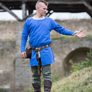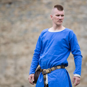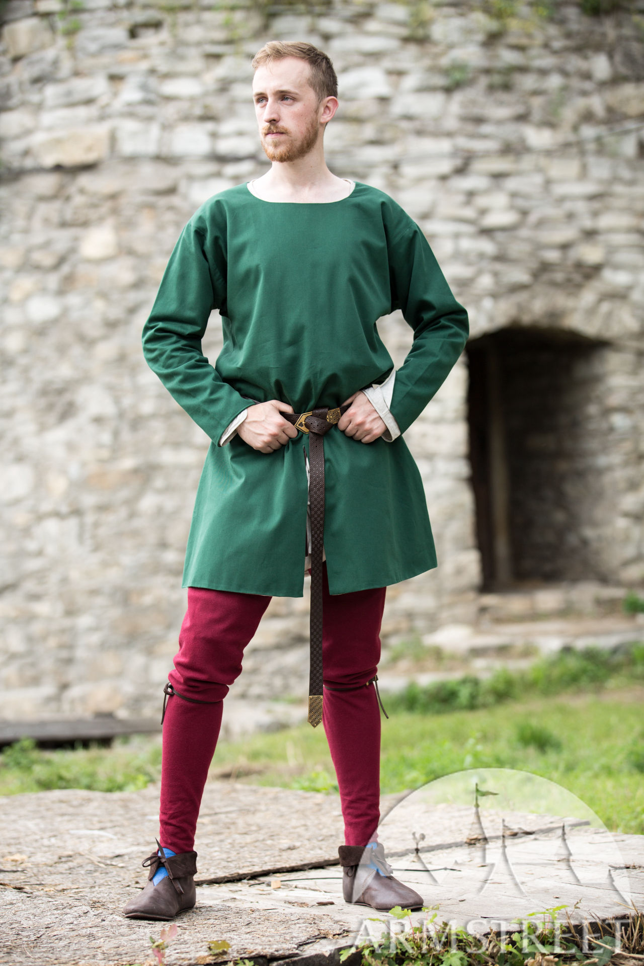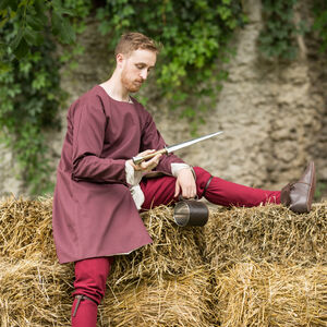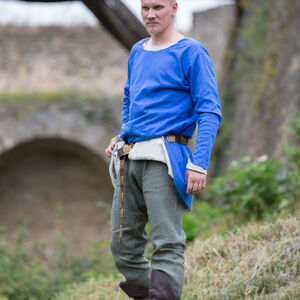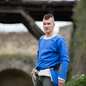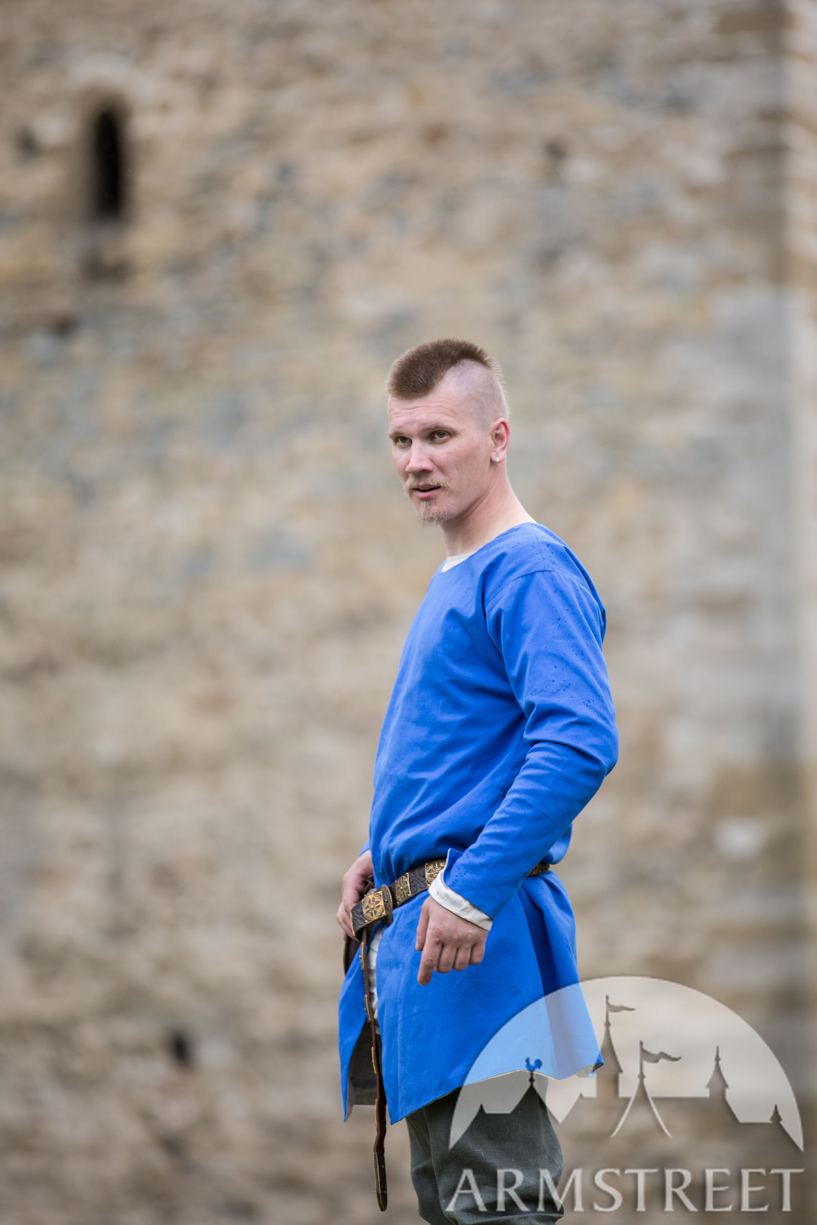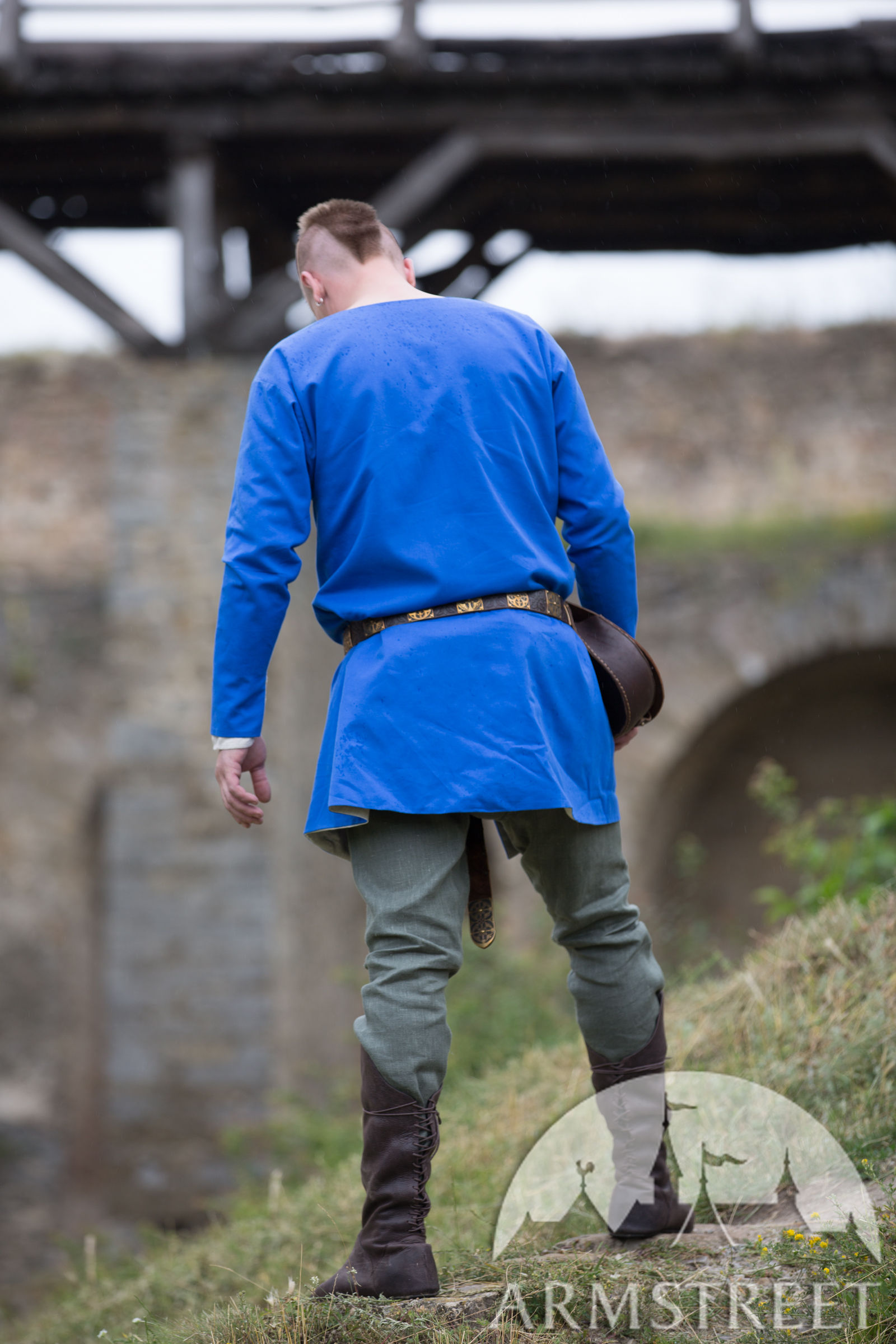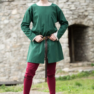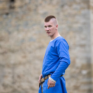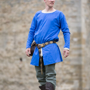 La tunique est faite en forme de T, elle a une coupe fluide type cloche à partir de la taille. C’est très typique pour les vêtements de l'époque, et en plus assure la liberté de mouvement. Son encolure est large et arrondie, les manches se resserrent vers le bas. Il y a une fente devant pour faciliter la marche et l’équitation. Vous pouvez sans souci la rentrer dans le pantalon. Bref, c’est super facile à porter – on dirait un T-shirt médiéval.