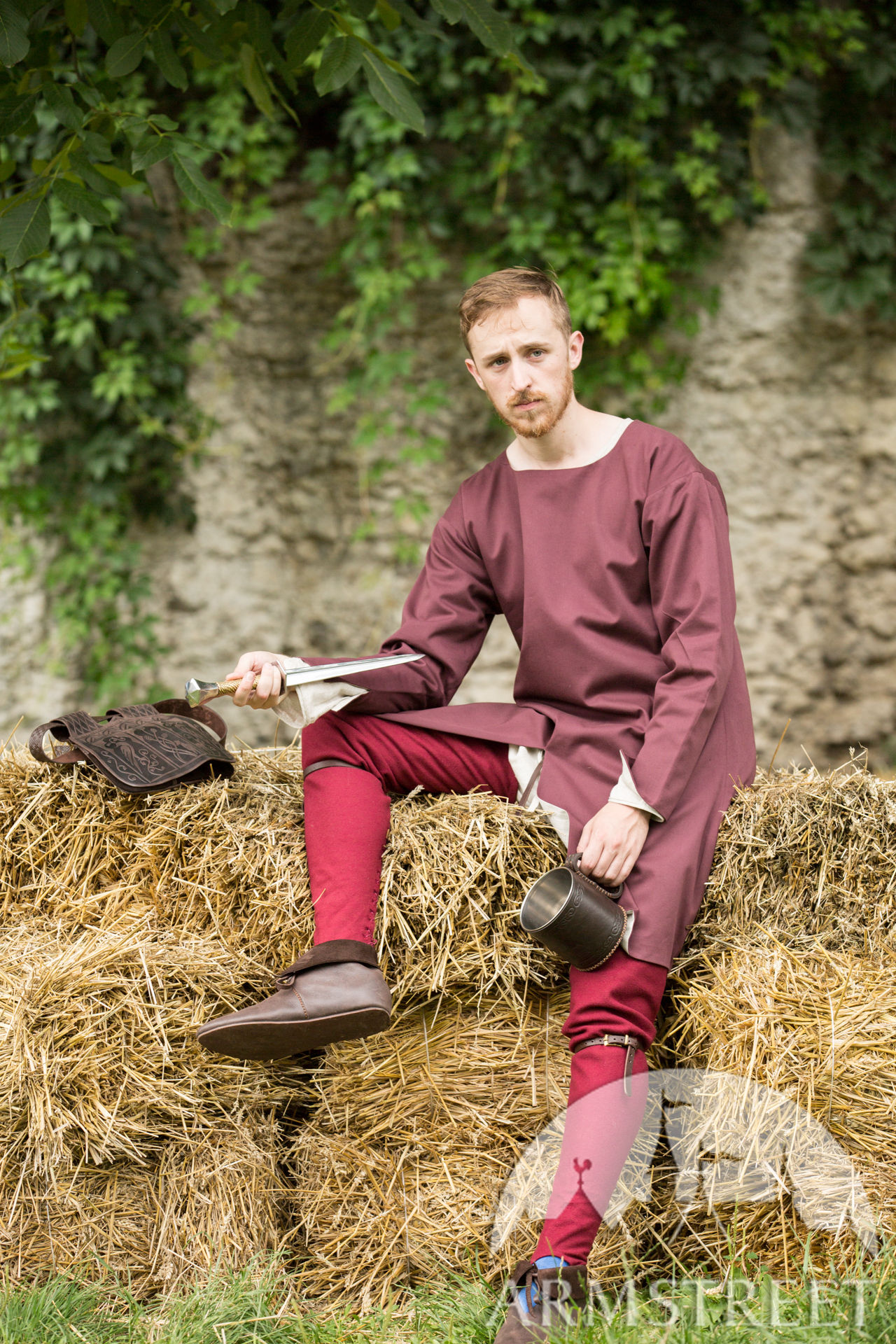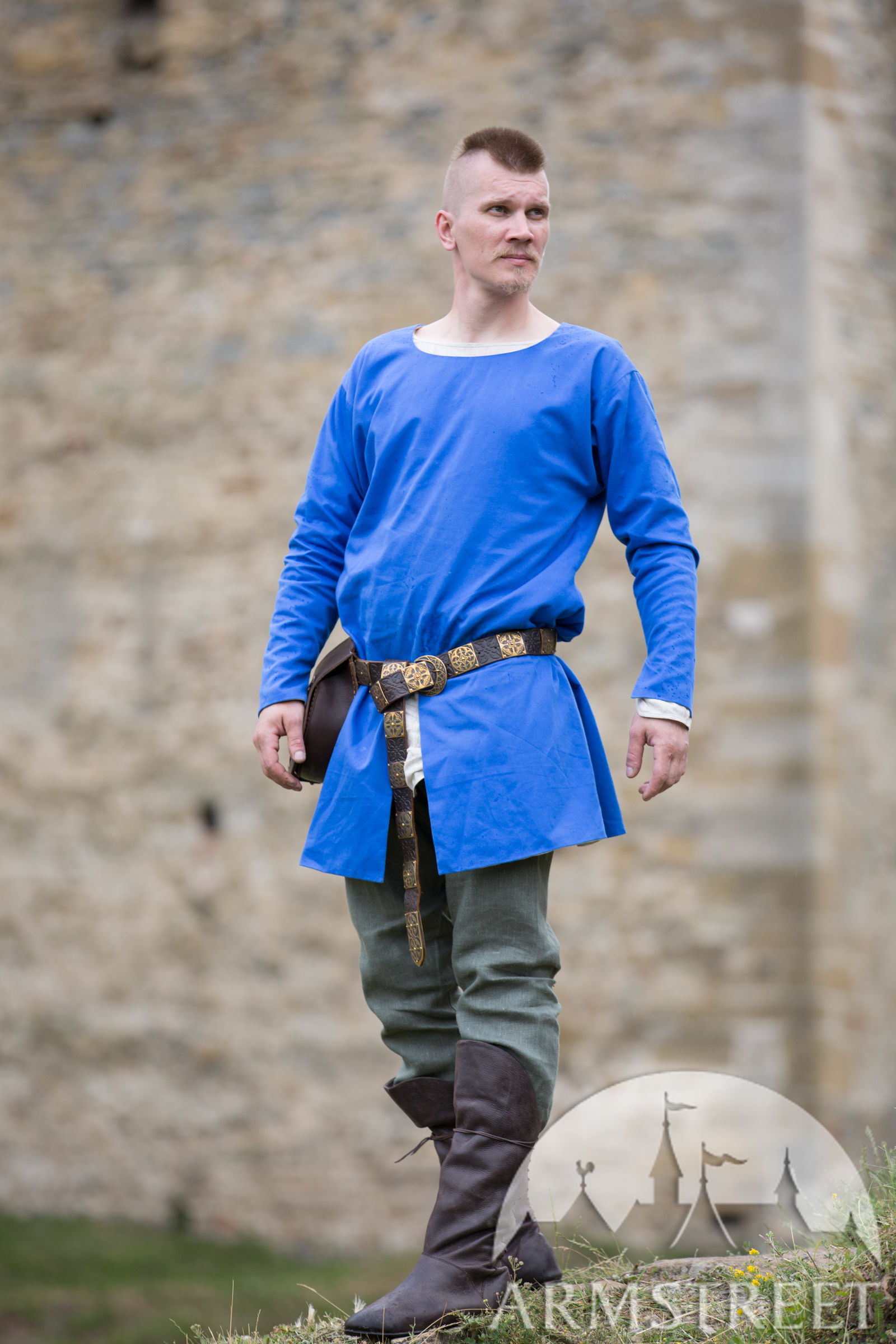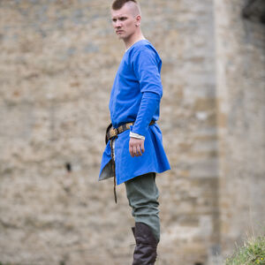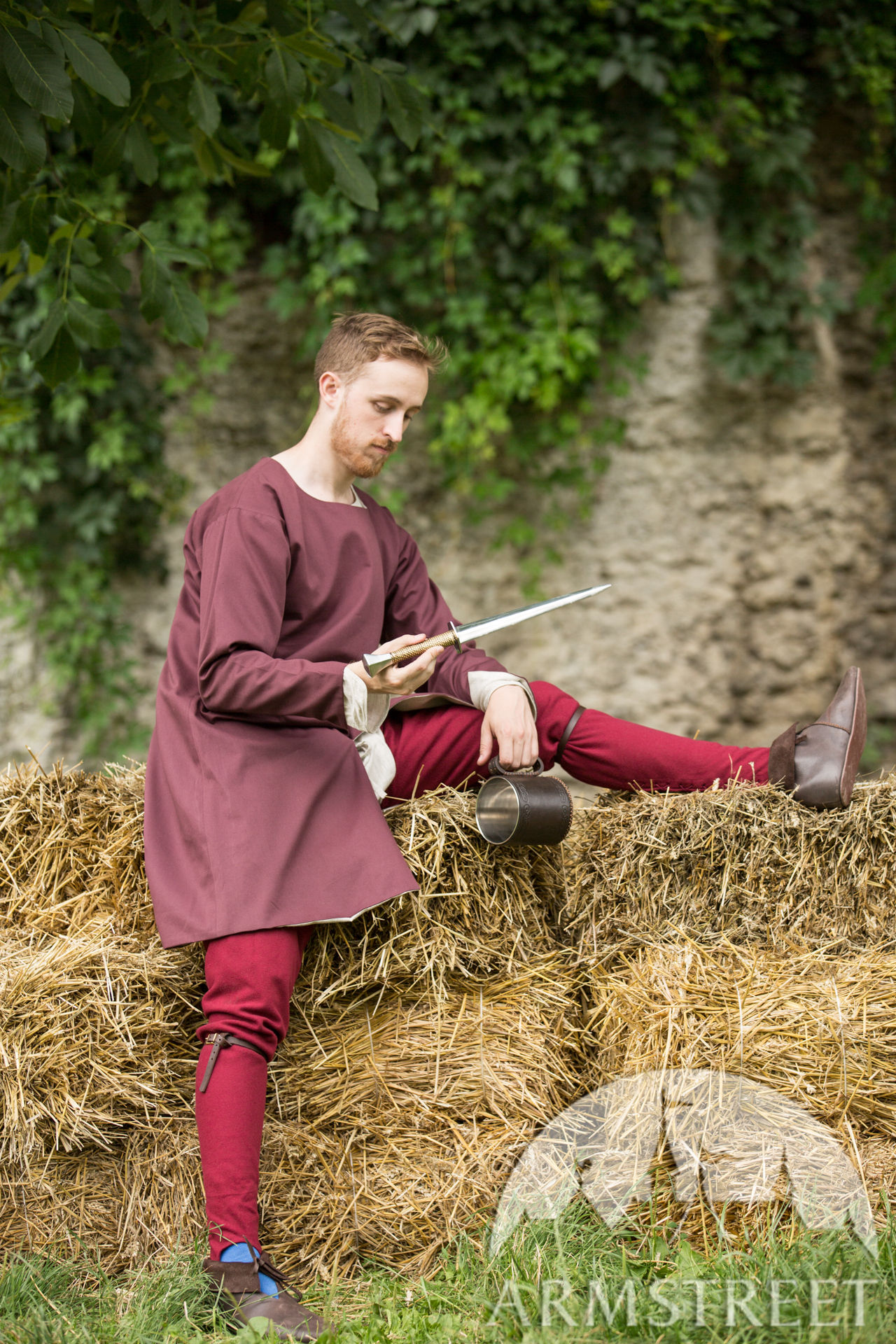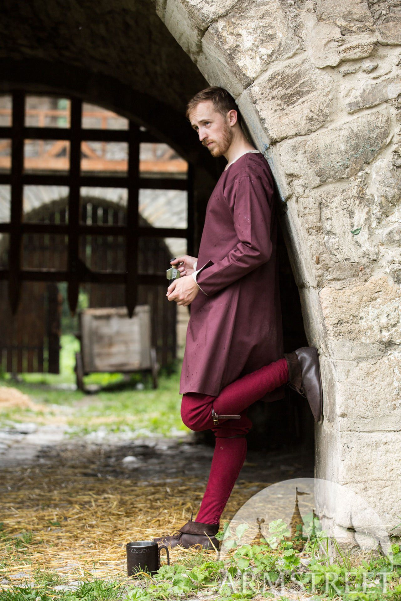 La tunique est faite en forme de T, elle a une coupe fluide type cloche à partir de la taille. C’est très typique pour les vêtements de l'époque, et en plus assure la liberté de mouvement. Son encolure est large et arrondie, les manches se resserrent vers le bas. Il y a une fente devant pour faciliter la marche et l’équitation. Vous pouvez sans souci la rentrer dans le pantalon. Bref, c’est super facile à porter – on dirait un T-shirt médiéval.