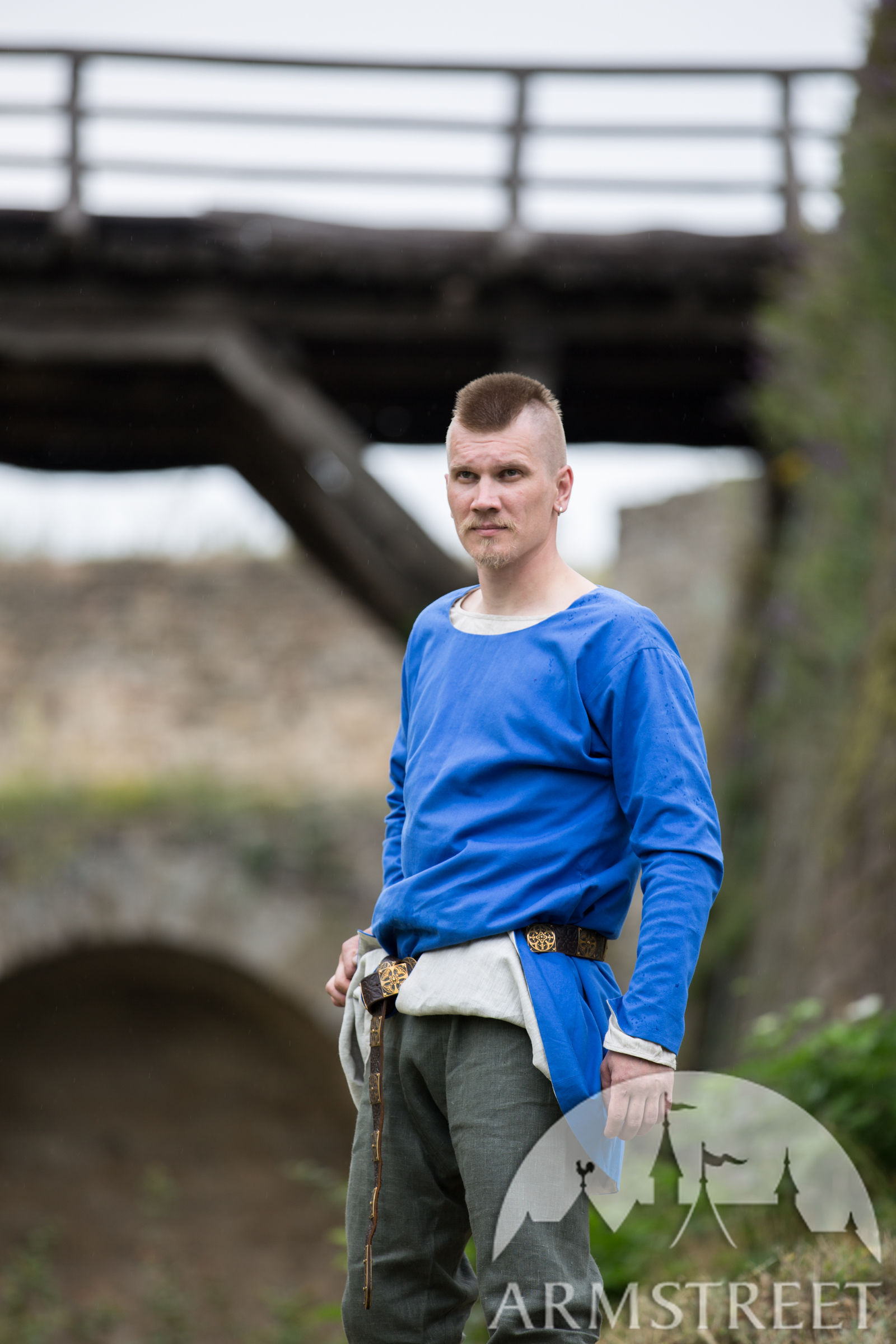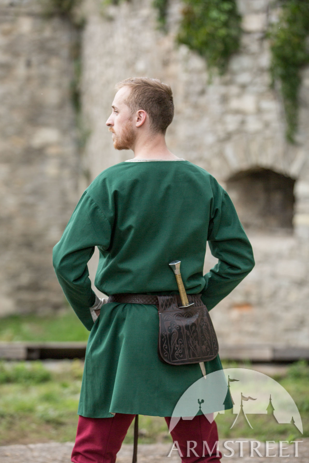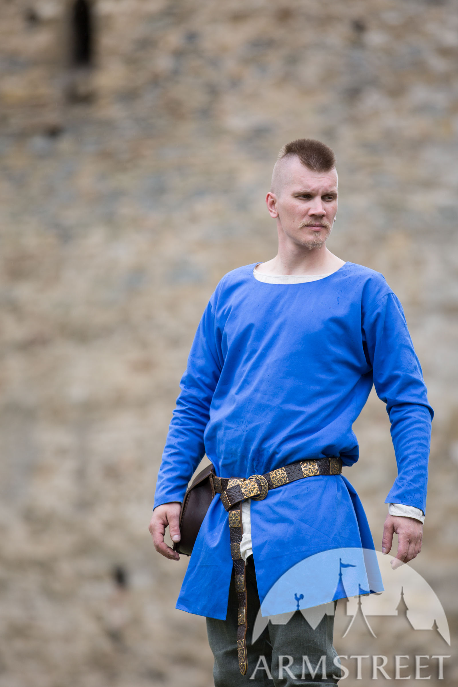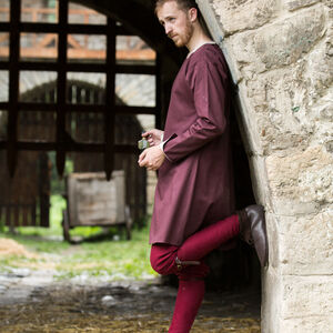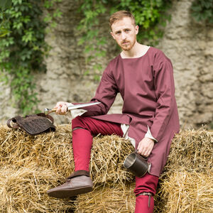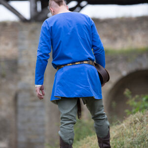 La tunique est faite en forme de T, elle a une coupe fluide type cloche à partir de la taille. C’est très typique pour les vêtements de l'époque, et en plus assure la liberté de mouvement. Son encolure est large et arrondie, les manches se resserrent vers le bas. Il y a une fente devant pour faciliter la marche et l’équitation. Vous pouvez sans souci la rentrer dans le pantalon. Bref, c’est super facile à porter – on dirait un T-shirt médiéval.