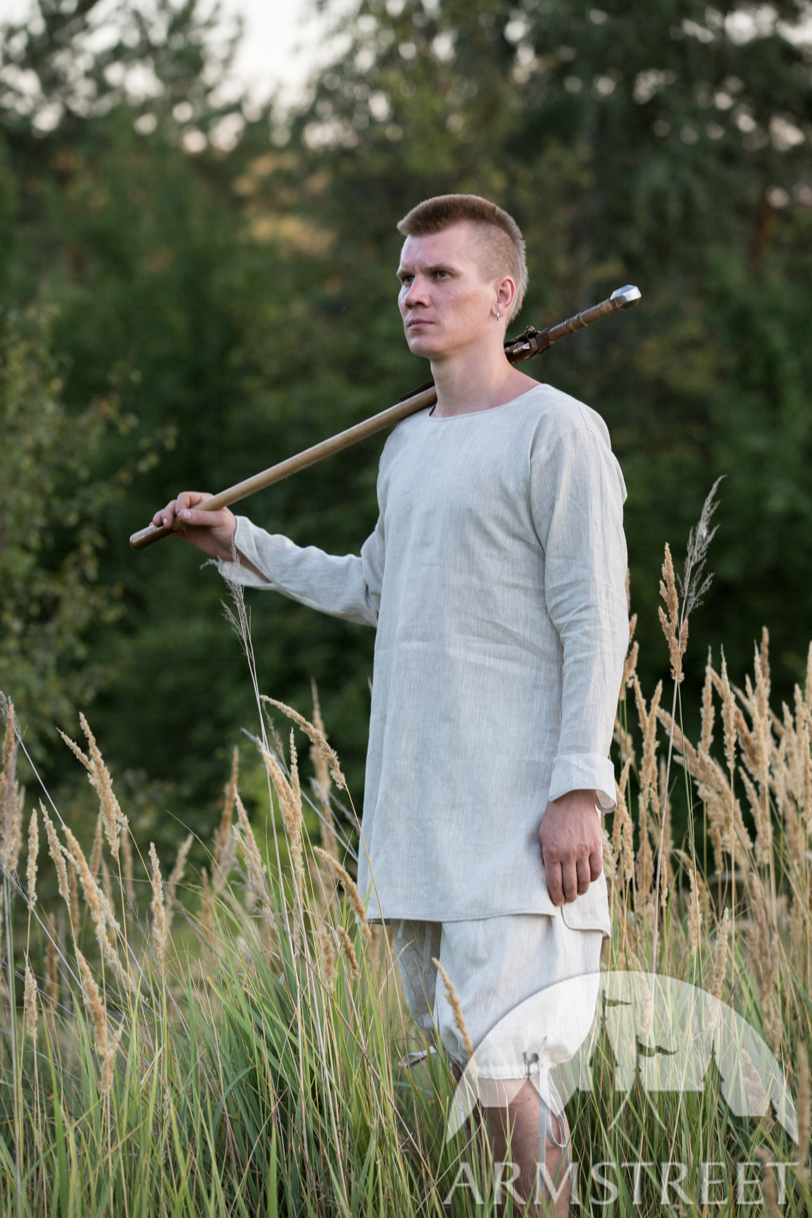 Cette tunique de tissu fin respirant est sans exagération une merveille. Nous avons créé une véritable sous-tunique médiévale aussi simple qu'un t-shirt moderne. Adaptée aux hommes et aux femmes, cette tunique droite est coupée selon le motif d'un sous-vêtement du XIIe siècle, qui aurait été porté sous le vêtement principal ou pour dormir.