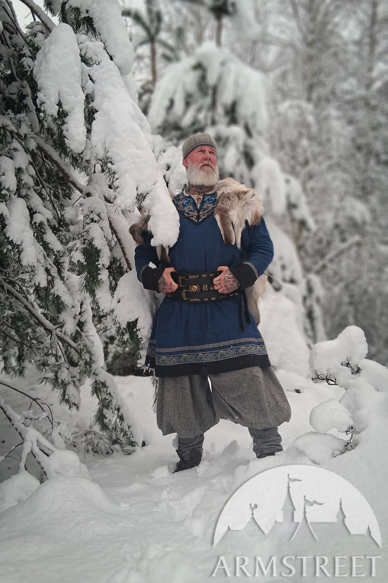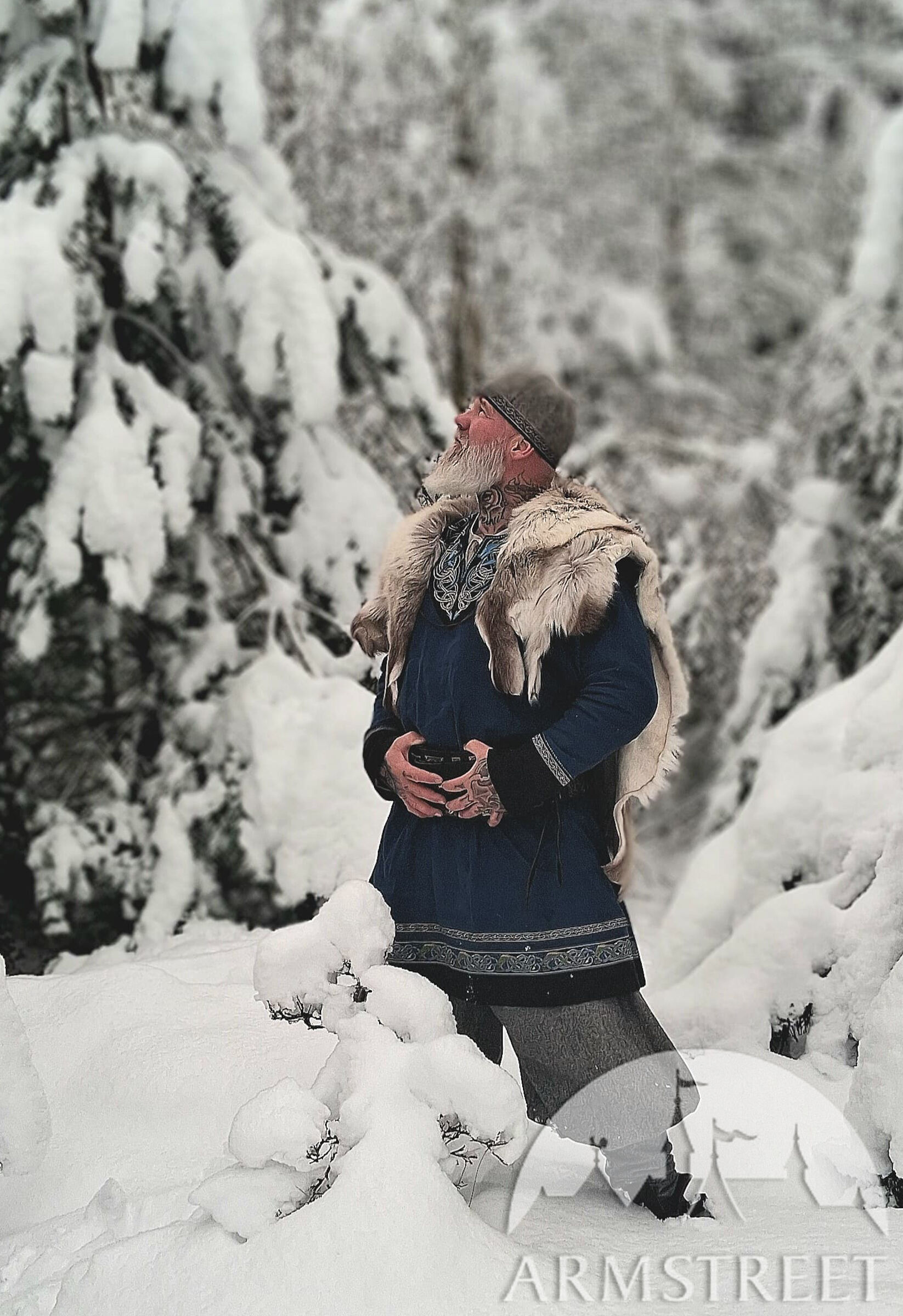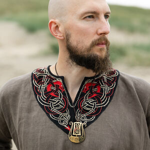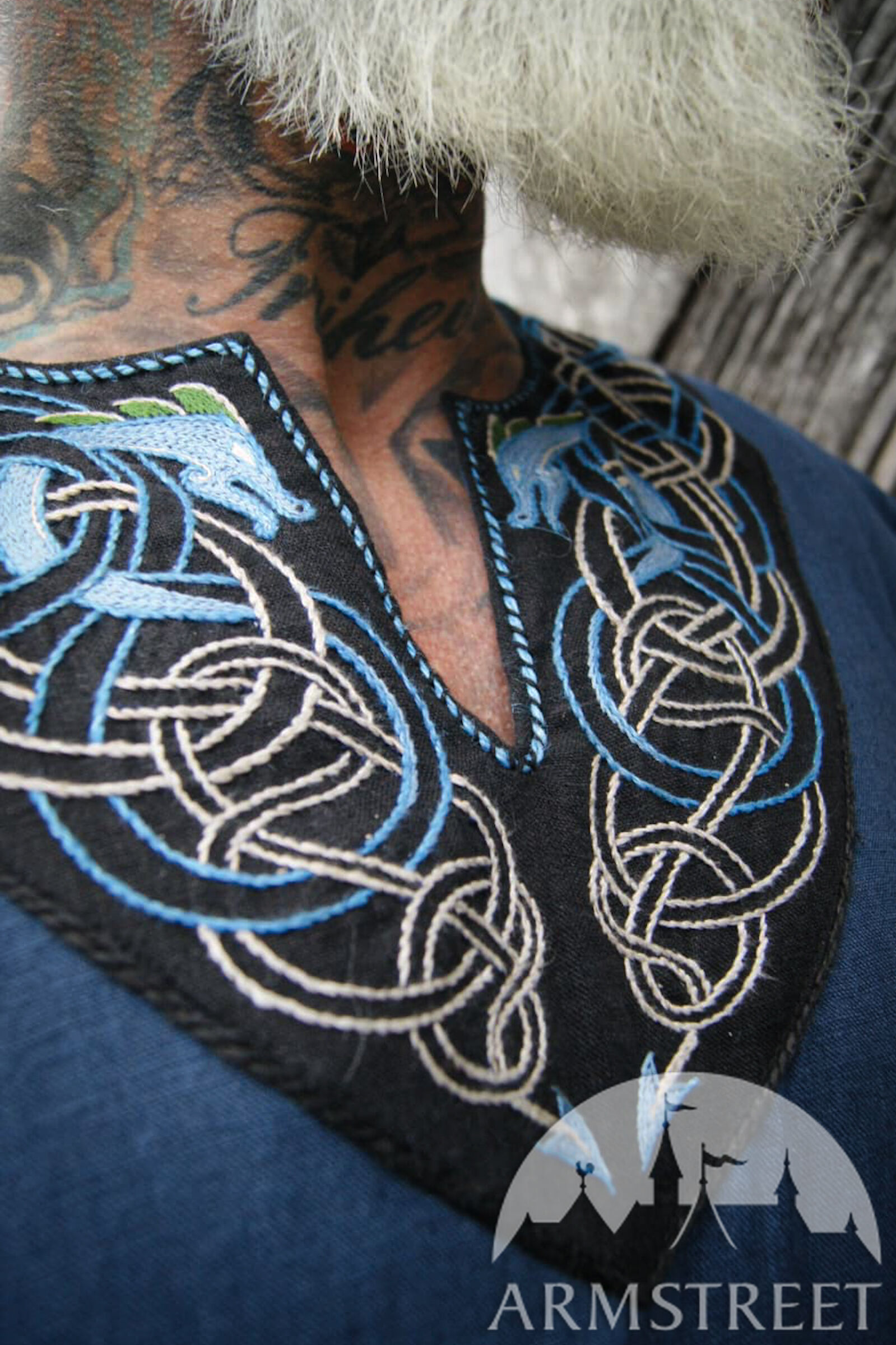 Comme beaucoup de peuples anciens, les Vikings considéraient également les vêtements comme ayant une signification particulière. Ils considéraient la gorge de l’humain comme une partie cruciale du corps, car ils croyaient que c’était là que l’âme partait lorsqu’une personne décédait. C’est pourquoi les Vikings accordaient une attention particulière à la décoration de l’encolure de leurs vêtements. Suivant cette tradition, nous avons orné l’encolure de cette tunique de broderies faites à la main. Ce type de finition reproduit les techniques utilisées autrefois, notamment le style de broderie normande. Même si cela nécessite beaucoup d’efforts, le résultat est impressionnant et authentique : les créatures mythiques protègent votre cou à l’avant comme à l’arrière. Les dragons brodés sur l’encolure complètent le motif de la bordure. L’ensemble du décolleté et du bord des manchettes sont finis à la main avec un fil épais qui s’enroule autour de la corde en petits points, ne laissant aucune chance aux mauvais esprits de s’approcher de vous.