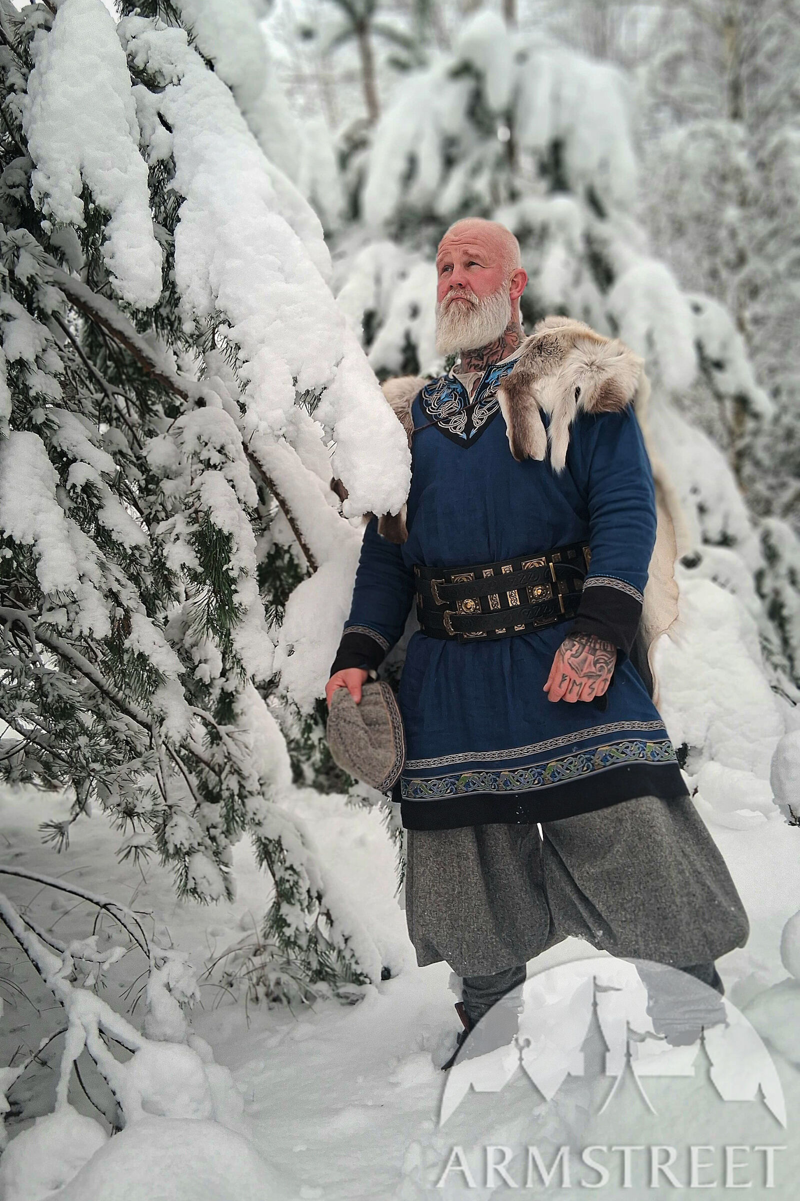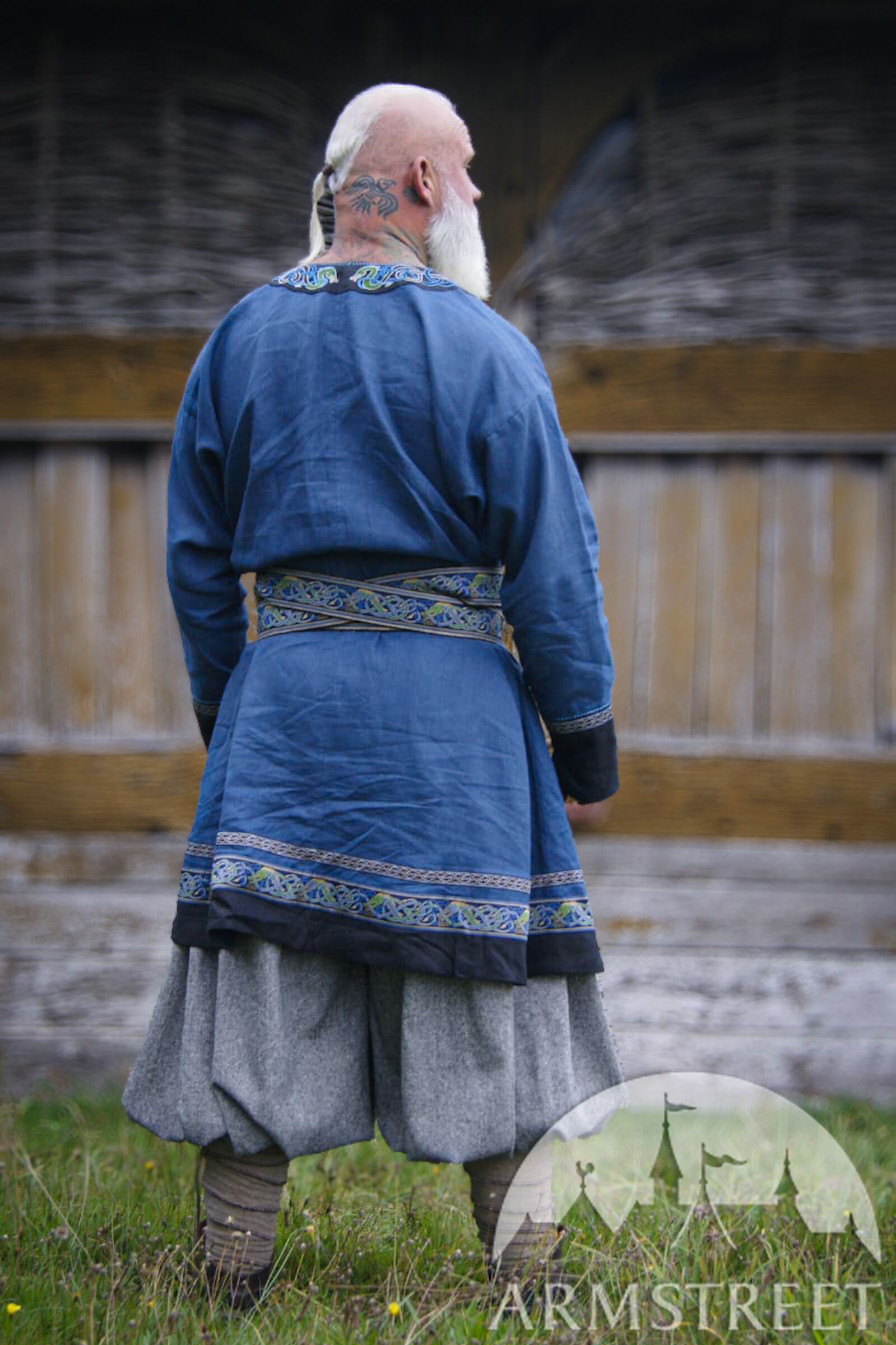 Notre collection « Viking » ne cesse de s’agrandir, avec des vêtements de style plus authentique du début du Moyen Âge. Cette tunique brodée exclusive est confectionnée en lin naturel de haute qualité. Les manches, l’ourlet et l’encolure de la tunique sont ornés de lin contrasté, de passement et de minuscules détails qui, ensemble, créent un chef-d’œuvre textural et visuel multidimensionnel et complexe. Le motif décoratif représente des dragons courants dans les mythes scandinaves. Ce passement unique a été spécialement conçu et fabriqué exclusivement pour notre collection « Viking ». La conception de la tunique est historiquement exacte et est basée sur les découvertes faites lors de fouilles à Birka, en Suède.