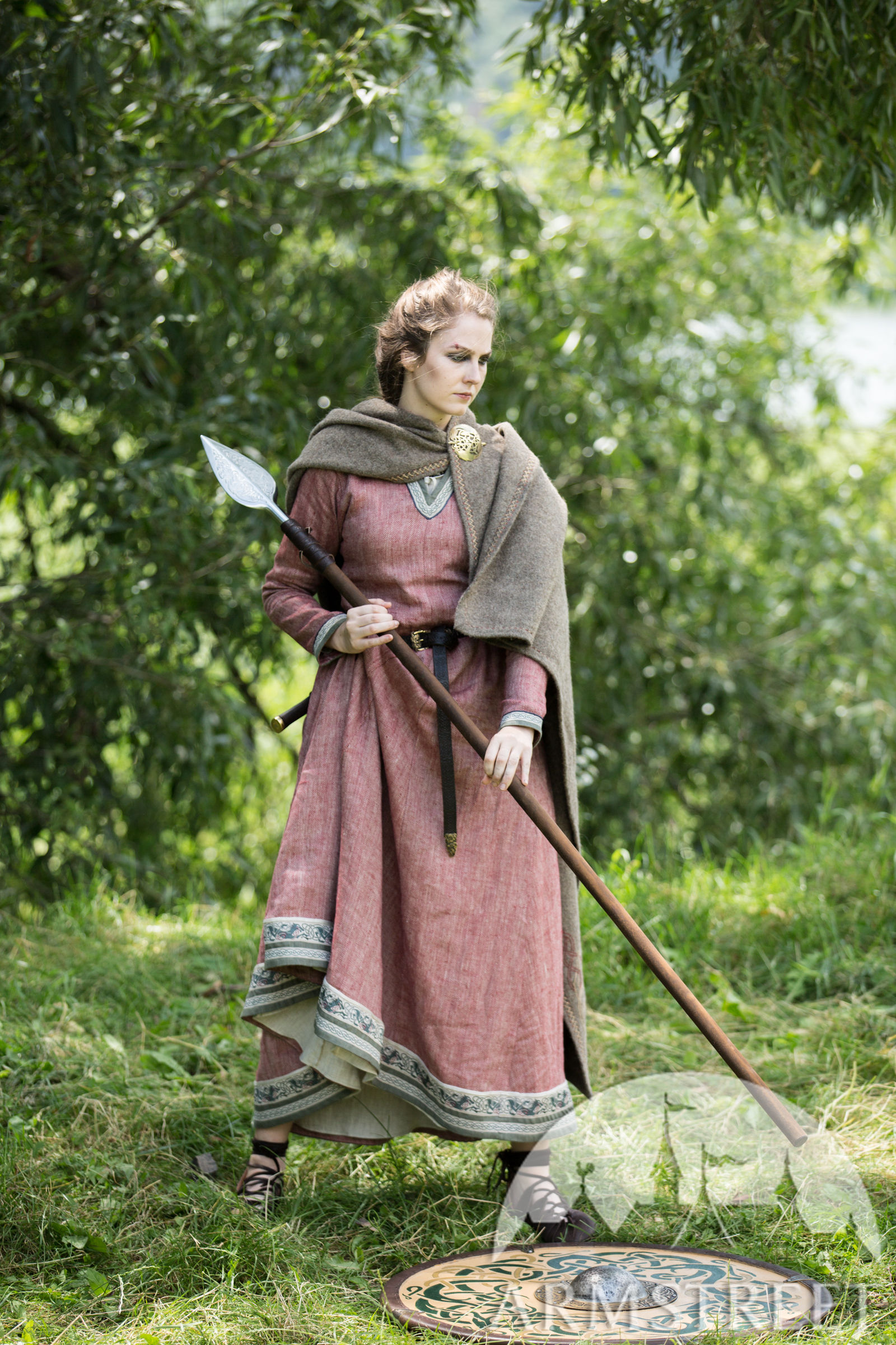 Féminine, expressive, pratique, c’est la meilleure robe pour discerner une skjaldmö qui cherche à se distinguer au-delà du  mur de boucliers. Historiquement les dessins sur les vêtements vikings des femmes ne se diffèrent pas beaucoup de ceux des hommes, cela veut dire que les robes vikings étaient généralement plus amples que les tenues ajustées qu’on trouve plus tard dans l’histoire. Cette robe frôle votre corps créant ainsi une silhouette flatteuse permettant en même temps une marge de mouvements considérable pour camper, courir et même combattre !
